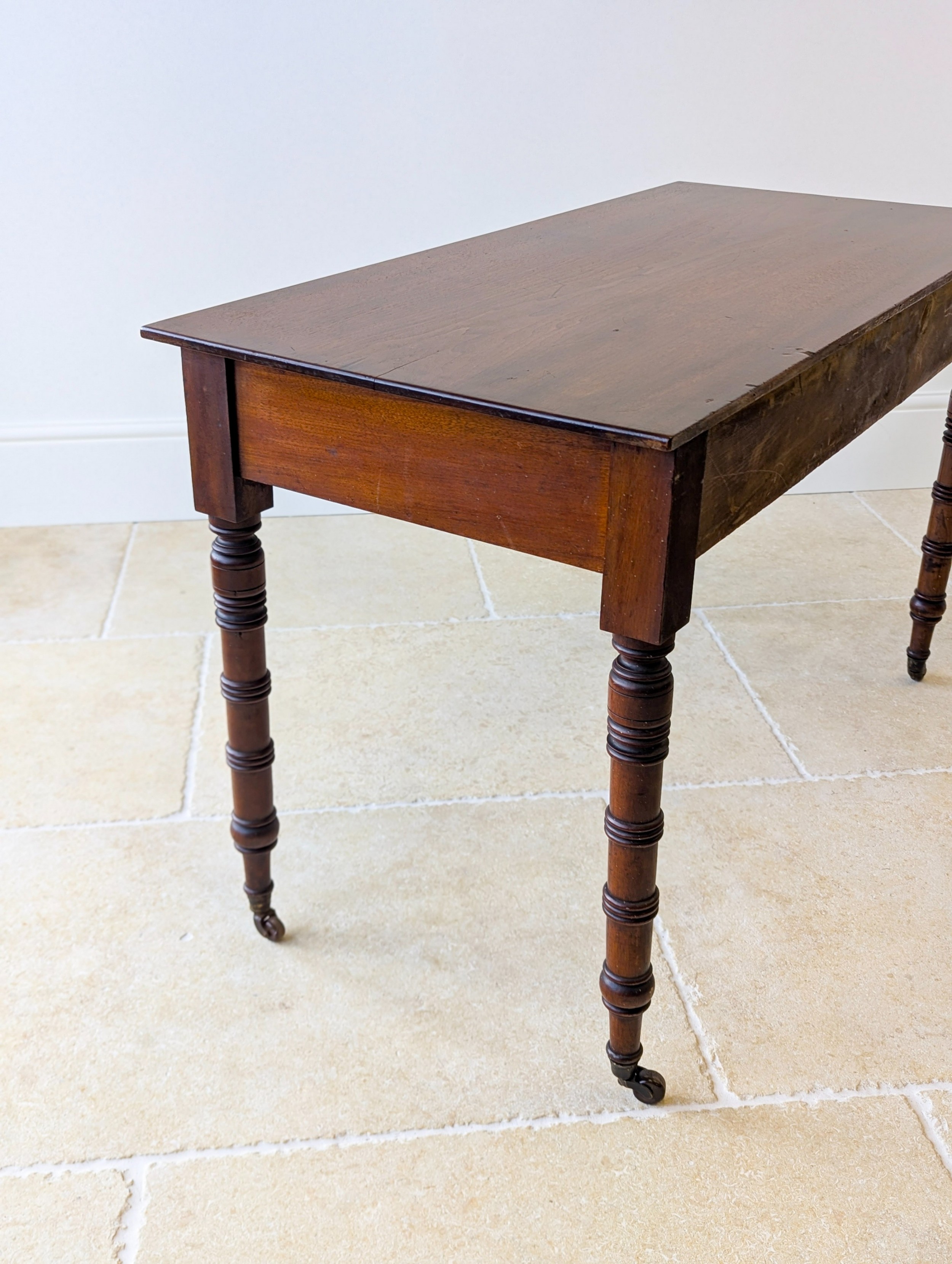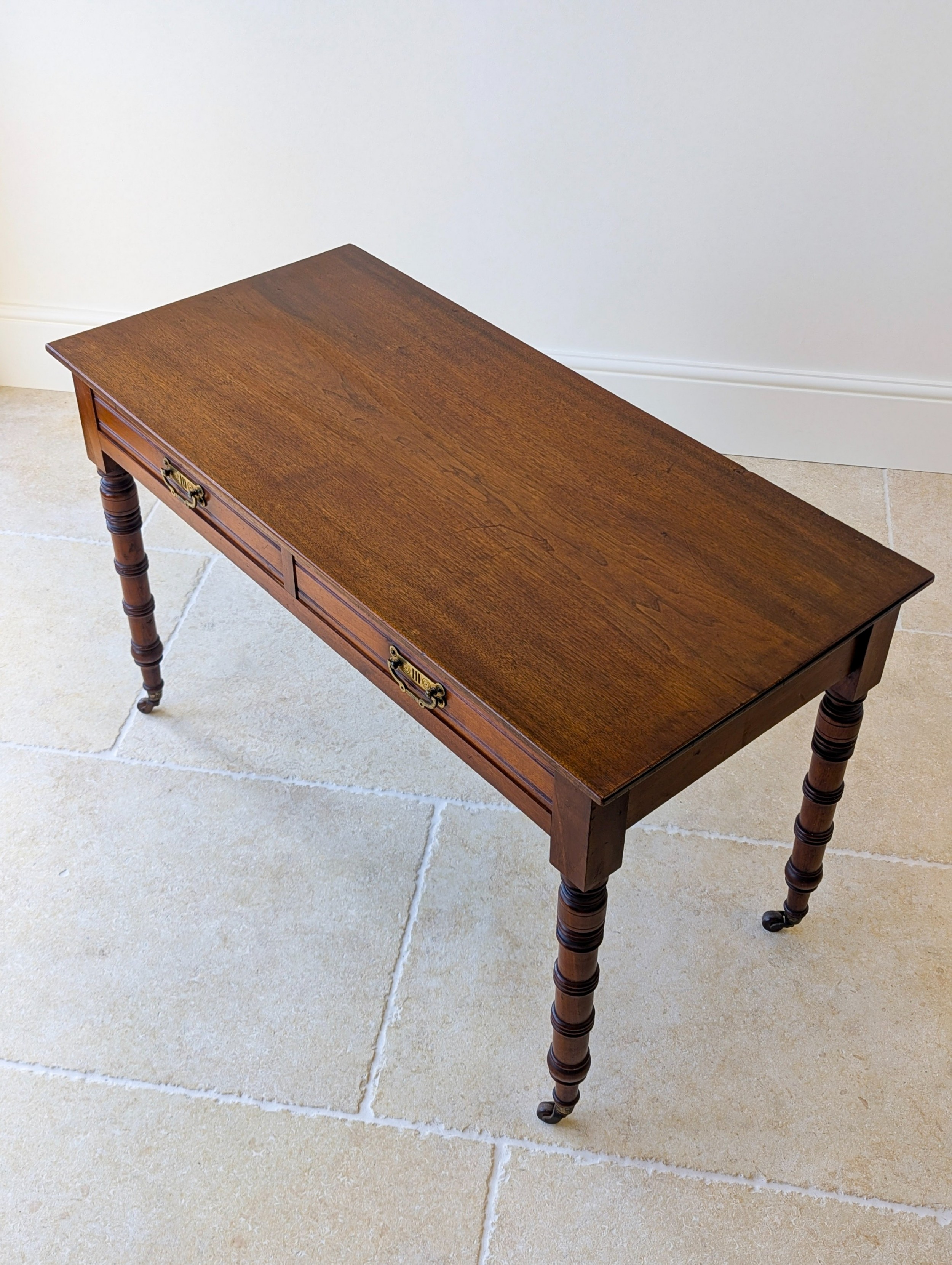 Mahagoni Schreibtisch mit Schubladen und Rollen - Mahagoni Tisch mit Messinggriffen und gedrechselten Beinen - Antiker Writing Table aus Mahagoni