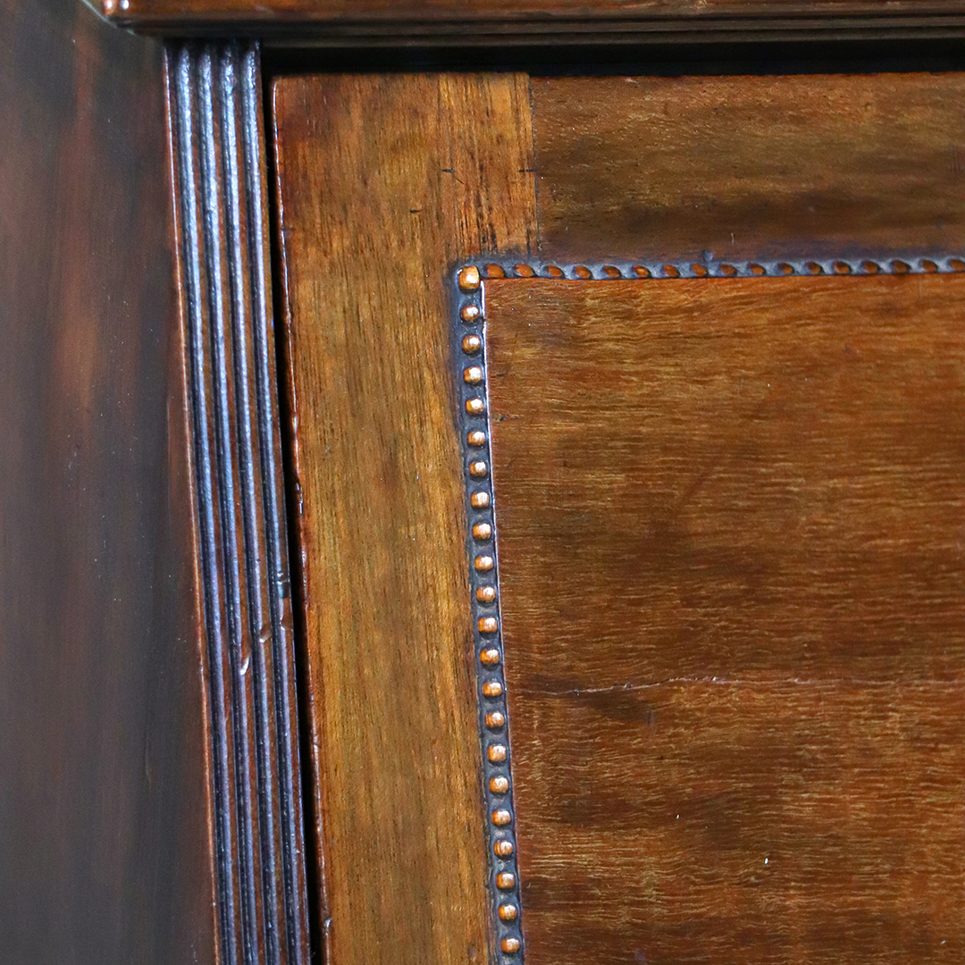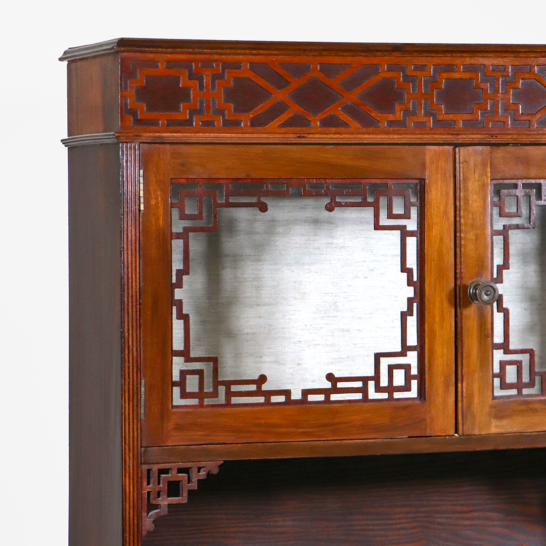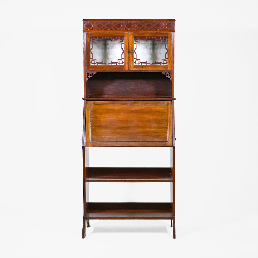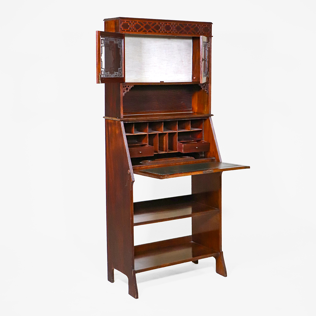 Dieser elegante Aufsatz-Sekretär wurde um 1890–1910 in England gefertigt und repräsentiert den Chinese Chippendale Revival Stil, der spätviktorianische und edwardianische Möbel stark prägte. Charakteristisch ist die Mischung aus britischer Handwerkskunst und fernöstlich inspirierten Ornamenten. Die geometrischen Muster an Kranz und Glastüren greifen typische Chinoiserie-Elemente auf, wie sie bereits im 18. Jahrhundert von Thomas Chippendale populär gemacht wurden.