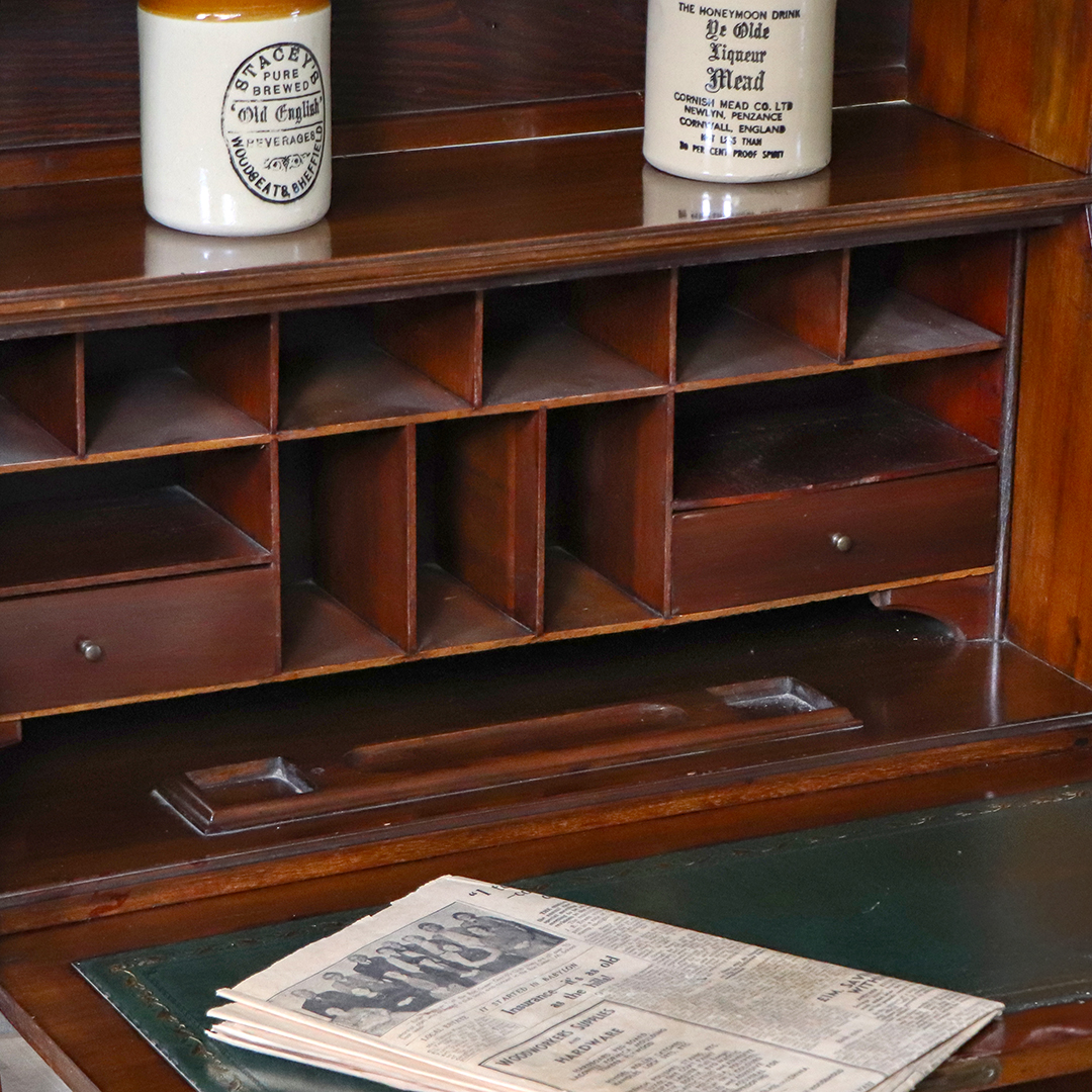 Das Möbel ist aus massivem Mahagoni gefertigt und zeigt die für diese Zeit typische, etwas schlankere Bauform. Der Sekretär bietet eine ausklappbare Schreibfläche mit grünem, geprägtem Leder, zahlreiche kleine Innenfächer, Schubfächer und Ablagen, sowie einen oberen Vitrinenbereich mit zwei Glastüren in dekorativer chinesischer Rahmenornamentik. Unter der Vitrine befindet sich ein großzügiges offenes Fach. Im unteren Teil stehen zwei praktische Ablageflächen zur Verfügung.
