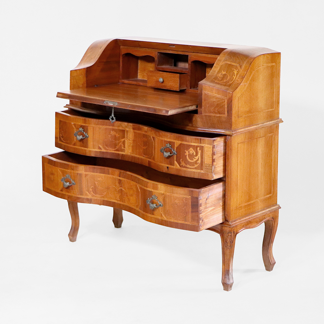 Der Sekretär im englischen Stil wurde nach traditionellen Vorbildern gefertigt und zeigt den unverwechselbaren Charme des Louis XV. Die geschwungene Linienführung, kombiniert mit symmetrischen Intarsienmotiven, erinnert an die feinsten englischen Möbel des späten 19. Jahrhunderts.