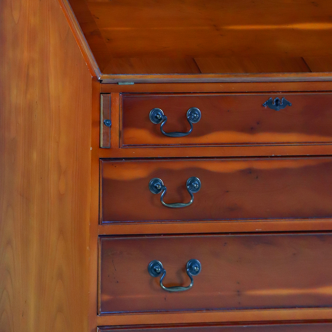 Der Sekretär ist eibe furniert, ein Holz, das im englischen Möbelbau besonders geschätzt wird. Die warm gemaserte Oberfläche unterstreicht den hochwertigen Eindruck. Die vier Schubladen sind mit dunkel patinierten Swan Handles ausgestattet – ein klassisches Detail englischer Möbel dieser Epoche. Die offenen Bracket Feet sind außen gerade und innen elegant geschwungen, ganz im Stil georgianischer Vorbilder.