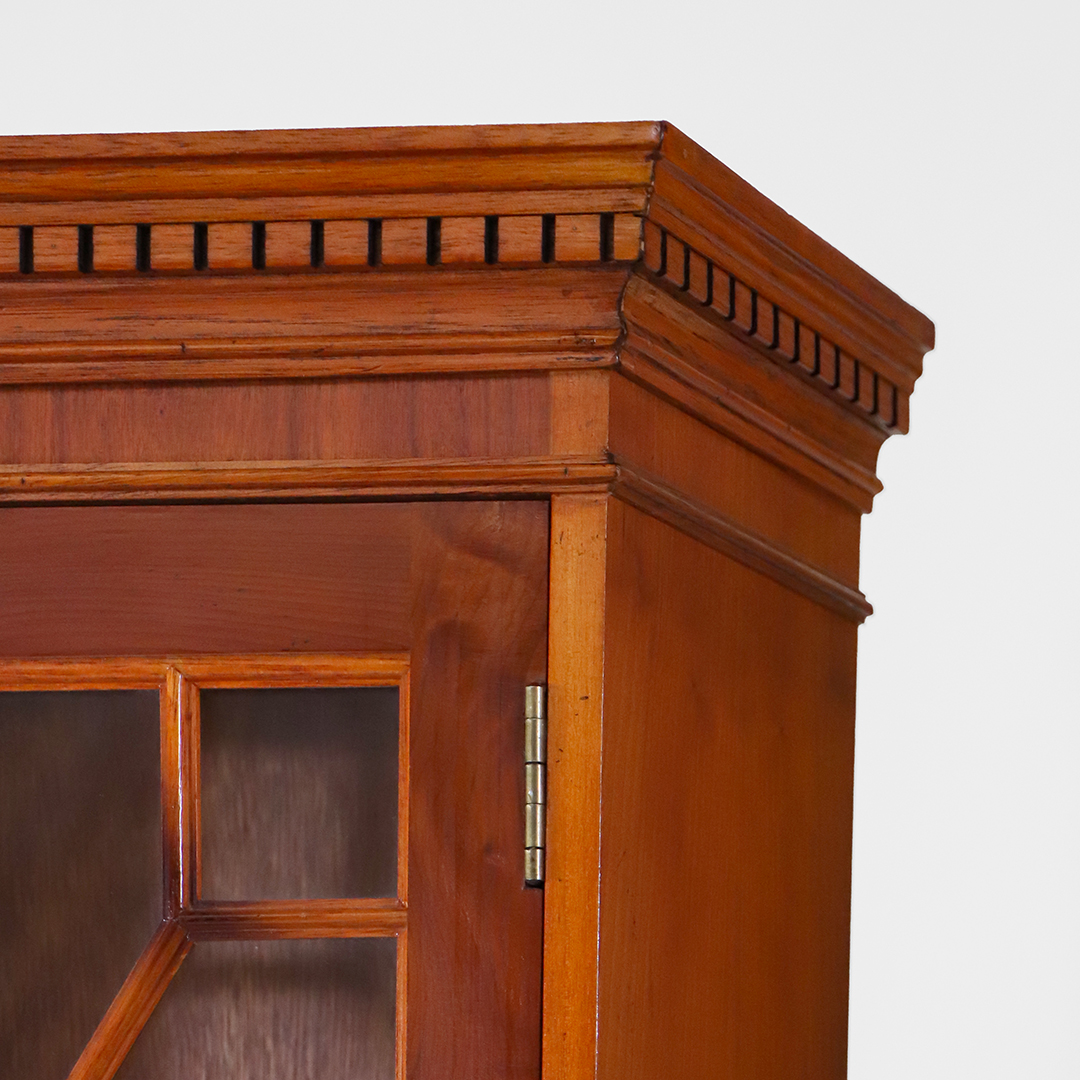 Der obere Teil besteht aus einem Vitrinenaufsatz mit einzeln verglasten Scheiben, insgesamt 13 Glasfelder, die dem Möbel Leichtigkeit und Tiefe verleihen. Im Inneren befinden sich zwei Einlegeböden, ideal für Bücher oder Sammlerstücke. Die spitz zulaufende, hervortretende Krone setzt einen eleganten Abschluss und unterstreicht den repräsentativen Charakter.