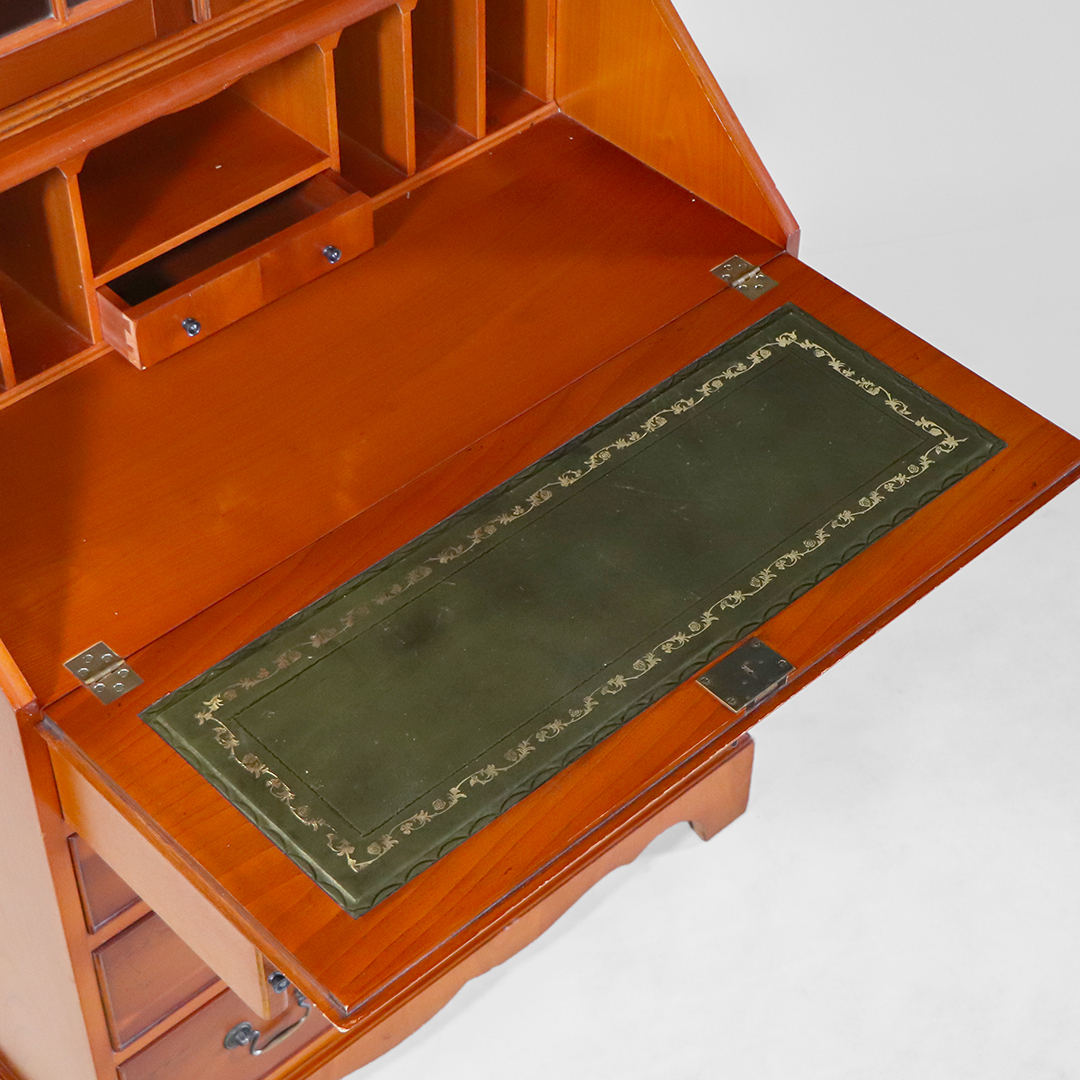 Die herausklappbare Schreibfläche offenbart eine grüne Lederschreibfläche mit goldgeprägter, verzierter Umrandung. Im Inneren befinden sich Pigeon Holes mit Rundbögen sowie eine kleine Schublade, ideal für Schreibutensilien und Dokumente. Der Sekretär eignet sich damit perfekt als stilvoller Arbeitsplatz oder Bibliotheksmöbel.