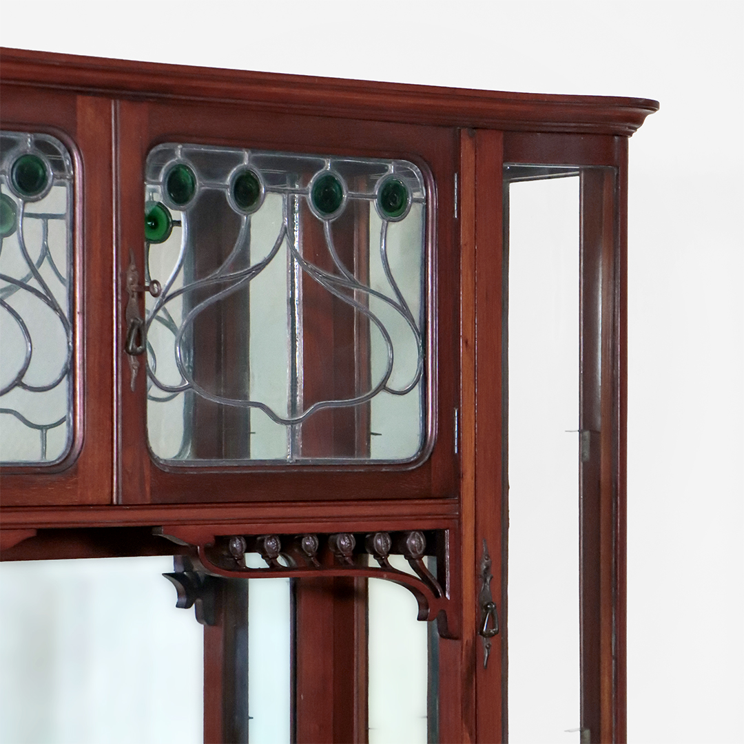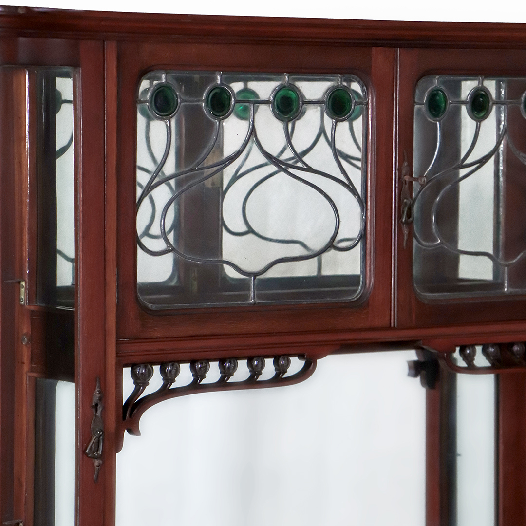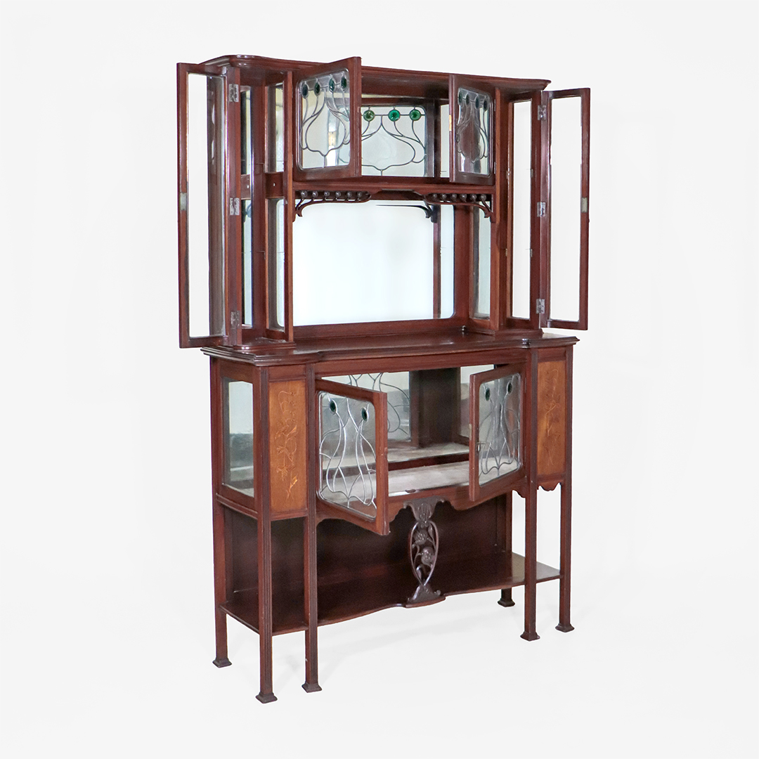Die geschwungenen Linien, durchbrochenen floralen Schnitzereien und die eleganten Proportionen spiegeln den typischen Stil des englischen Jugendstils wider. Das Möbel wirkt trotz seiner Größe sehr leicht und elegant und eignet sich hervorragend als repräsentatives Buffet, Aufsatzvitrine oder Sammlervitrine.