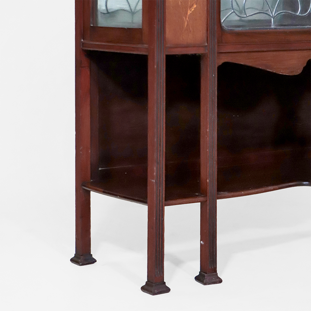 Jugendstil Vitrinenschrank antik um 1900 aus England Mahagoni mit Bleiverglasung und floralen Einlegearbeiten