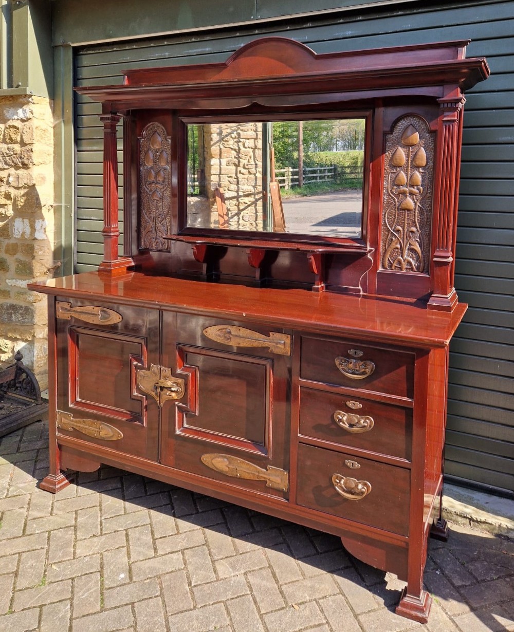 Arts and Crafts Sideboard antik Shapland and Petter England mit Spiegelaufsatz und Kupferbeschlägen
