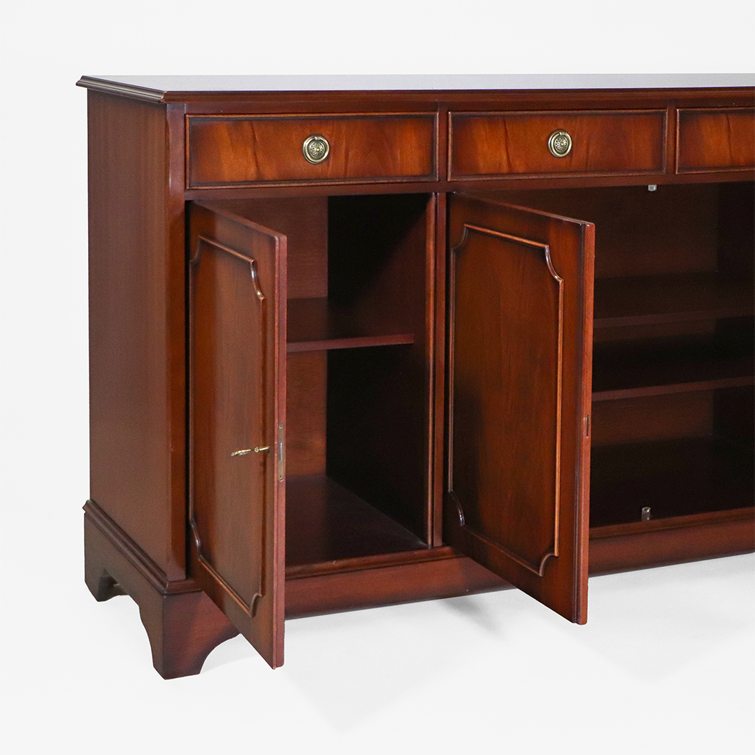 Die typischen Bracket Feet – außen geschlossen, innen weich geschwungen – geben dem Sideboard seine charakteristische englische Silhouette. Zusammen mit den klaren Linien entsteht ein Möbelstück, das perfekt in Räume mit Antik Stil oder klassischer Einrichtung passt.