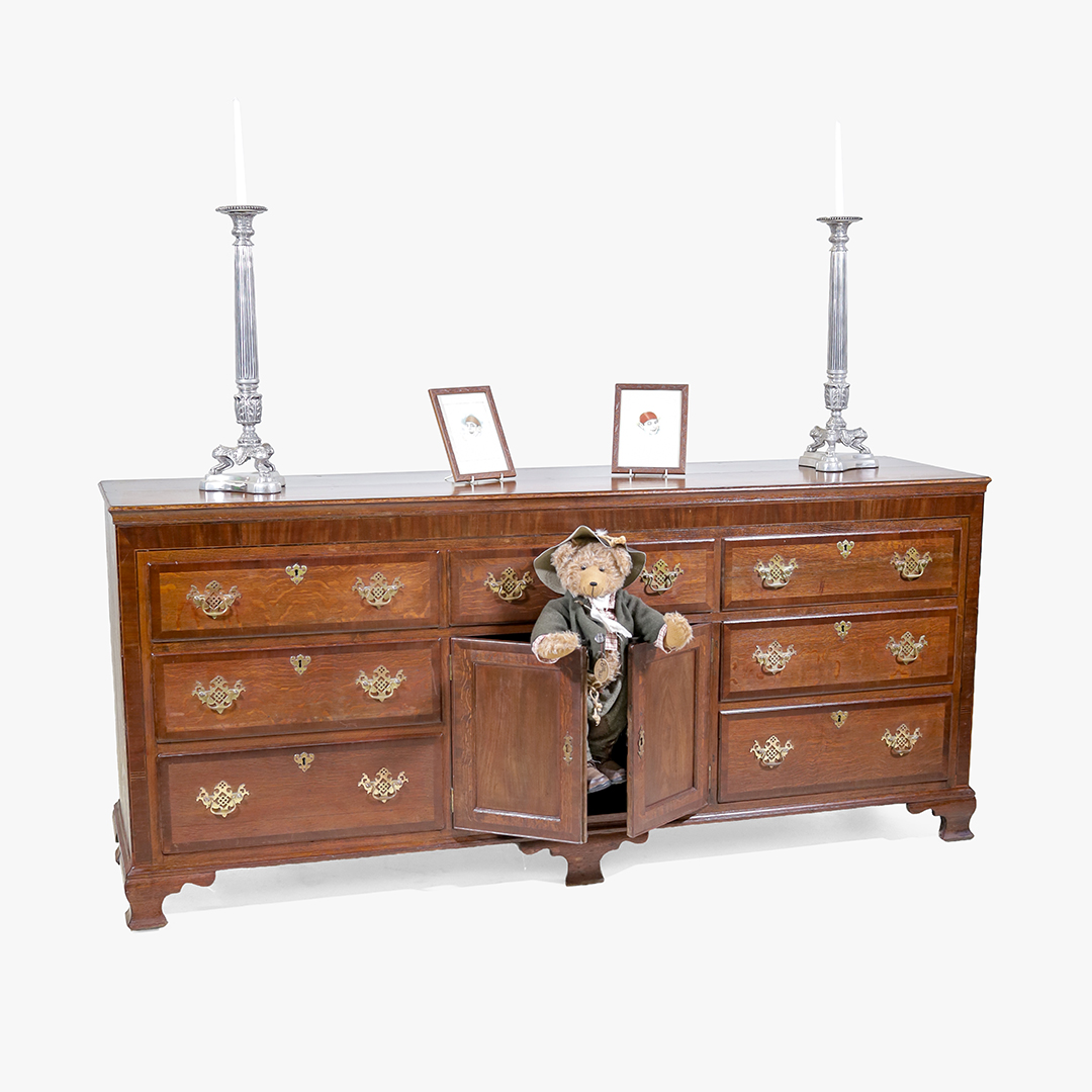 Dieses originale Late-Georgian-Sideboard aus dem 19. Jahrhundert überzeugt durch seine kraftvolle Präsenz und hochwertige handwerkliche Ausführung. Gefertigt aus massiver Eiche mit feinen Mahagoni-Furnierarbeiten, vereint es Funktionalität mit klassischer englischer Eleganz. Die markante Maserung der quarter sawn oak – auch bekannt als Tiger Oak – verleiht dem Möbel eine lebendige, fast grafische Oberfläche.