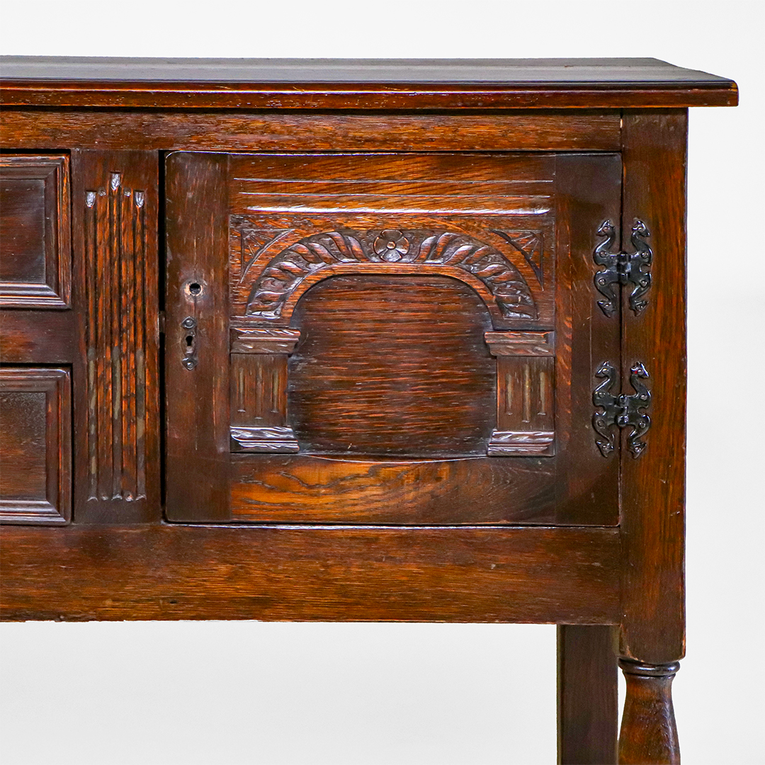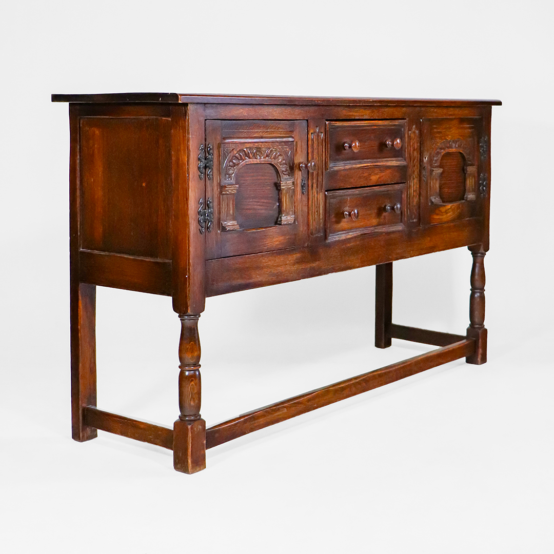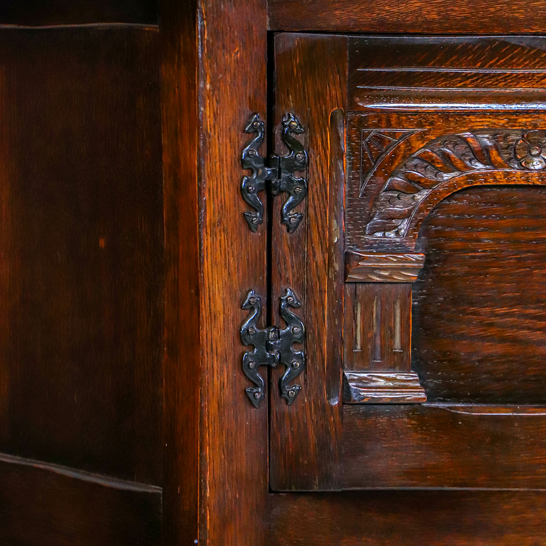 Dieses Sideboard englisch zeigt typische Details des Jacobean Revival: geschnitzte Türfronten in Bogenform und dekorative Eisenbeschläge. Solche englischen Sideboards wurden traditionell im Esszimmer genutzt und sind heute begehrte Stücke.