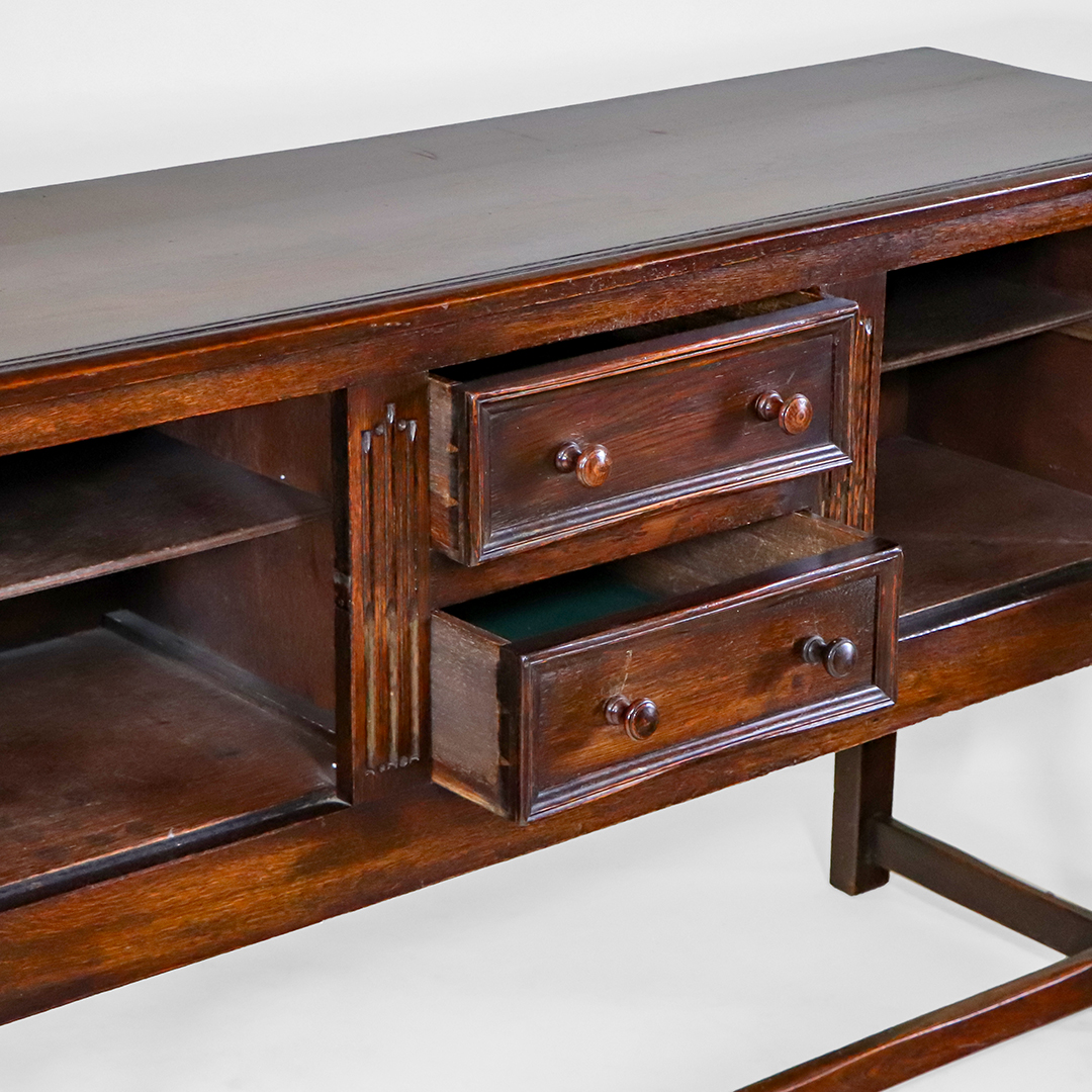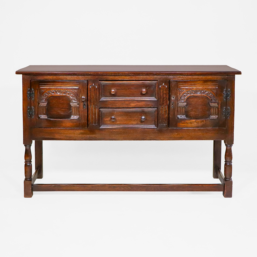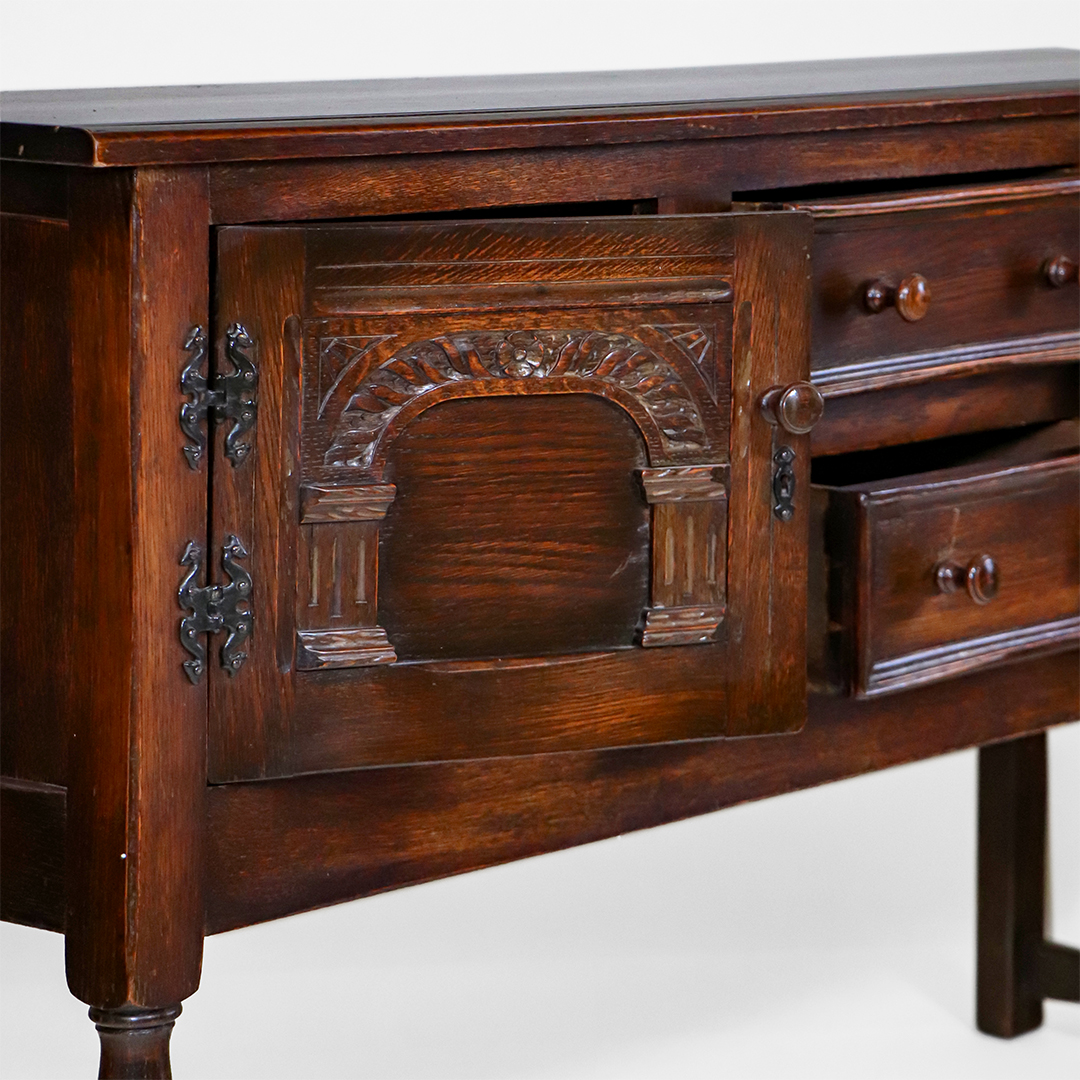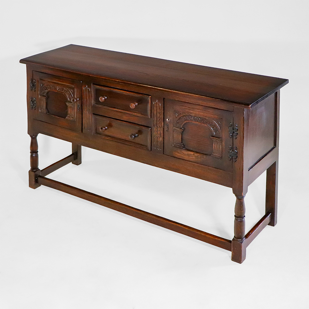 Dieses Sideboard englisch zeigt typische Details des Jacobean Revival: geschnitzte Türfronten in Bogenform und dekorative Eisenbeschläge. Solche englischen Sideboards wurden traditionell im Esszimmer genutzt und sind heute begehrte Stücke.