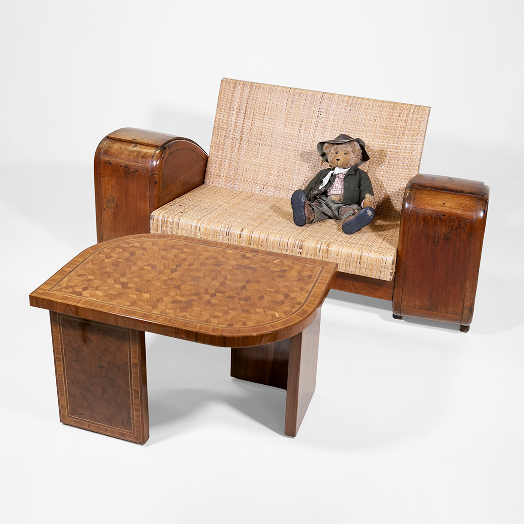 Durch seine niedrige Bauhöhe, die kompakten Proportionen und das harmonische Zusammenspiel von Holz und Geflecht wirkt das Sofa gleichzeitig dekorativ, skulptural und wohnlich. Ein echtes Statement-Stück für stilvolle Wohnräume, Galerien oder hochwertige Vintage-Einrichtungen.