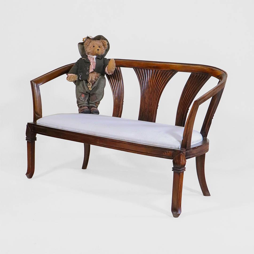 Die weiße Sitzfläche und der hochwertige massive Mahagoni Holzrahmen machen diese Holzbank ideal für zwei Personen. Ob als Bank mit Lehne Esszimmer oder als dekoratives Holz Sofa im Wohnbereich – dieses antike Möbelstück verbindet edles Design mit Funktionalität. Eine echte Rarität unter den Holzbanken, die Ihrem Zuhause einen besonderen Charakter verleiht.