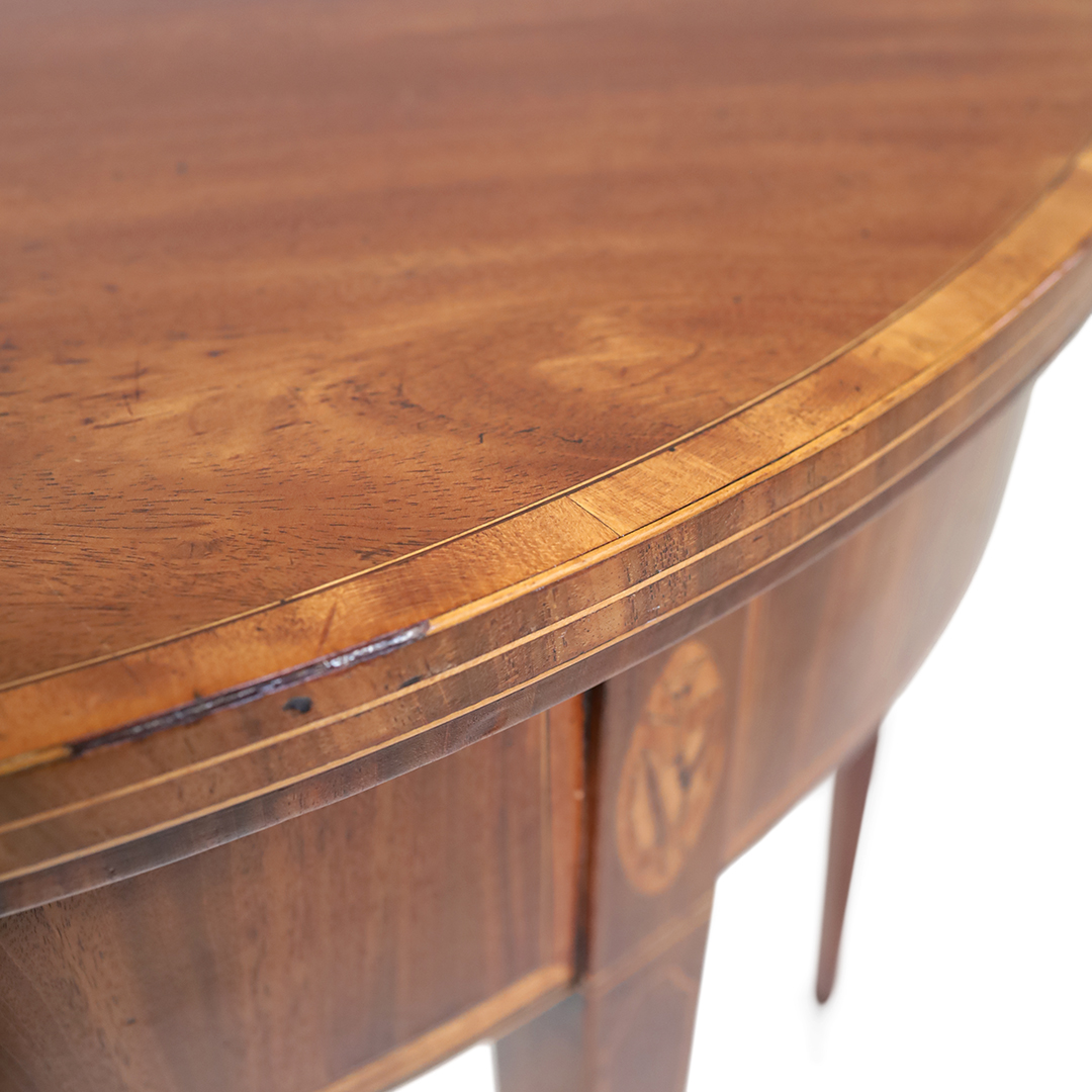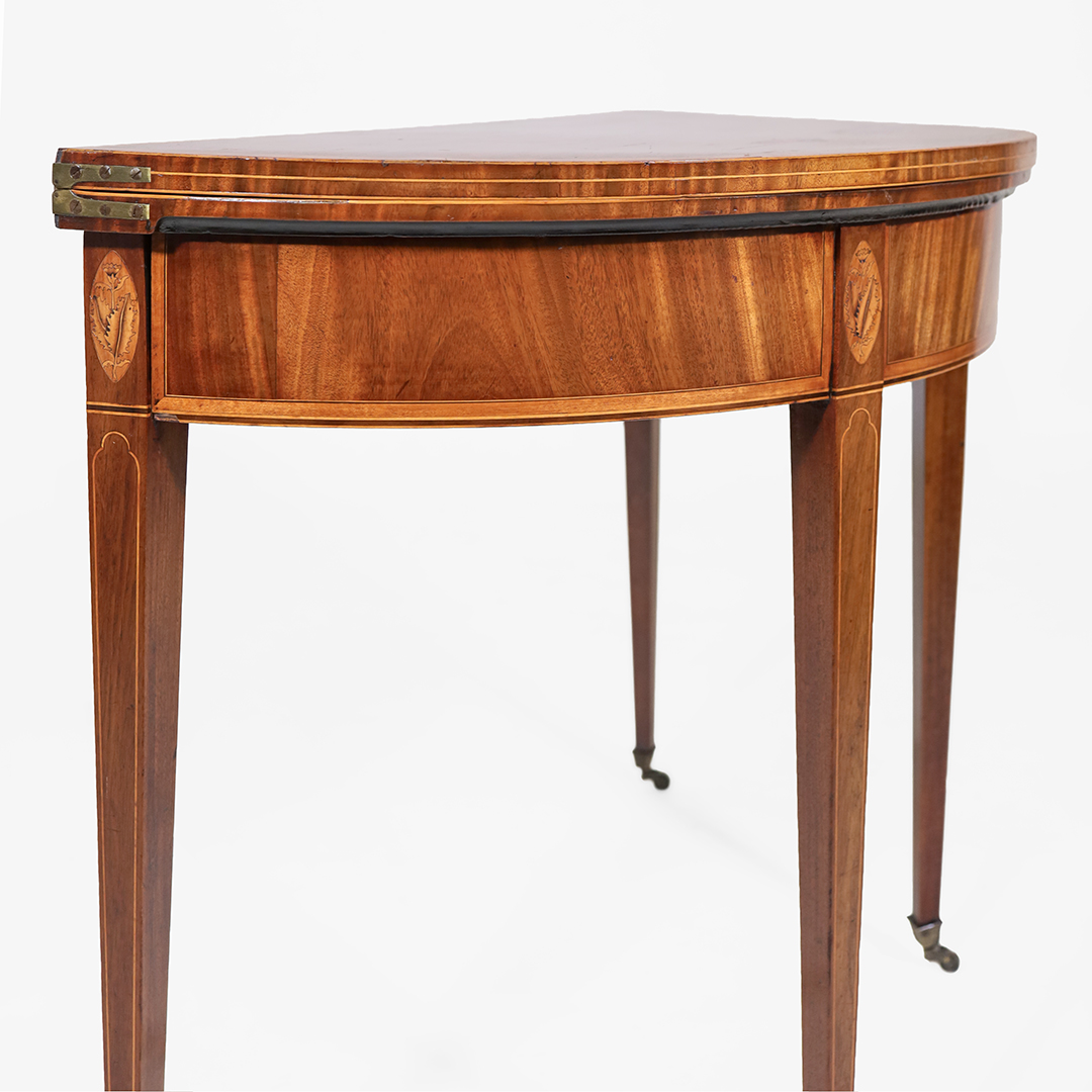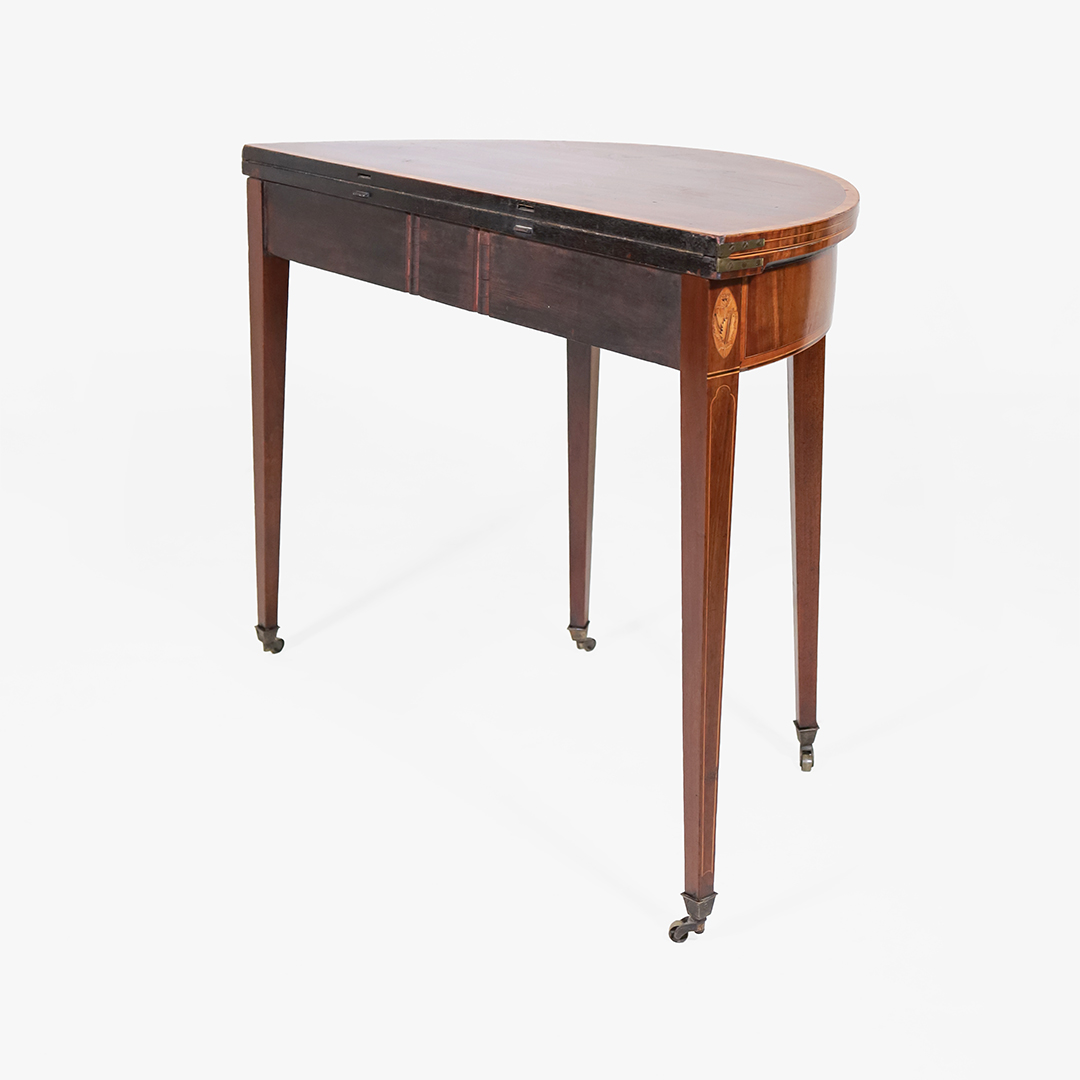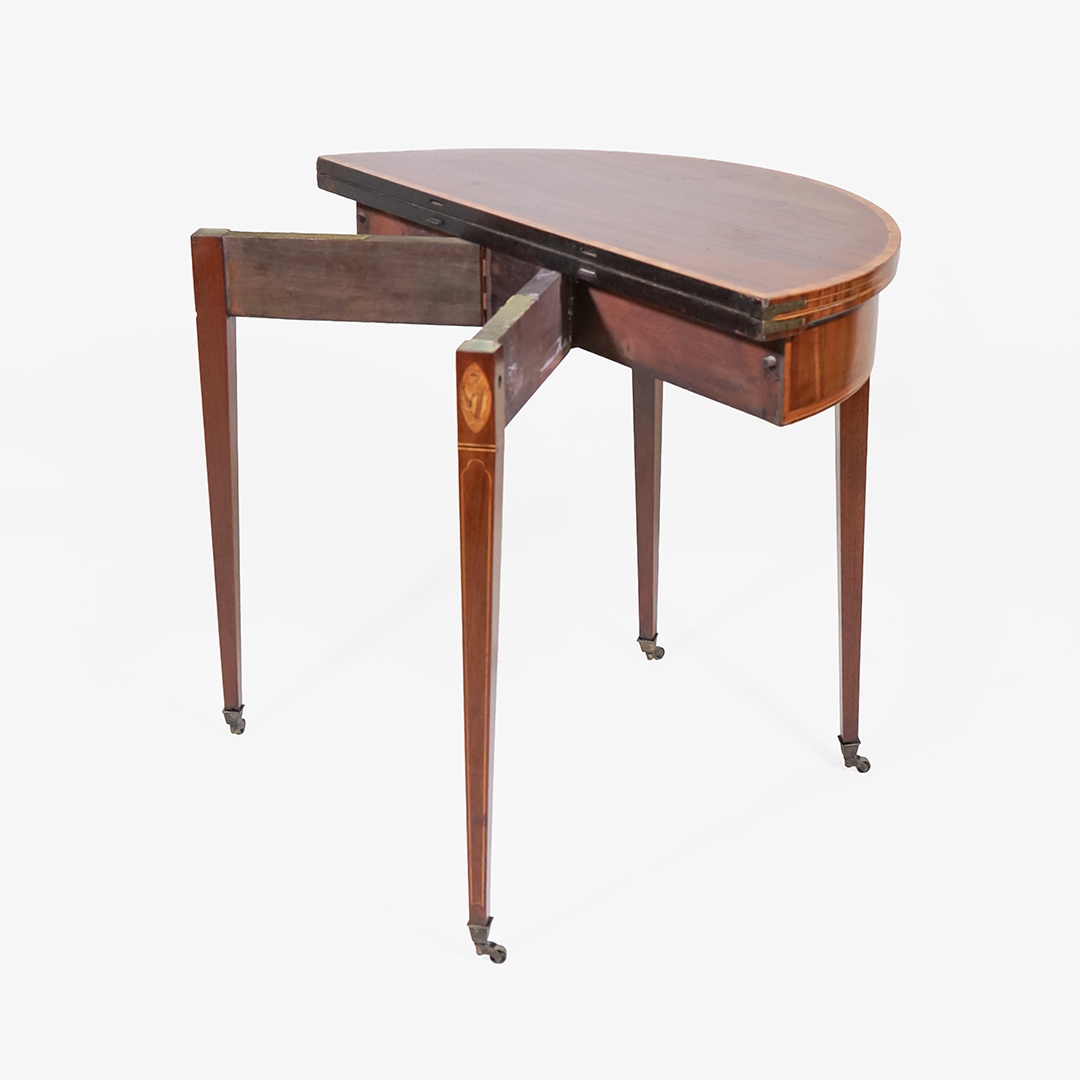Demi-Lune Spieltisch Antik aus Mahagoni mit Intarsien – Klappbarer englischer Kartentisch