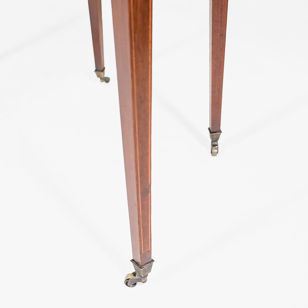 Die schlanken, konisch zulaufenden Beine mit Rollen, die dezente Linienführung und die harmonischen Proportionen machen diesen antiken englischen Spieltisch zu einem eleganten Möbelstück, das sich sowohl klassisch als auch modern kombinieren lässt.