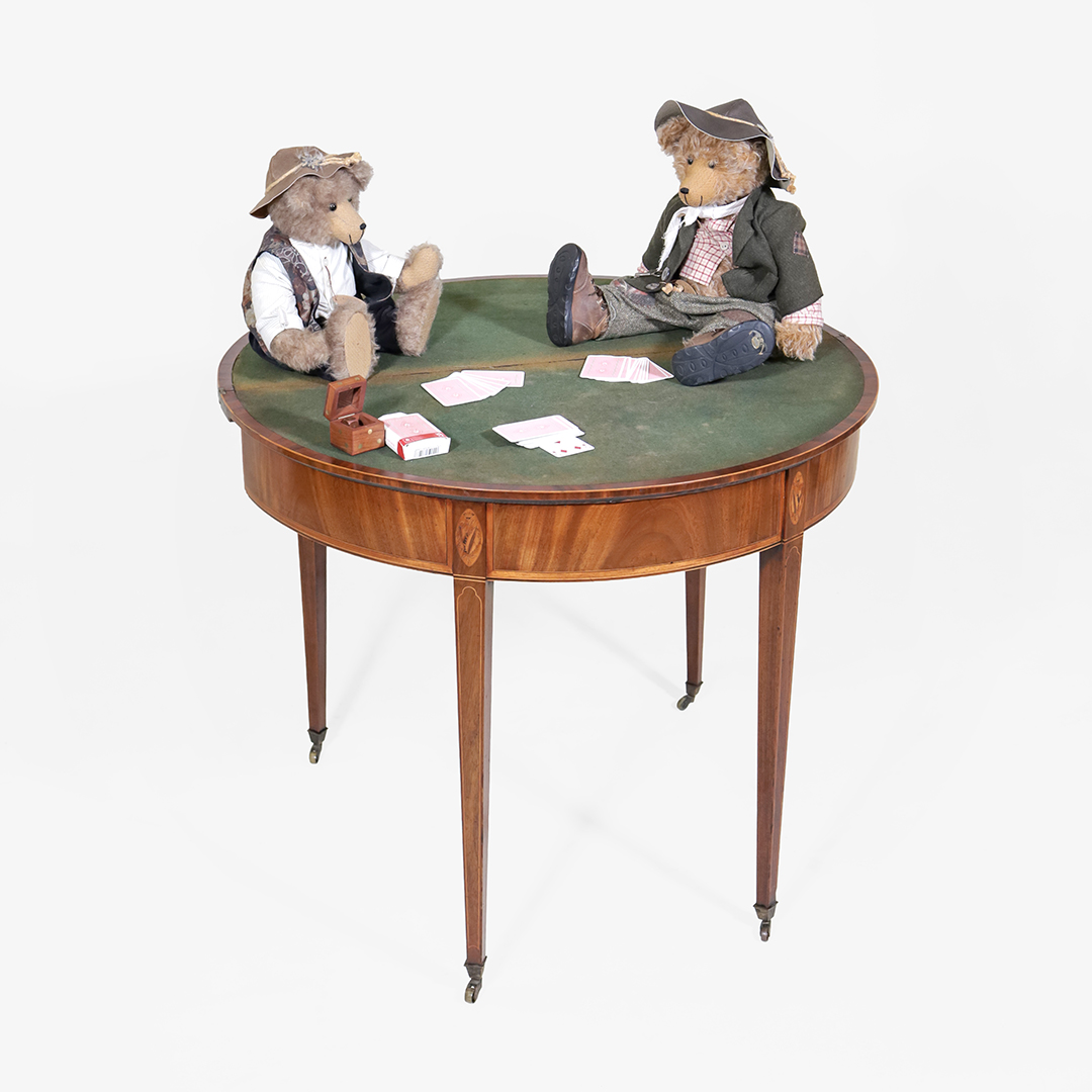 Im geschlossenen Zustand präsentiert sich der Tisch als platzsparender Demi Lune Tisch, ideal für Wandaufstellung oder schmale Räume. Aufgeklappt entsteht ein antiker Spieltisch rund mit grüner Spielfläche – funktional, elegant und typisch englisch.