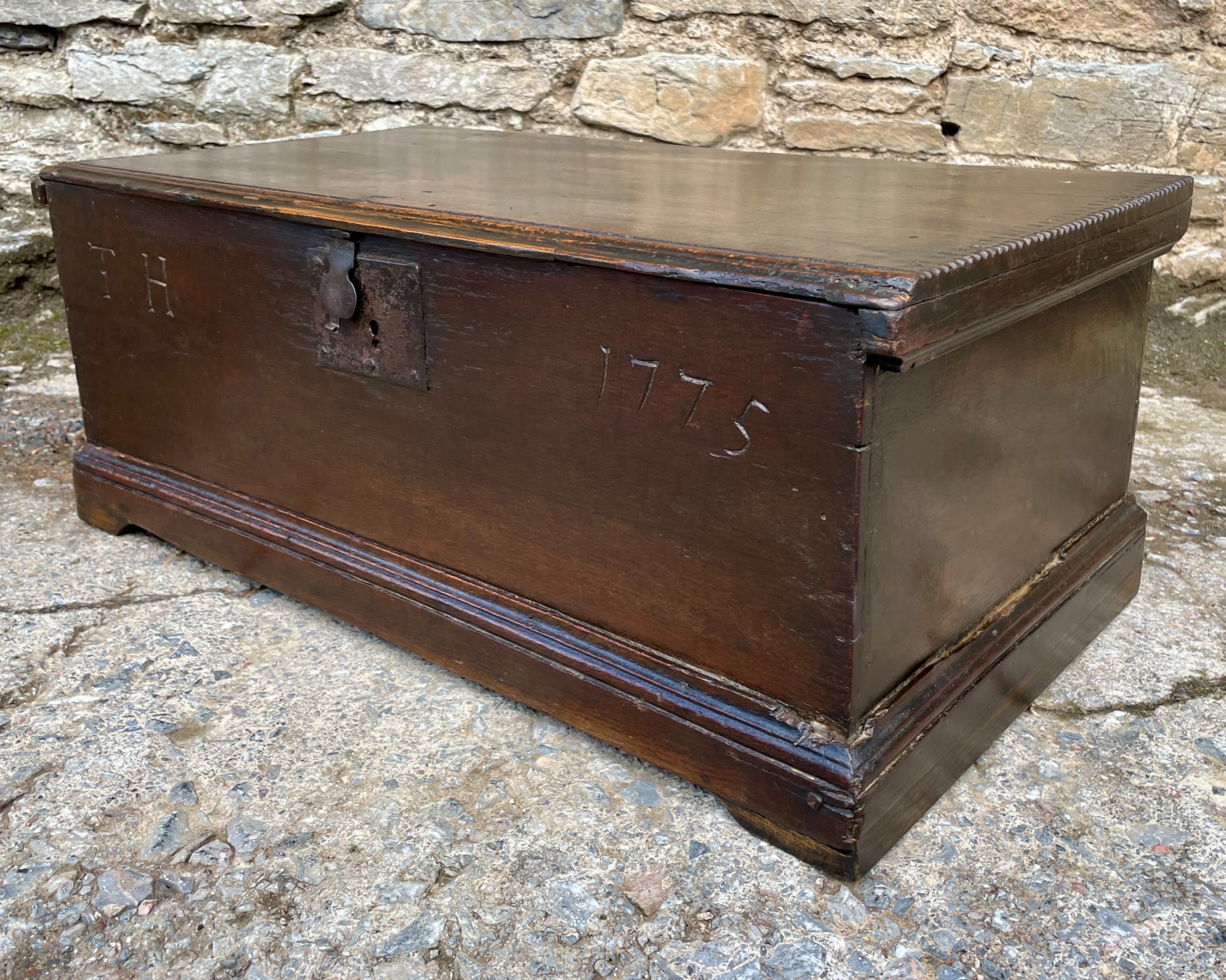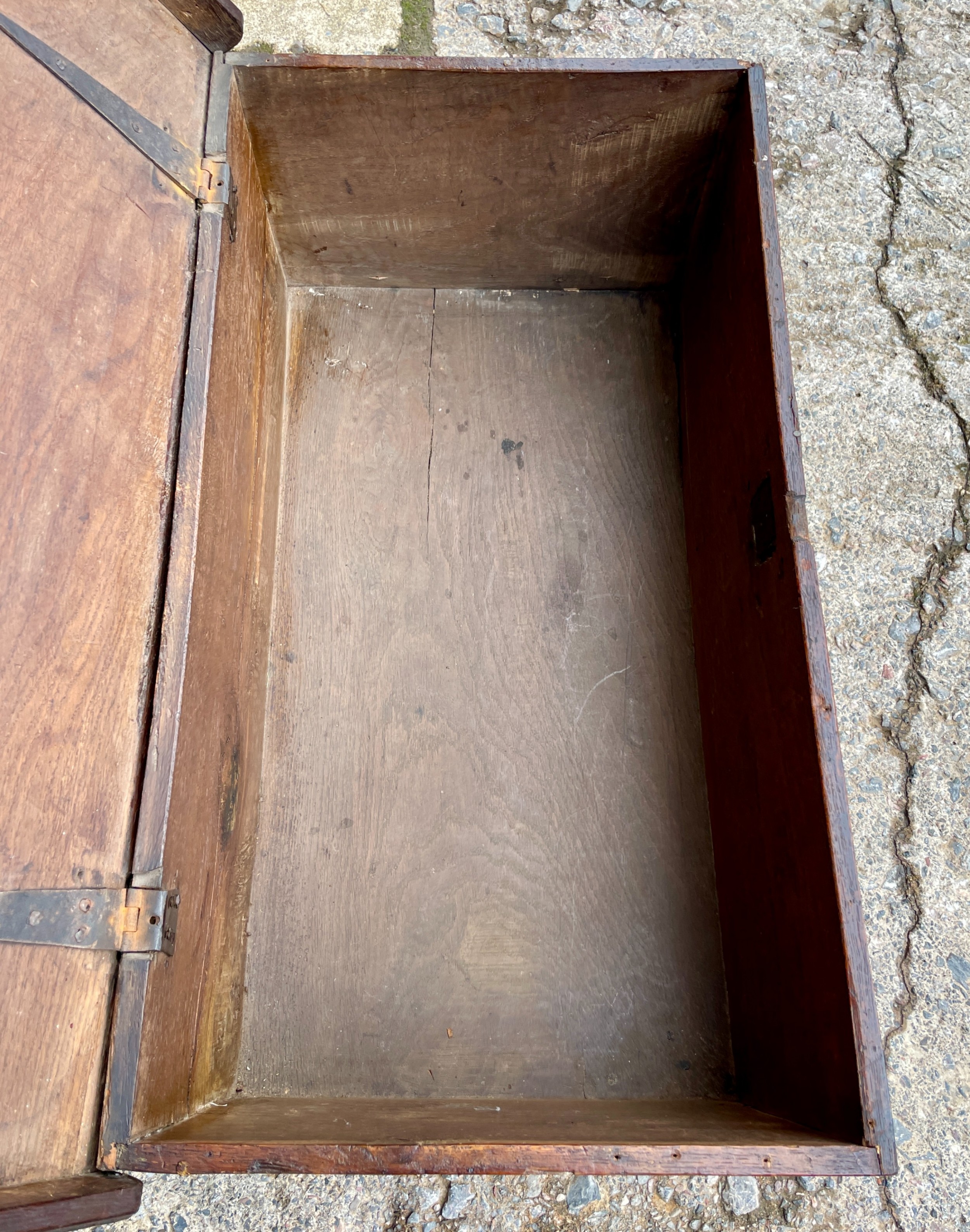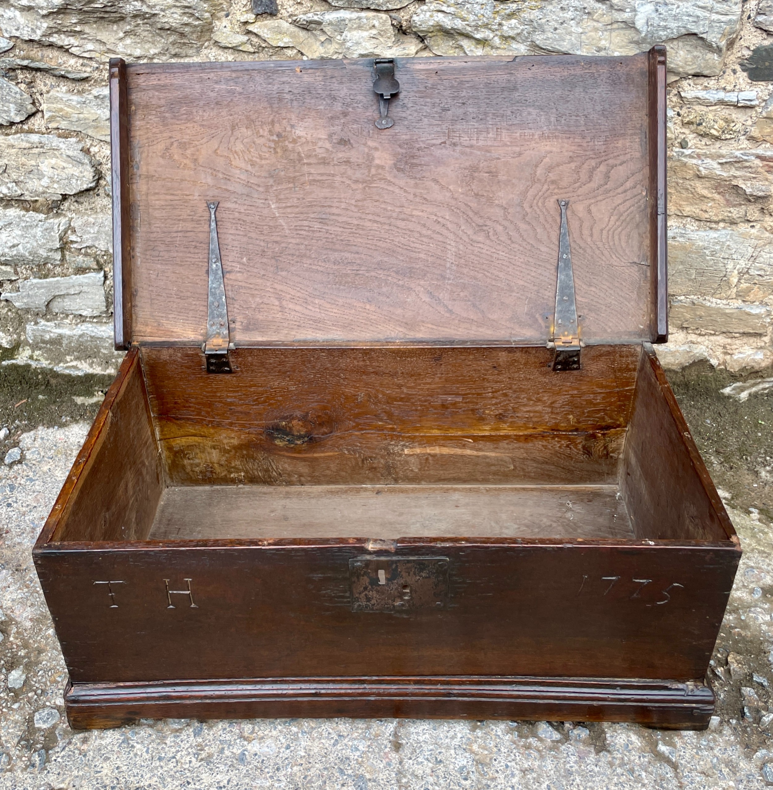Die Truhe besitzt ein handgeschmiedetes Schloss mit passender Verriegelung und öffnet sich auf ihren originalen Eisenbändern – ein Beweis traditioneller englischer Handwerkskunst. Über die Jahrhunderte hat das Holz eine warme, dunkelbraune Patina entwickelt, die dem Möbelstück viel Charakter verleiht.