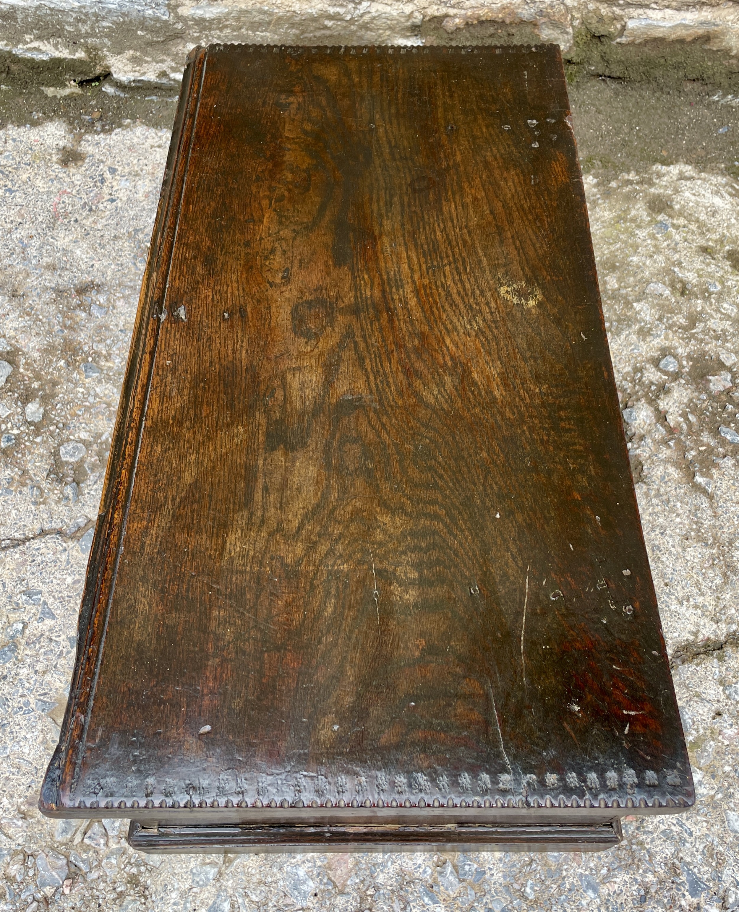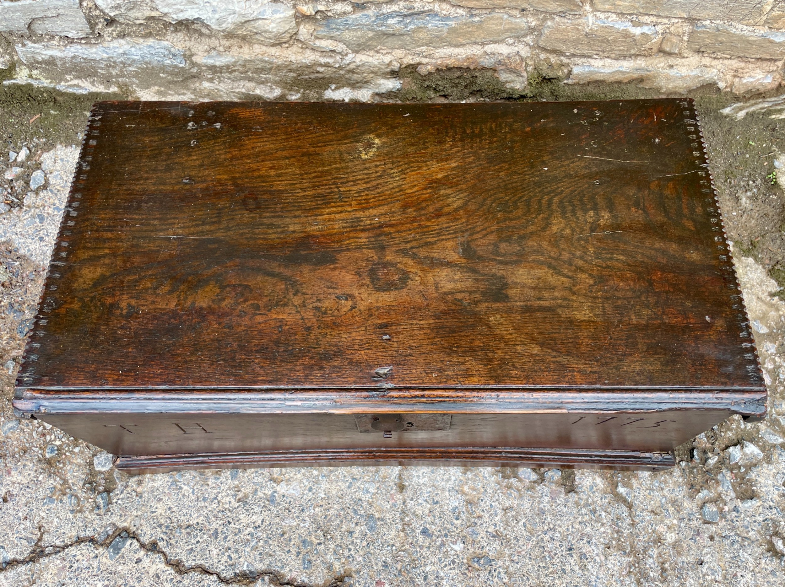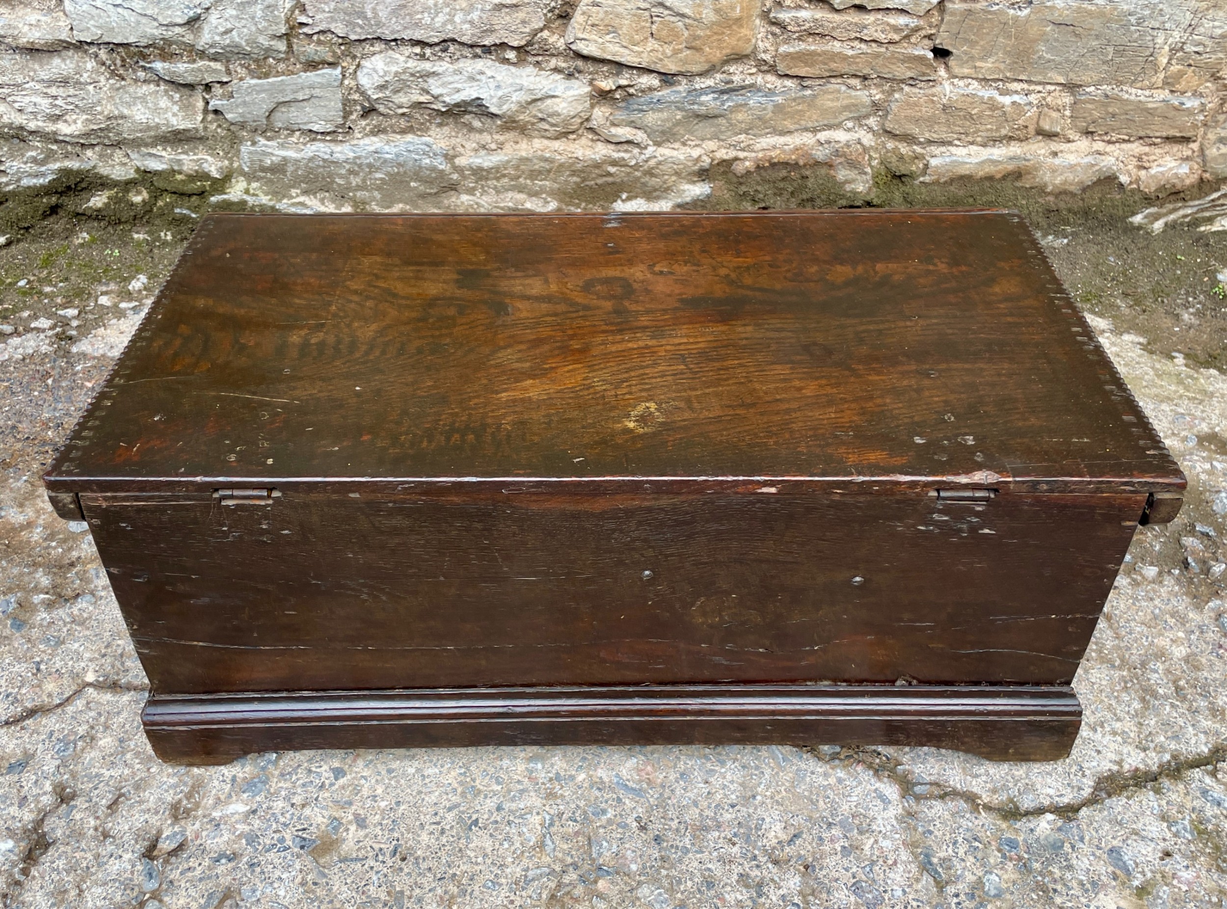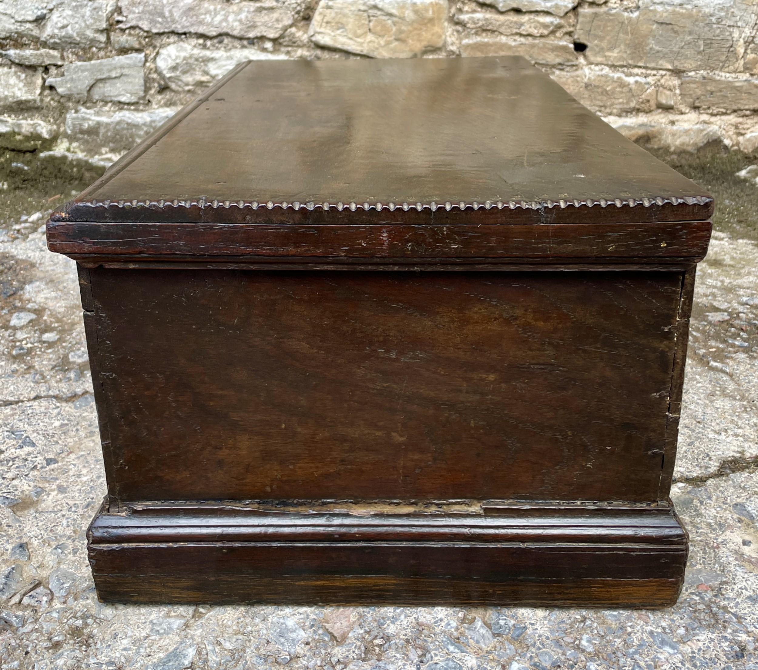 Die Truhe besitzt ein handgeschmiedetes Schloss mit passender Verriegelung und öffnet sich auf ihren originalen Eisenbändern – ein Beweis traditioneller englischer Handwerkskunst. Über die Jahrhunderte hat das Holz eine warme, dunkelbraune Patina entwickelt, die dem Möbelstück viel Charakter verleiht.