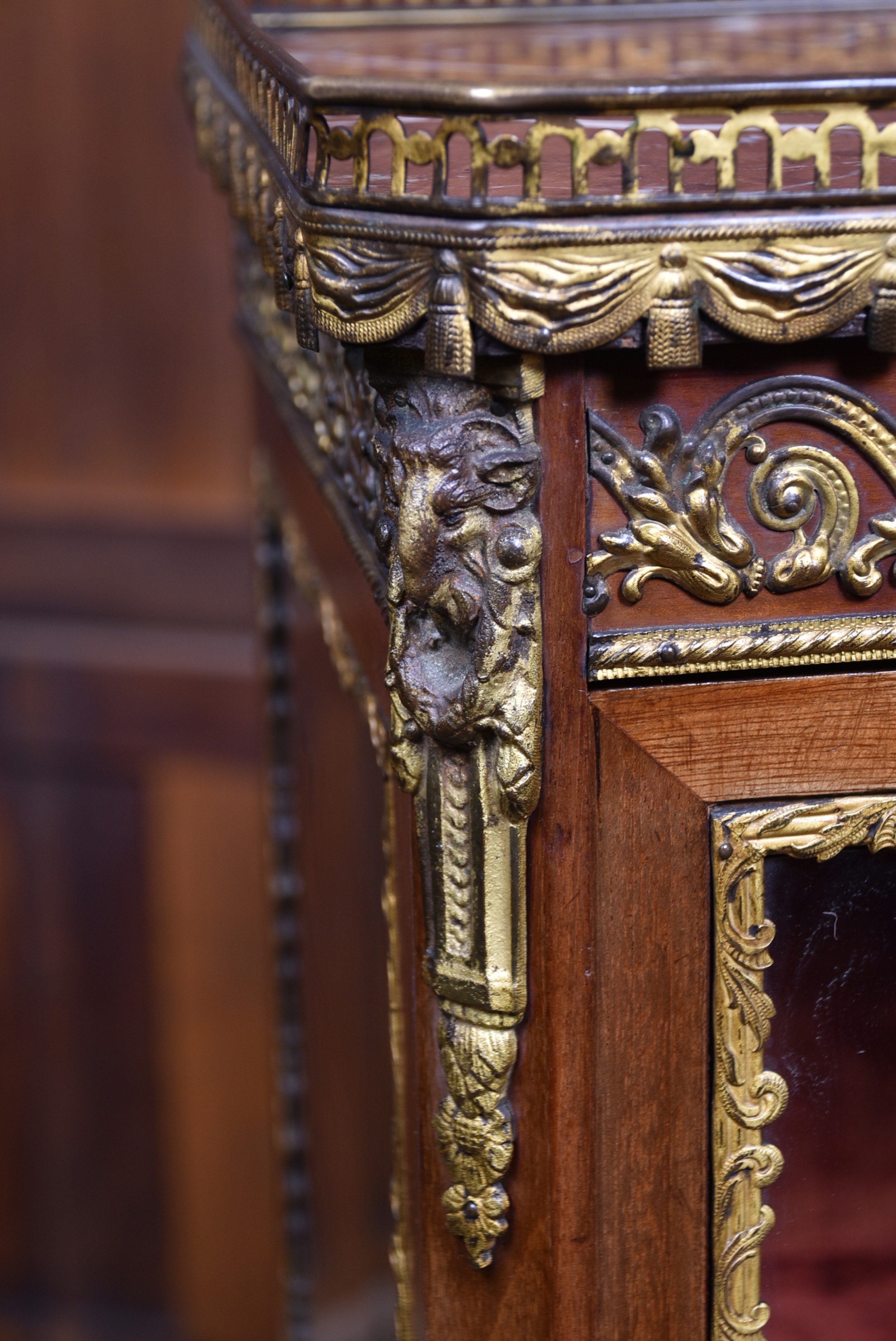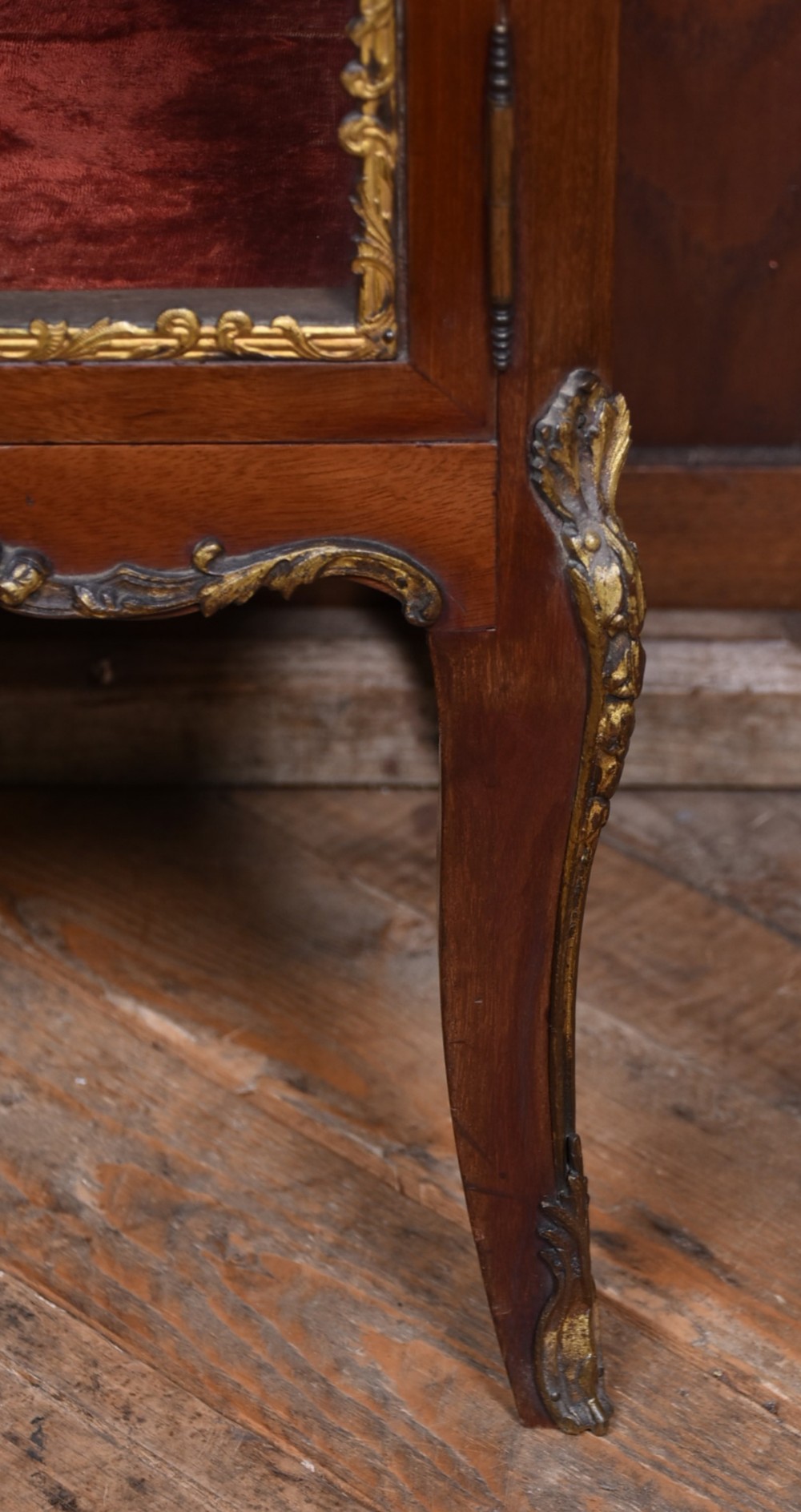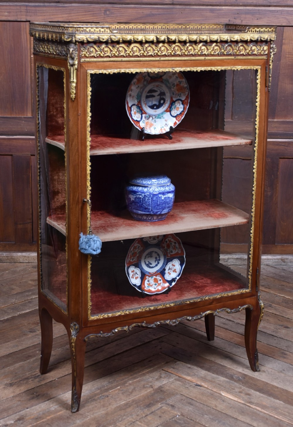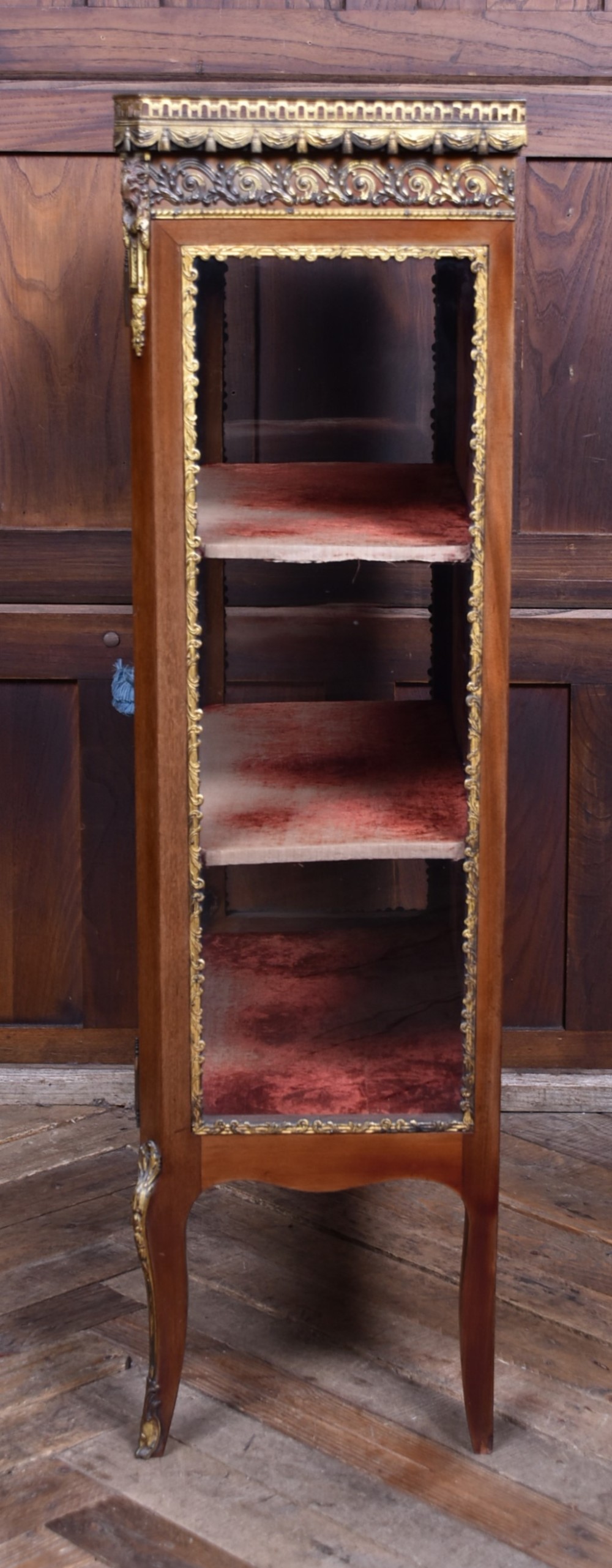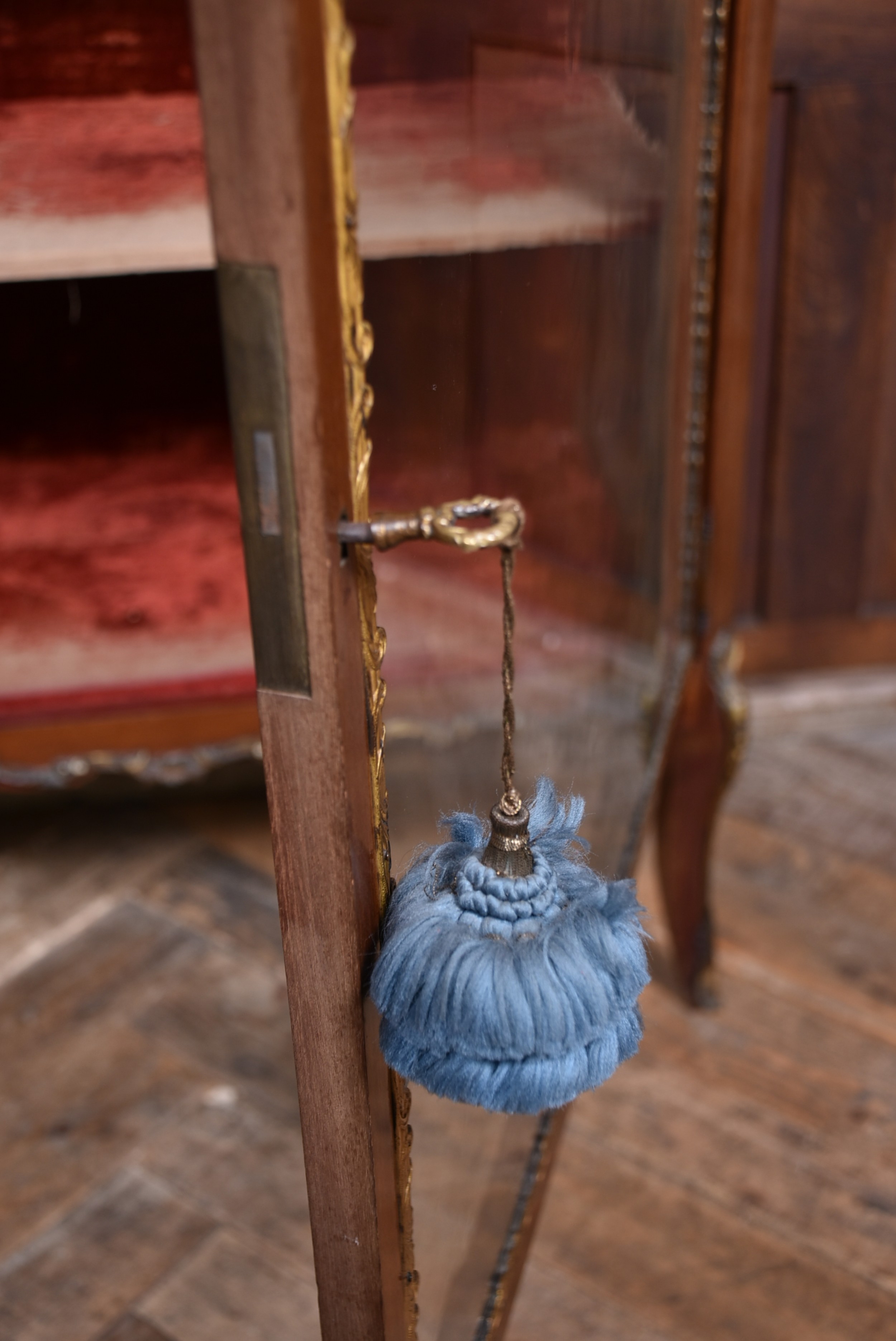 Die gesamte Vitrine antik ist mit feinen Messingapplikationen verziert, die das warme Holz und die elegante Form wunderschön betonen. Die schlanken Beine verleihen ihr Leichtigkeit, während die sorgfältig gearbeiteten Proportionen für eine harmonische Gesamtwirkung sorgen.