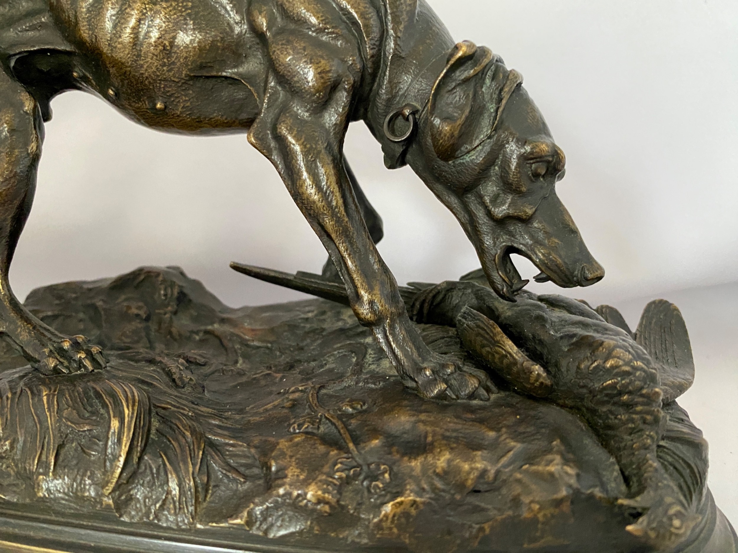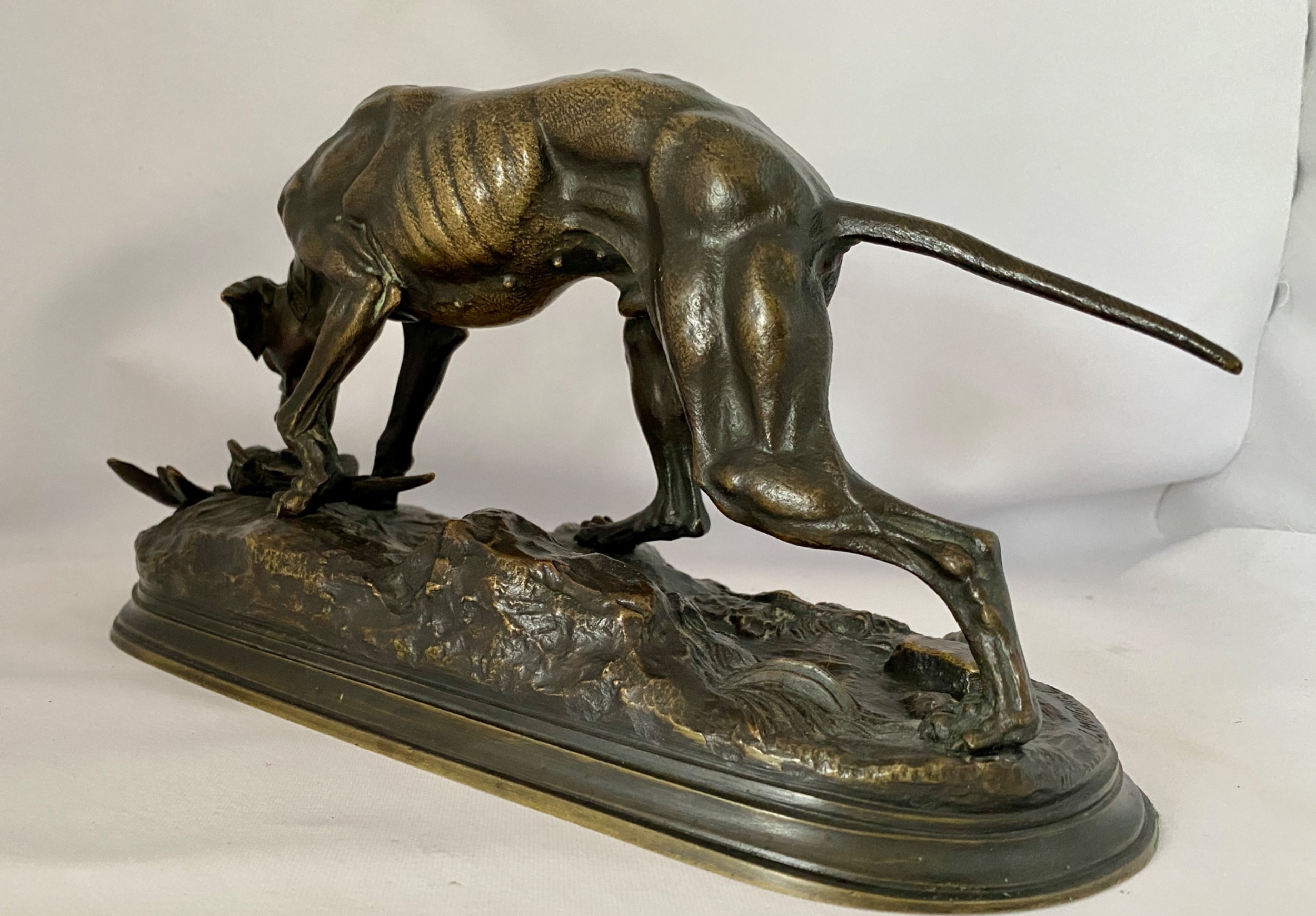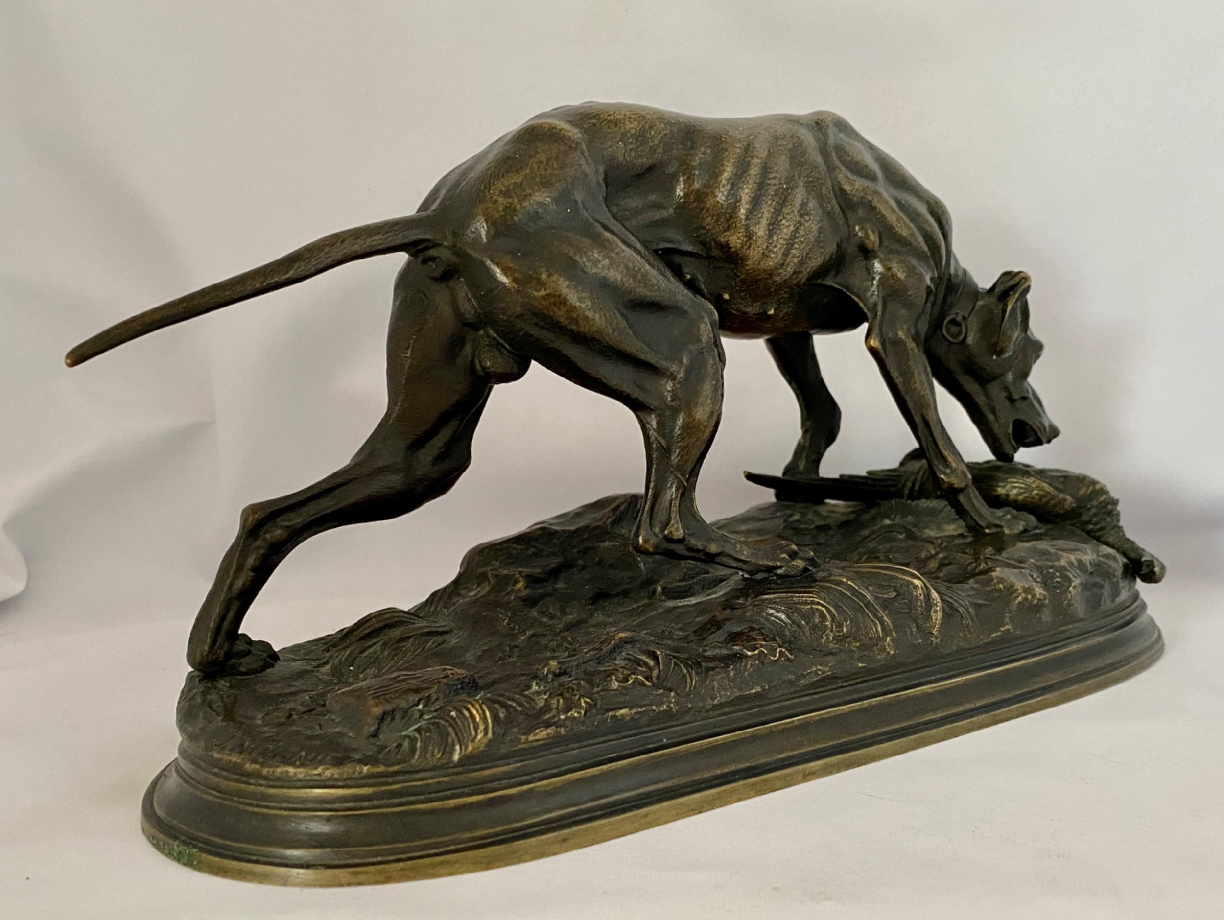 Die Figur zeigt einen Jagdhund aus Bronze in voller Bewegung, der stolz seine Beute trägt. Die feinen Strukturen des Fells, die gespannte Muskulatur und der lebendige Ausdruck des Tieres sind mit großer Präzision gearbeitet – ein echtes Meisterwerk französischer Tierbildhauerei des 19. Jahrhunderts.