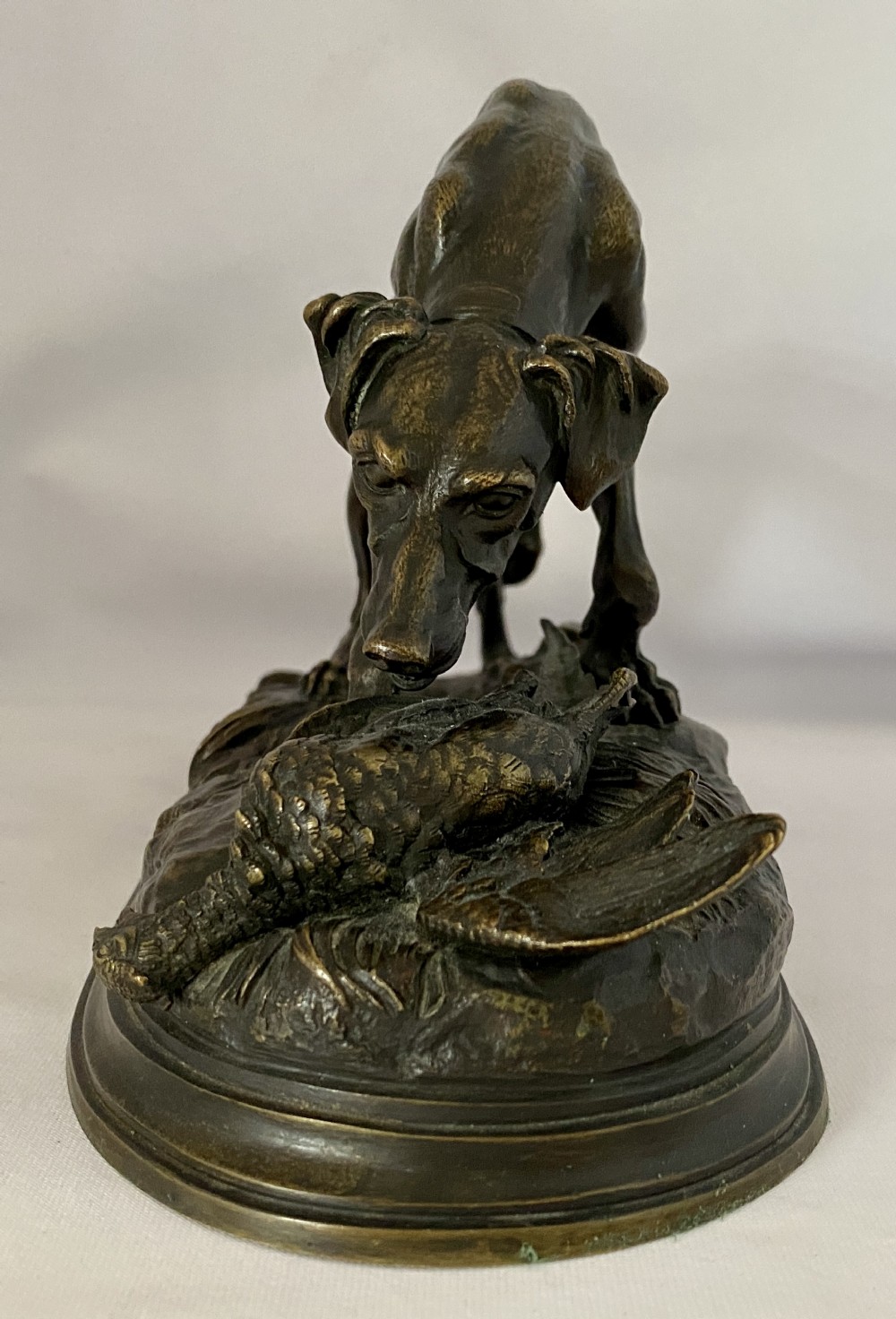 Französische Bronze Skulptur Hund mit Fasan - Bronzefigur Jagdhund auf Sockel - Französische Tier Skulptur