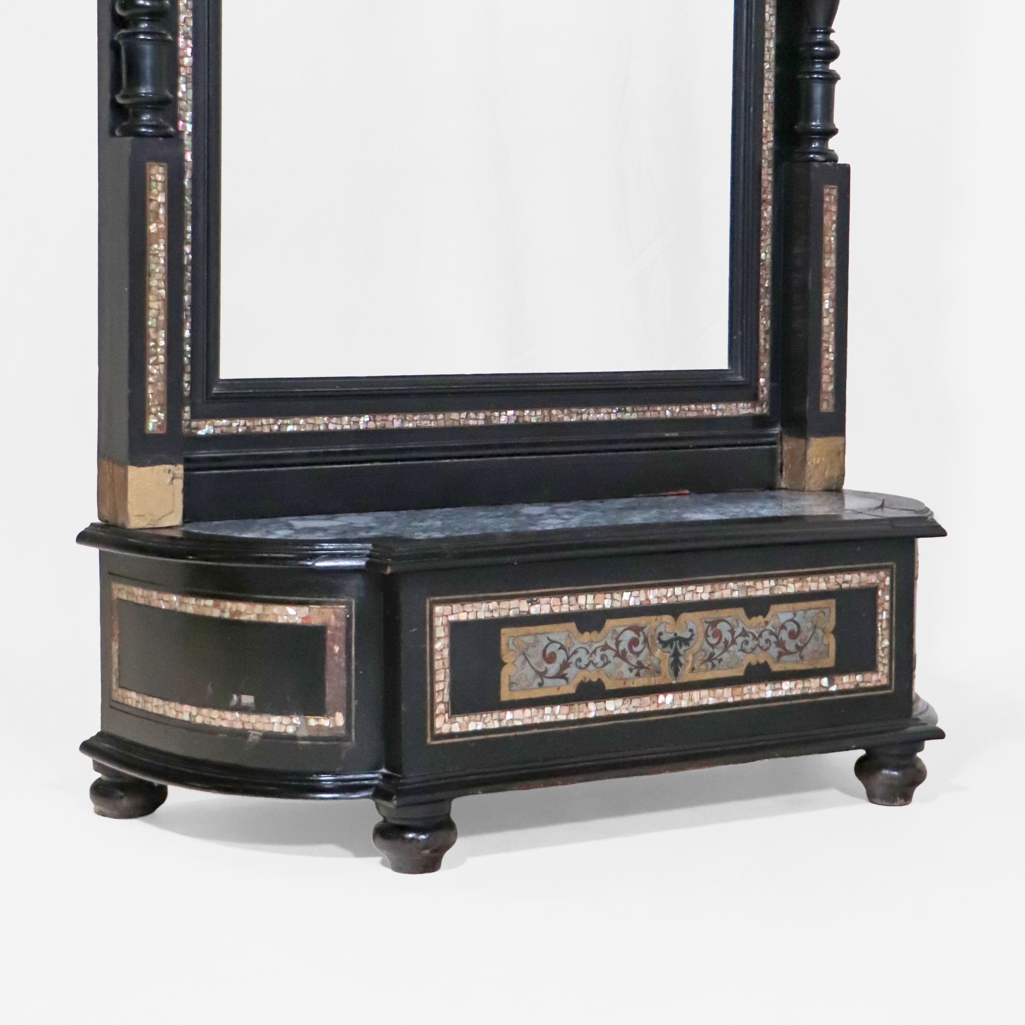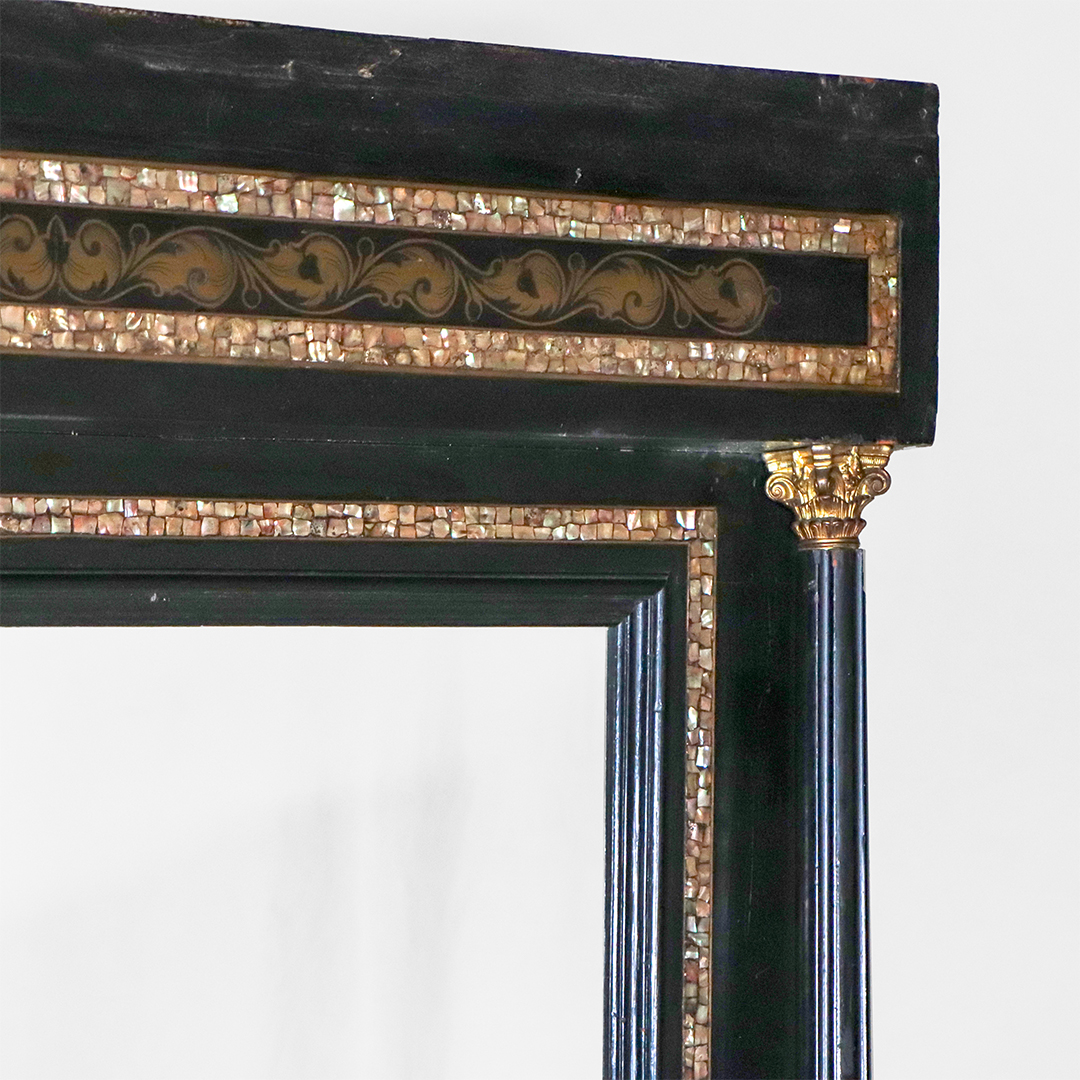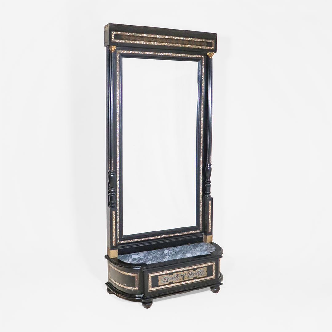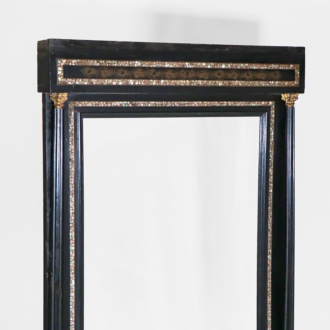 Der Spiegel zeigt die typischen Merkmale französischer Möbel des 19. Jahrhunderts. Die schwarze Fassung in Kombination mit schimmernden Perlmuttintarsien sowie feinen Ornamentbändern verleiht dem Möbelstück eine elegante und zugleich ausdrucksstarke Wirkung. Die klar gegliederte Form mit seitlichen Säulen unterstreicht den repräsentativen Charakter dieses Bodenspiegels.