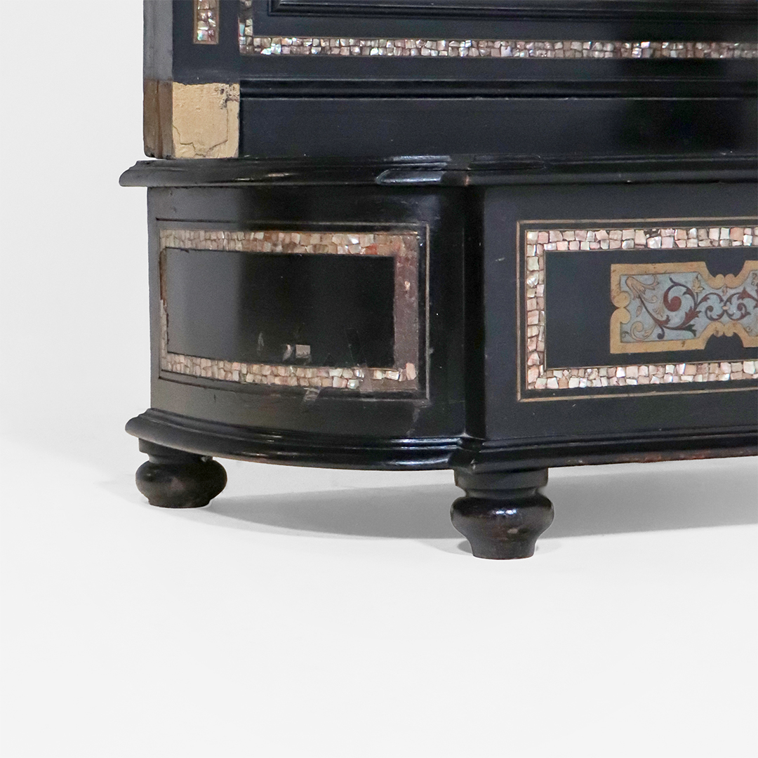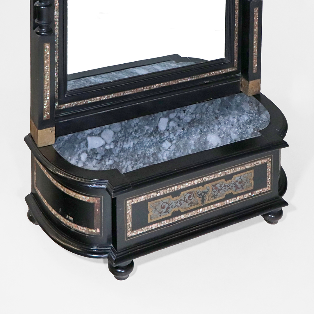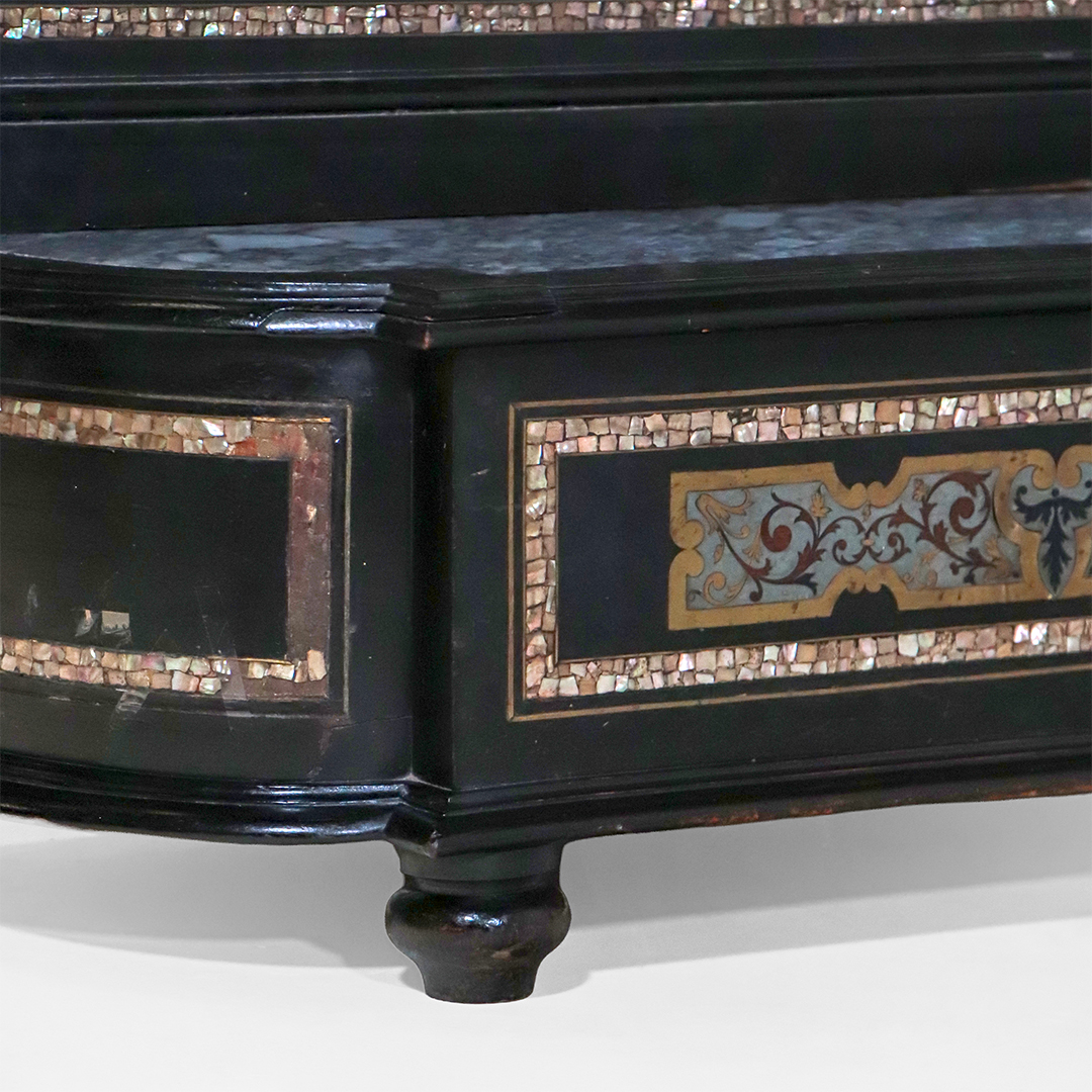 Der Korpus ist aus schwarz lackiertem Holz gefertigt und wird durch feine Perlmutt Einlegearbeiten sowie dekorative Bandintarsien akzentuiert. Besonders hervorzuheben ist die originale Marmorplatte im unteren Bereich, die dem Möbelstück zusätzliche Wertigkeit und Präsenz verleiht.