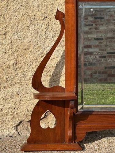 Der warme, fein gemaserte Nussbaumrahmen verleiht dem Spiegel Eleganz und Charakter. Besonders hervorzuheben sind die seitlich geschwungenen Halterungen mit Herz-Ausschnitten und kleinen Ablageflächen, die dem Stück Leichtigkeit und Charme verleihen – eine perfekte Kombination aus Funktionalität und Ästhetik.