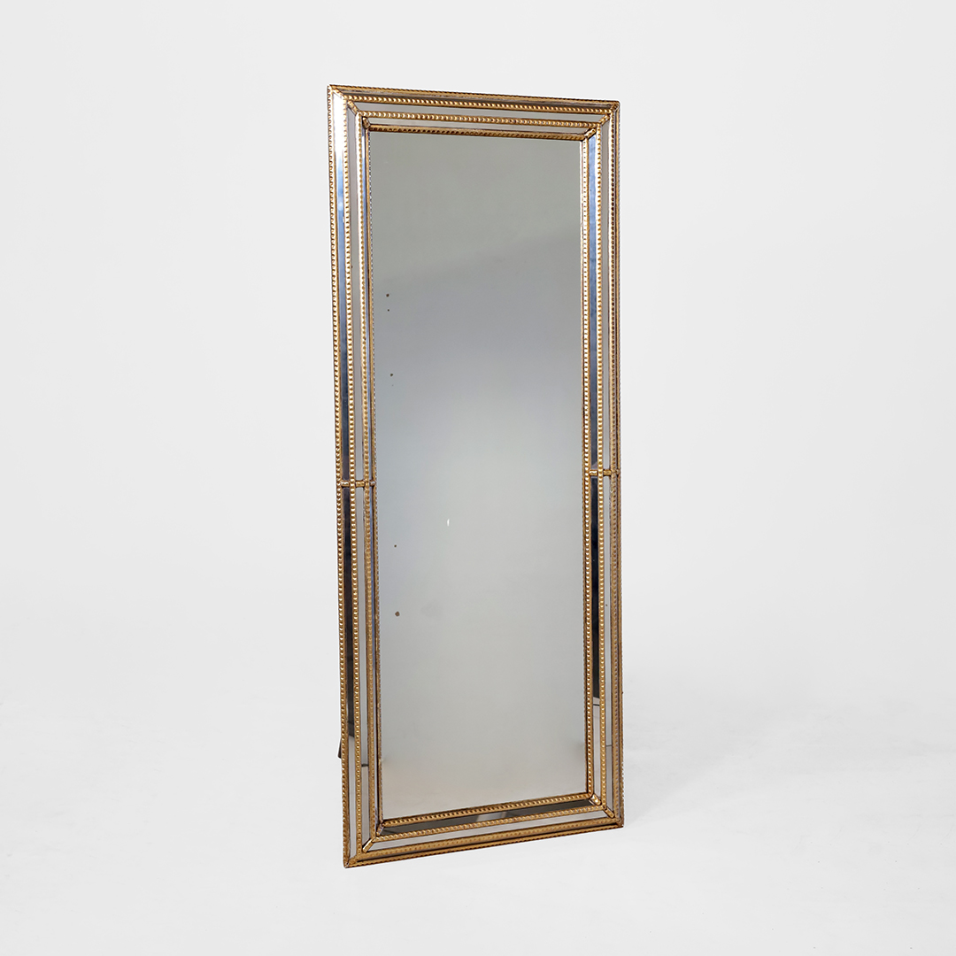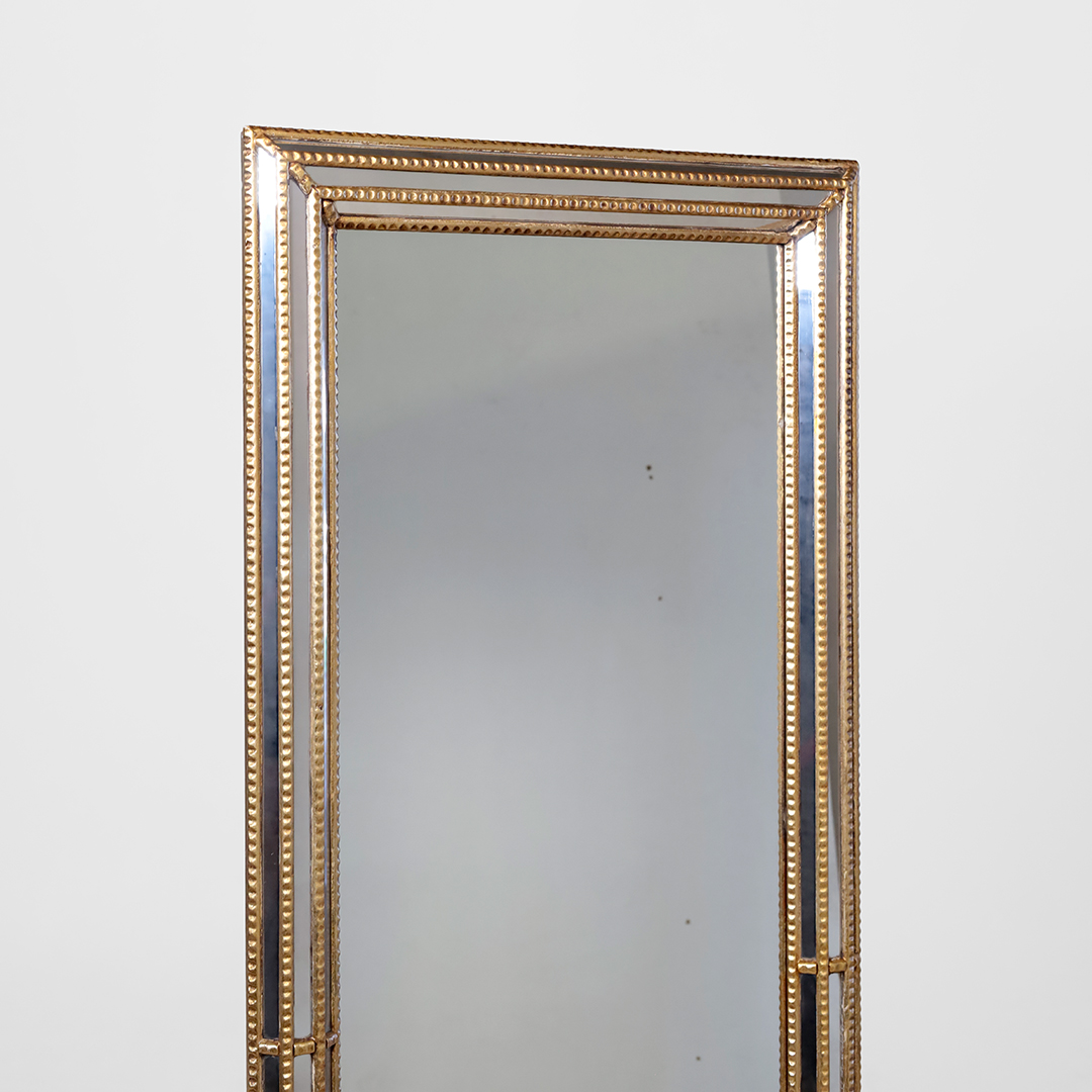 Dieser schmale Goldspiegel überzeugt durch seine klare, rechteckige Form und den fein profilierten Rahmen in antiker Anmutung. Die zurückhaltende Gestaltung macht ihn zu einem vielseitig einsetzbaren Spiegel für Flur, Wohnraum oder Schlafzimmer.