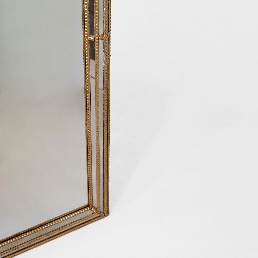 Der goldfarbene Rahmen ist dezent gearbeitet und greift klassische Gestaltungselemente historischer Spiegel auf. Feine Linien und eine schmale Profilierung sorgen für eine elegante, zeitlose Wirkung ohne überladen zu wirken.