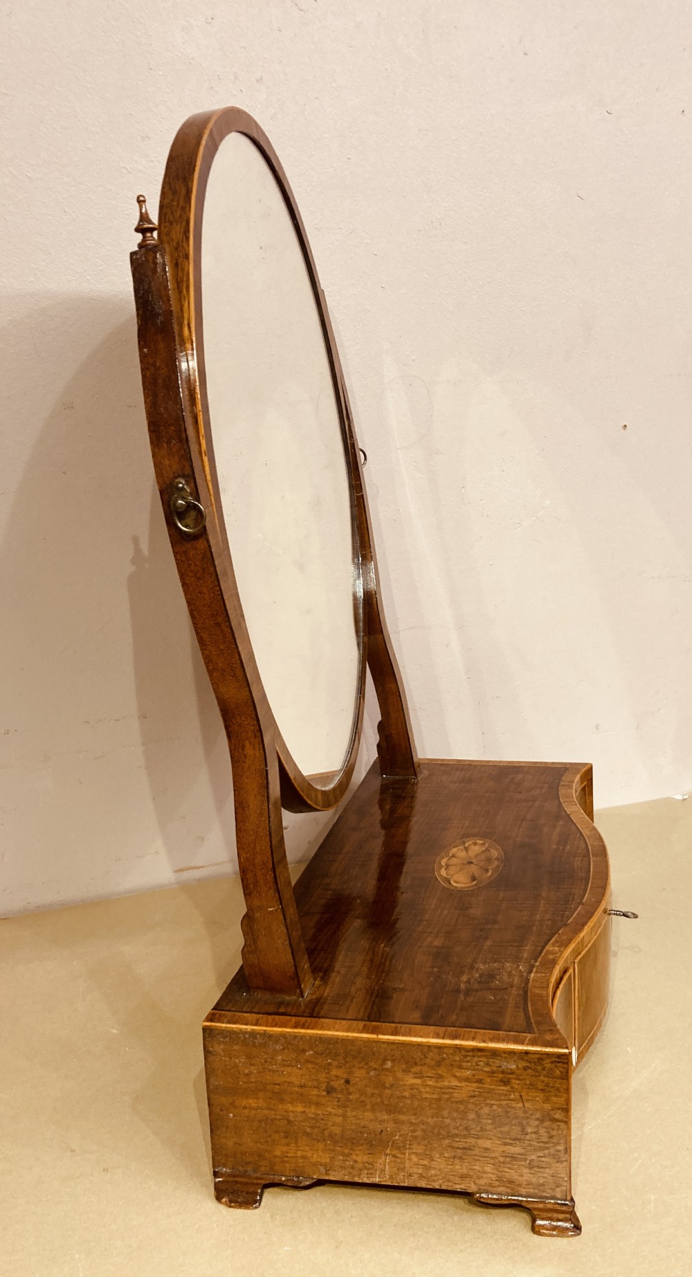 - Ausstattung: ovaler Originalspiegel, drei gezinkte Schubladen, Fiddleback-Mahagoni-Platte, geschwungene Ogee-Füße