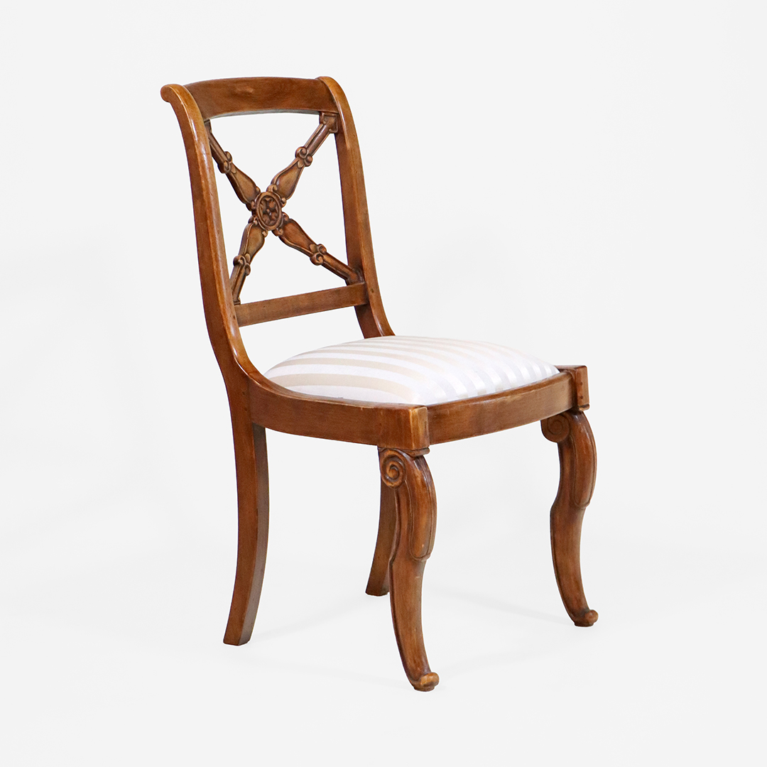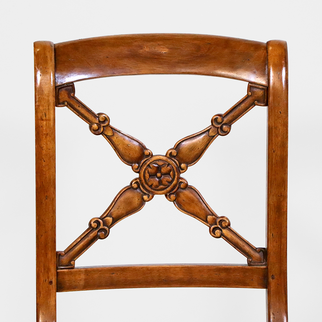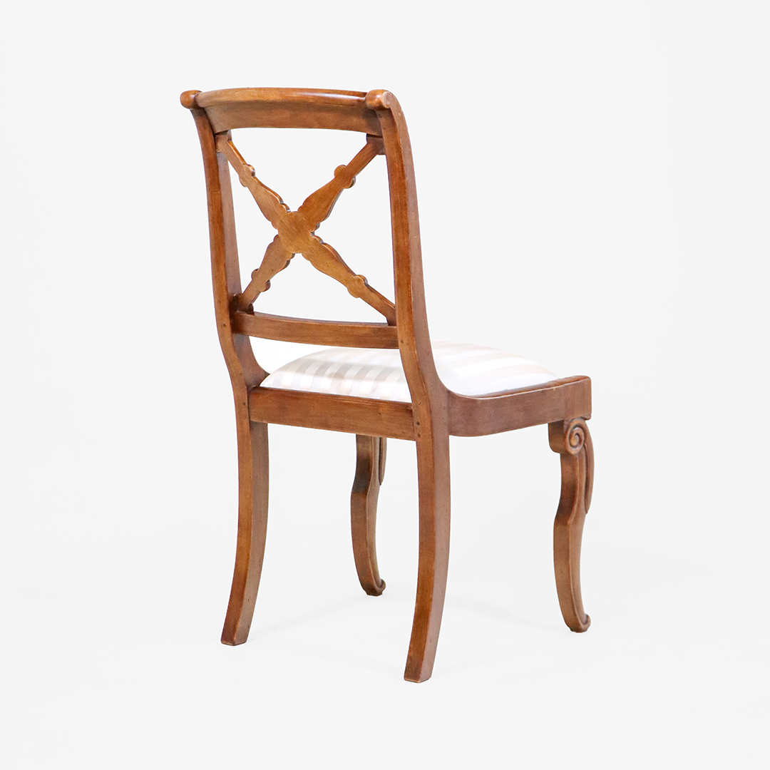 Der Esszimmerstuhl antik zeigt typische Merkmale englischer Möbel des frühen 19. Jahrhunderts. Das fein gearbeitete Kreuzmotiv im Rückenlehnenfeld sowie die harmonisch geschwungenen Beine verleihen dem Stuhl Mahagoni eine elegante und zeitlose Ausstrahlung. Die ausgewogenen Proportionen machen ihn sowohl dekorativ als auch komfortabel.