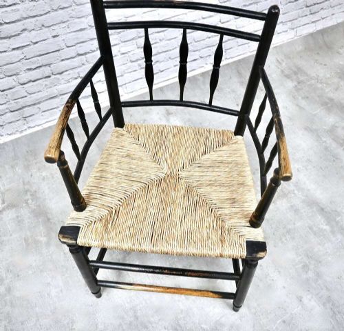 Die elegante Spindelrückenlehne und die geschwungenen Armlehnen spiegeln den unverwechselbaren Charakter der Arts & Crafts Möbel wider. Jedes Stück ist ein Unikat aus dem 19. Jahrhundert und vereint dekorative Schönheit mit Funktionalität.