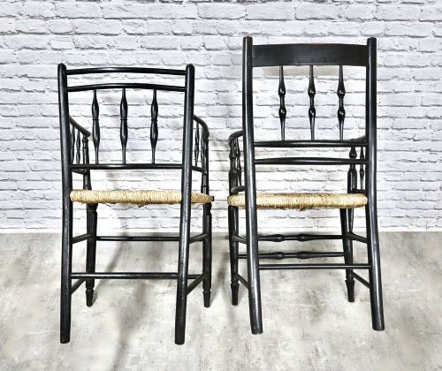 Beide Stühle befinden sich in feiner Form. Die Kombination aus ebonisiertem Holz, Naturgeflecht und handgedrechselten Spindeln macht sie zu echten Highlights für Sammler und Liebhaber von englischen Antiquitäten.