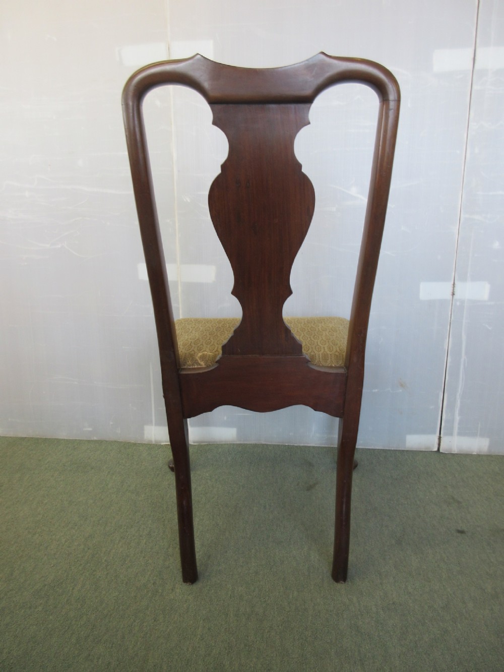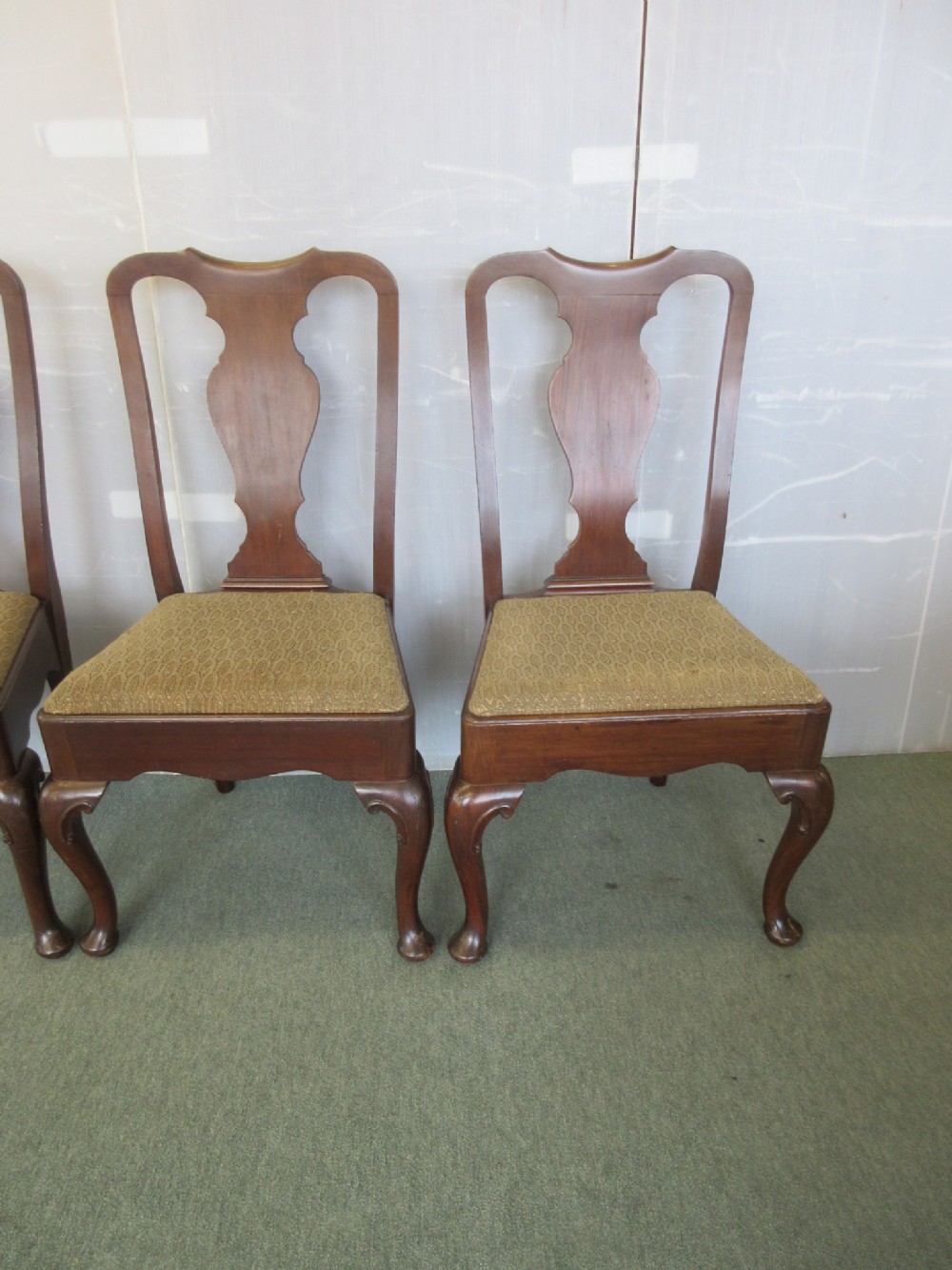 - Gestaltung: kräftige Cabriole-Beine mit Schnitzereien, tiefer Sitzrahmen, gepolsterte Push-Out-Sitze, Splat Back Lehne