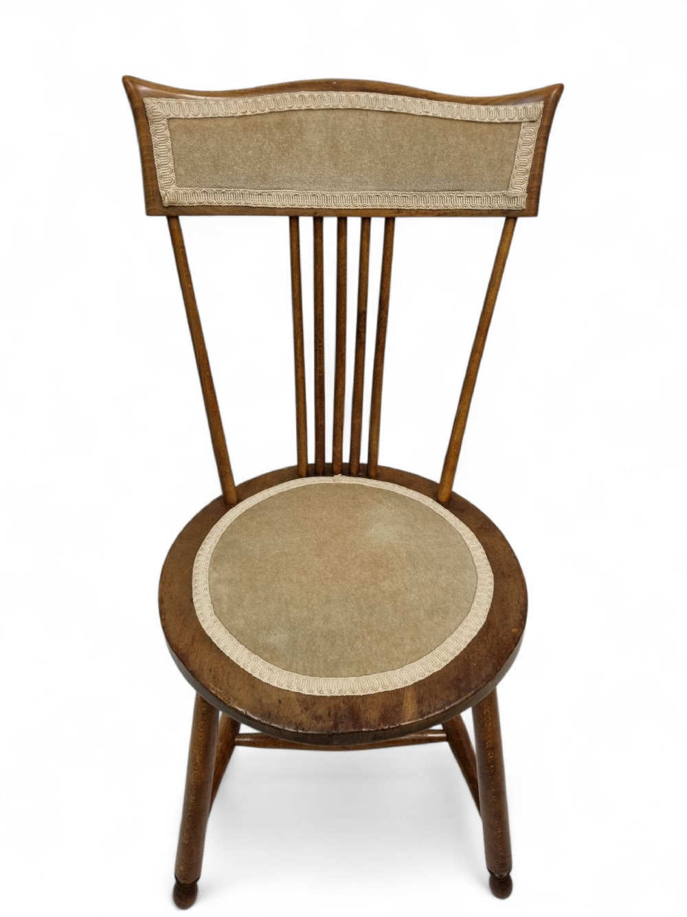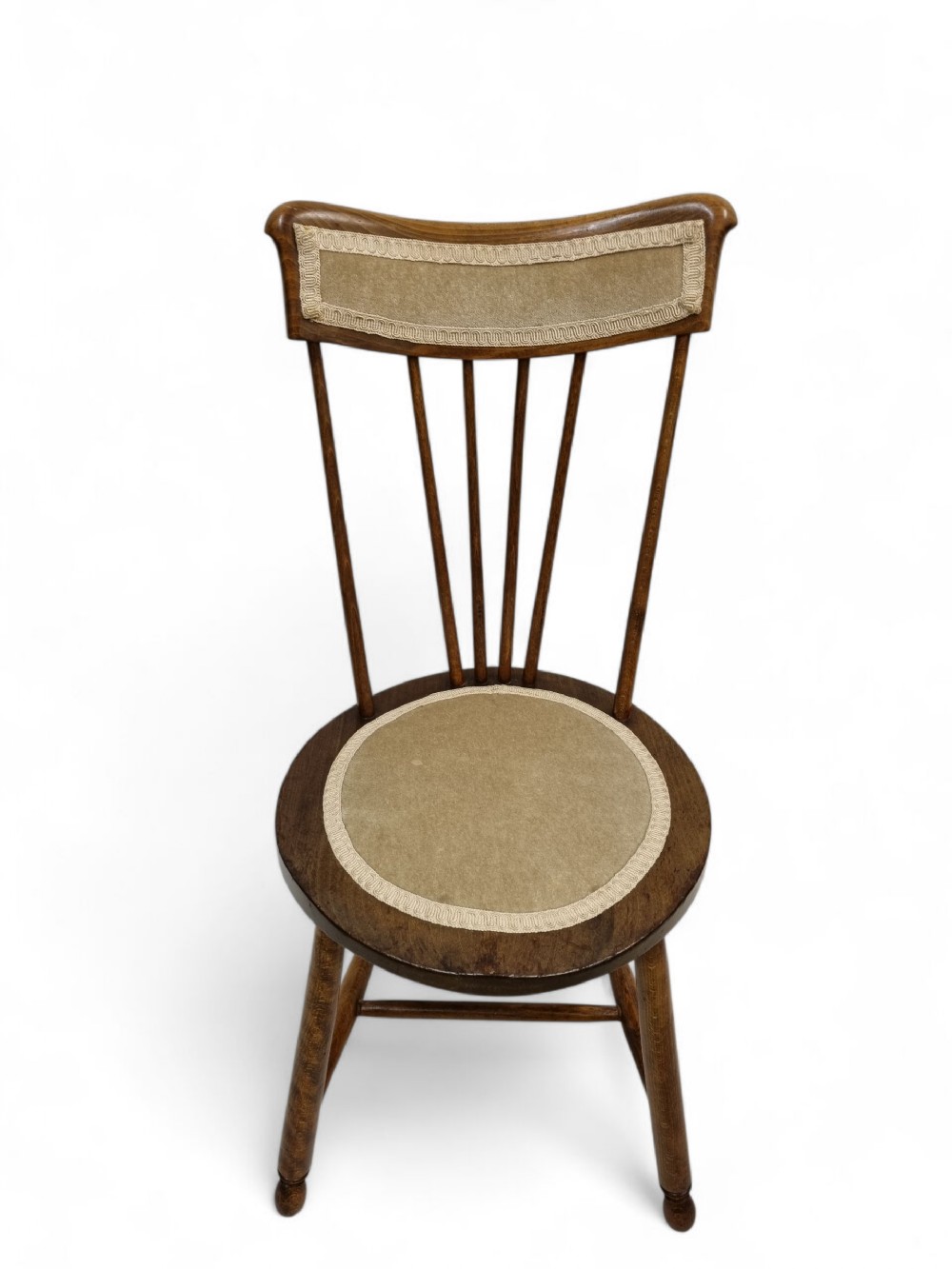 Die gedrechselten Beine sind durch Querstreben verbunden, was den Stühlen Stabilität und eine harmonische Form verleiht.