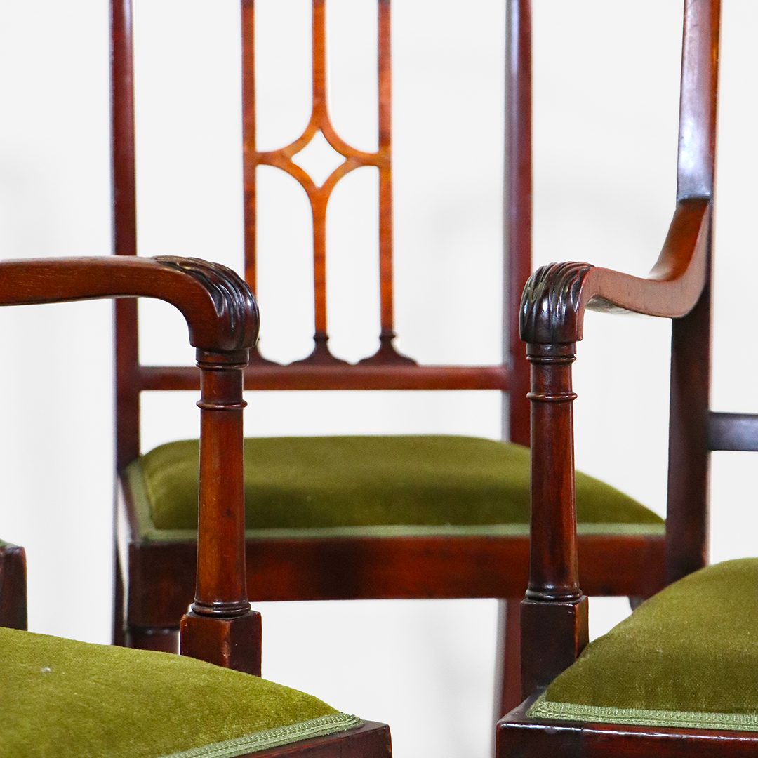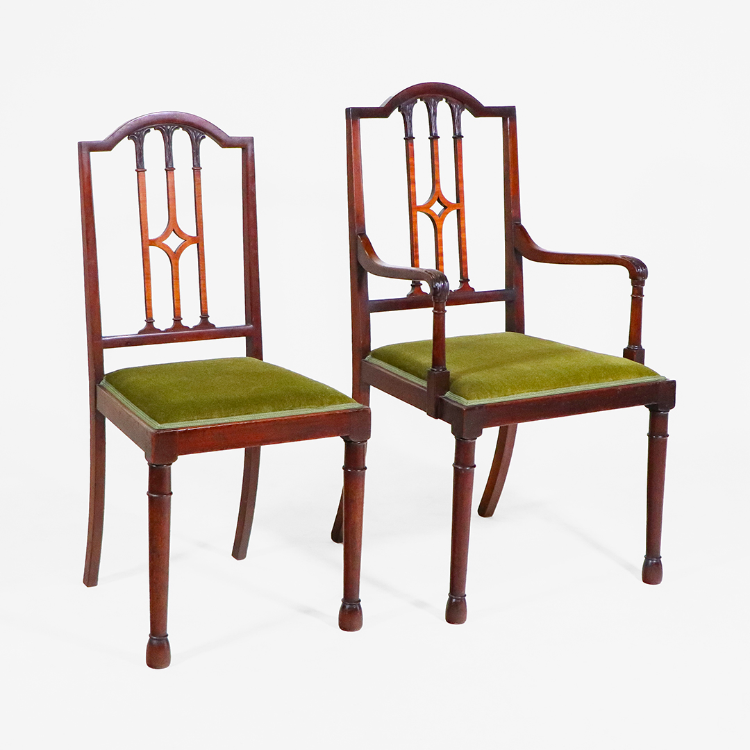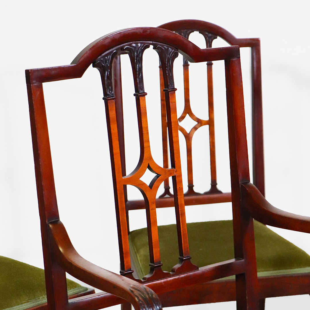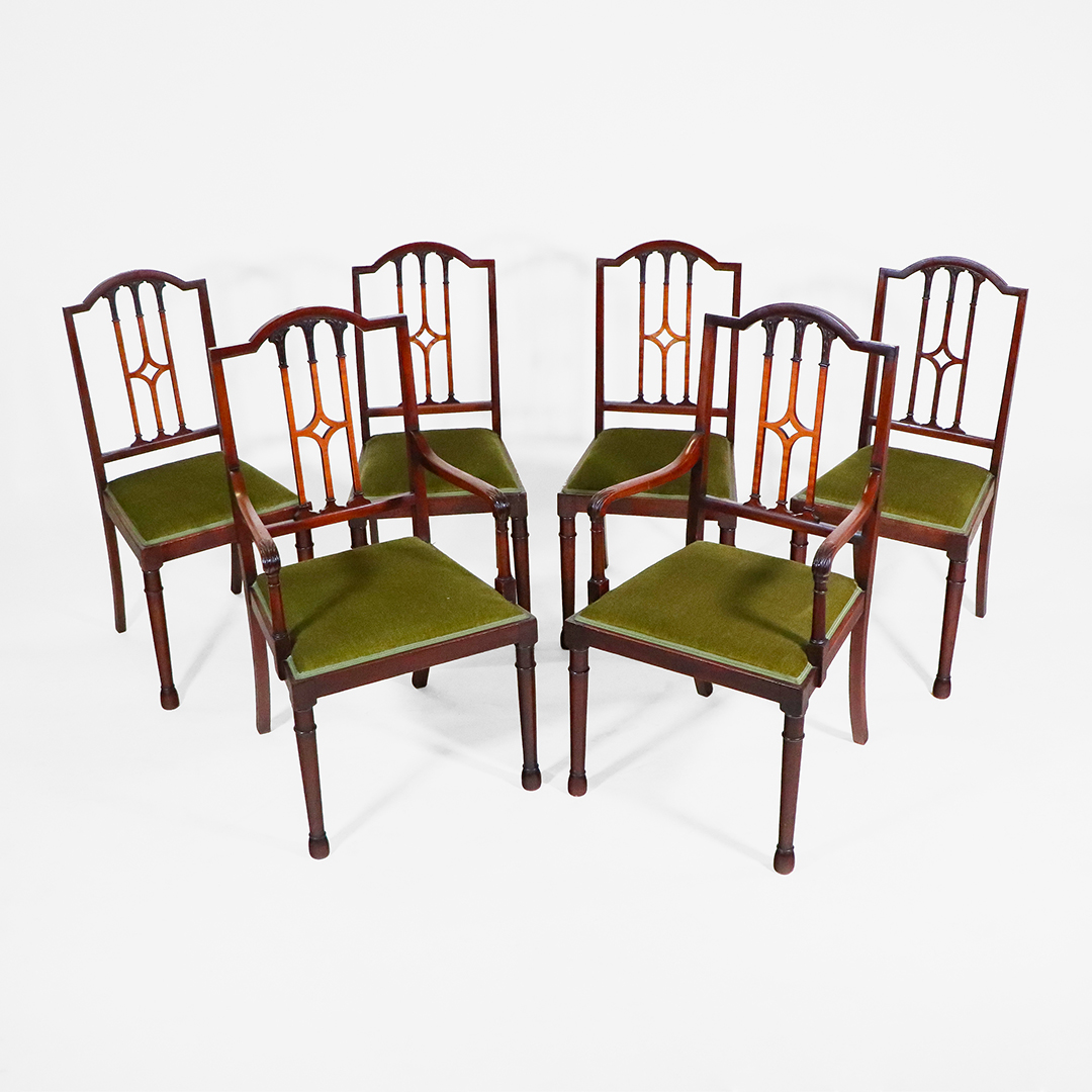 Die Stühle zeigen die klaren Linien des Sheraton-Stils: durchbrochene Rückenlehnen mit leichtem Gothic-Einfluss, fein gedrechselte Vorderbeine und eine insgesamt elegante, ausgewogene Formensprache. Das Set aus vier Seitenstühlen und zwei Armlehnstühlen sorgt für ein harmonisches Gesamtbild am Tisch.