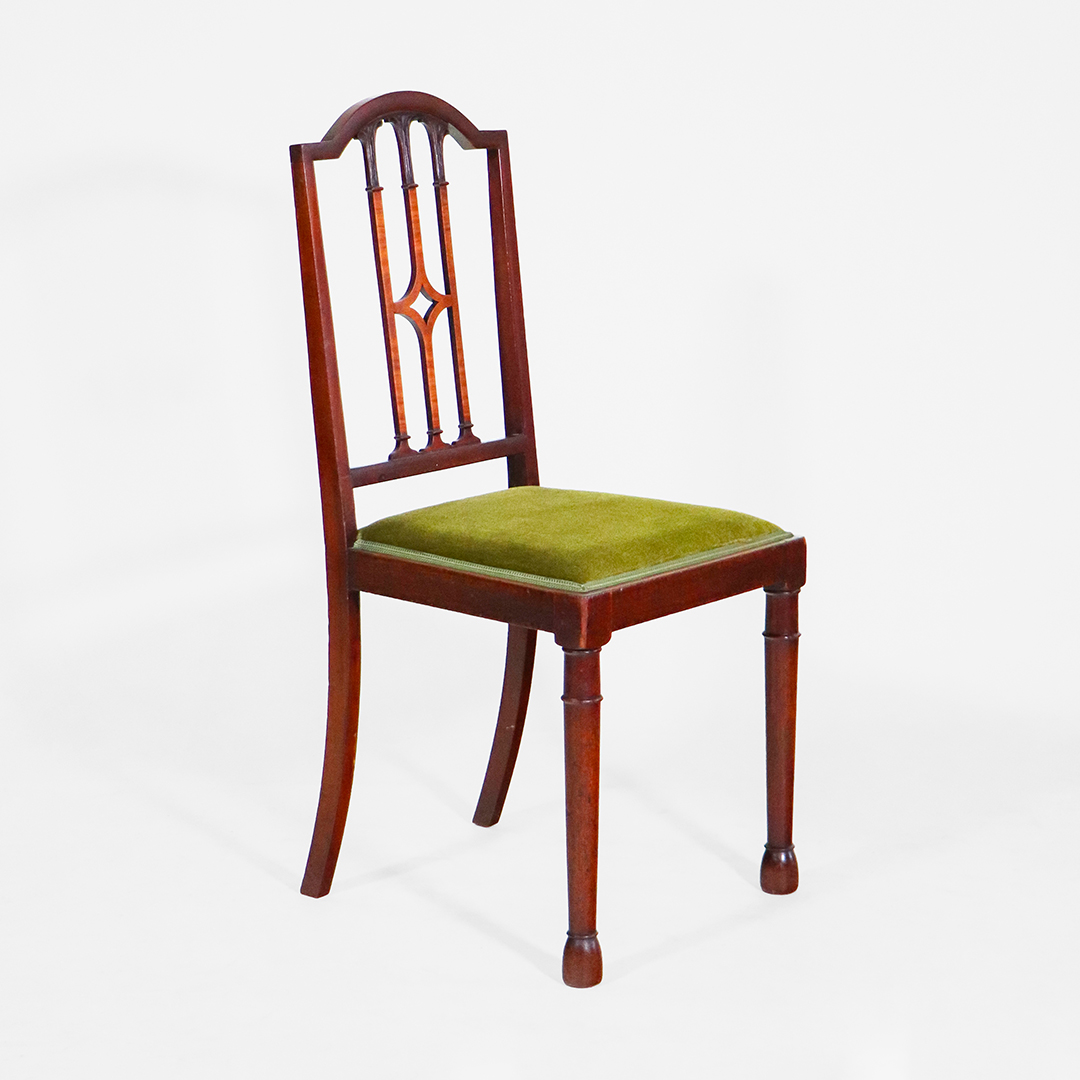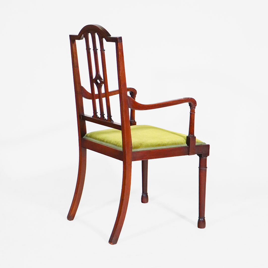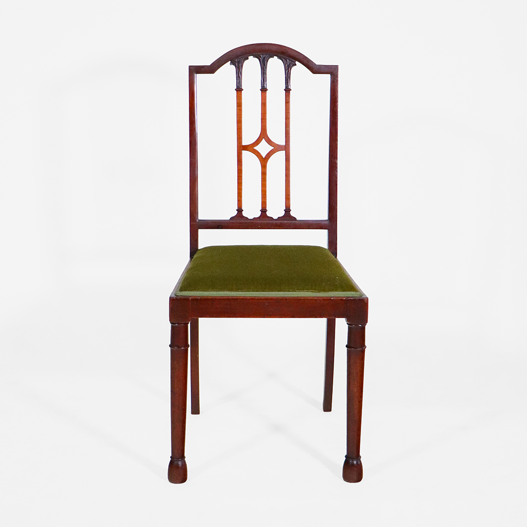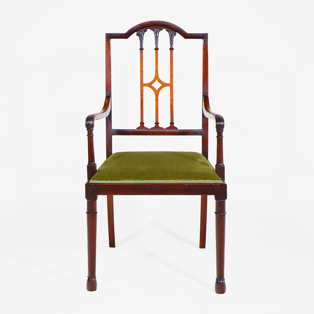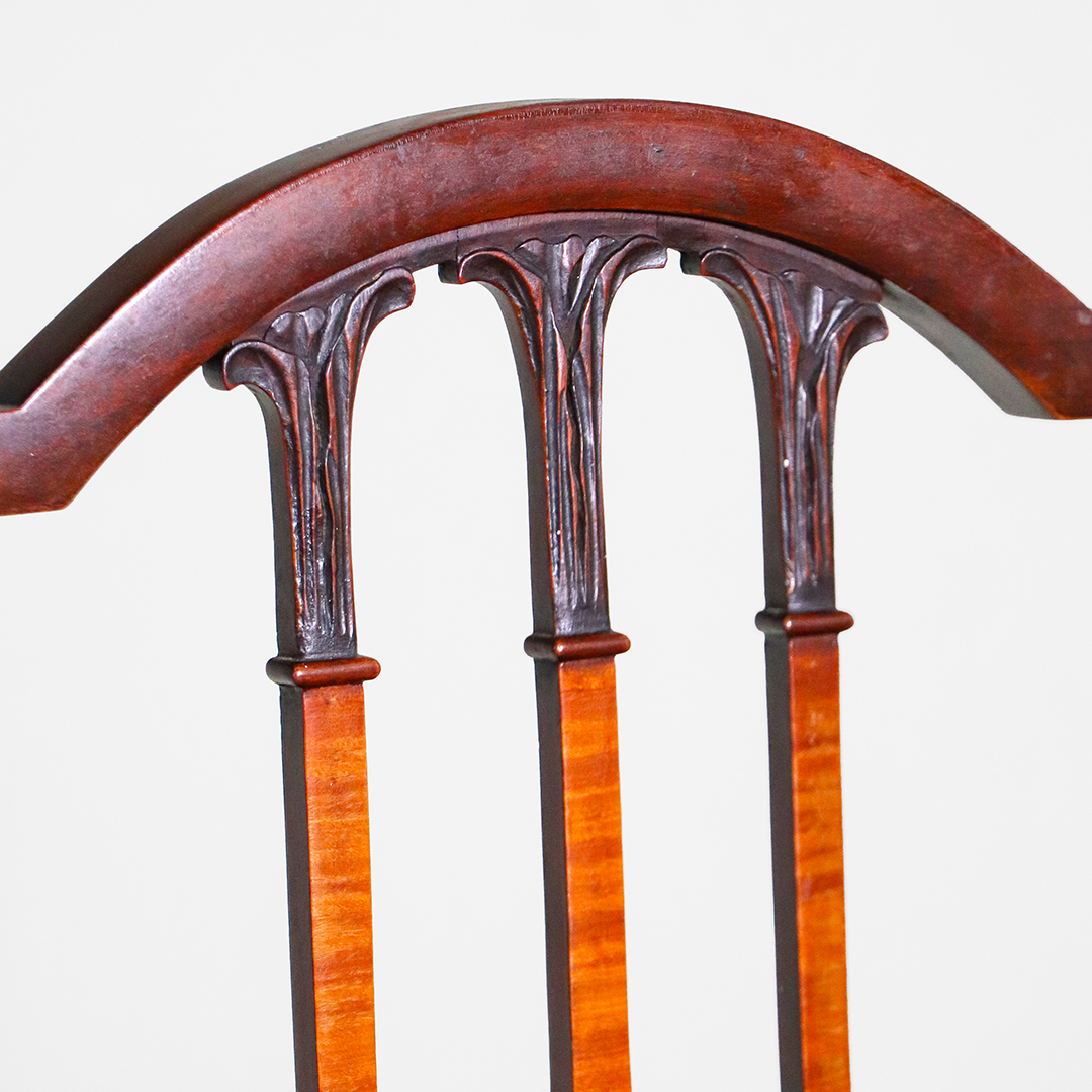 Die Stühle zeigen die klaren Linien des Sheraton-Stils: durchbrochene Rückenlehnen mit leichtem Gothic-Einfluss, fein gedrechselte Vorderbeine und eine insgesamt elegante, ausgewogene Formensprache. Das Set aus vier Seitenstühlen und zwei Armlehnstühlen sorgt für ein harmonisches Gesamtbild am Tisch.