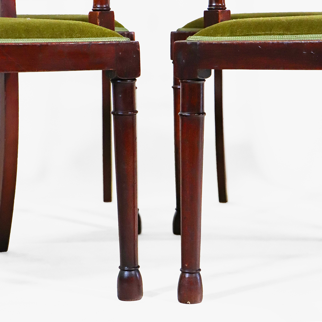 Gefertigt aus massivem Mahagoni, warm im Ton und fein verarbeitet. Die Sitzflächen sind mit einem grünen, samtartigen Stoff bezogen, der weich wirkt und den historischen Charakter gut unterstützt. Die Konstruktion ist stabil und auf alltägliche Nutzung ausgelegt.