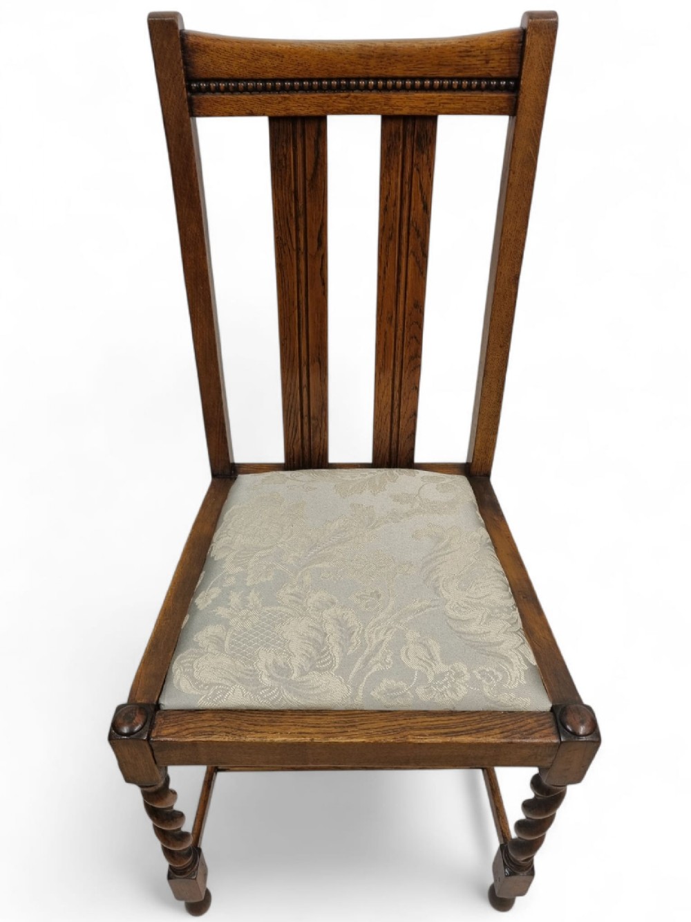 Die Stühle besitzen eine geschlitzte Rückenlehne mit schlicht geschnitztem Abschluss, gedrehte Vorderbeine sowie stabile Verbindungsstreben. Die neue Polsterung sorgt für zusätzlichen Sitzkomfort.