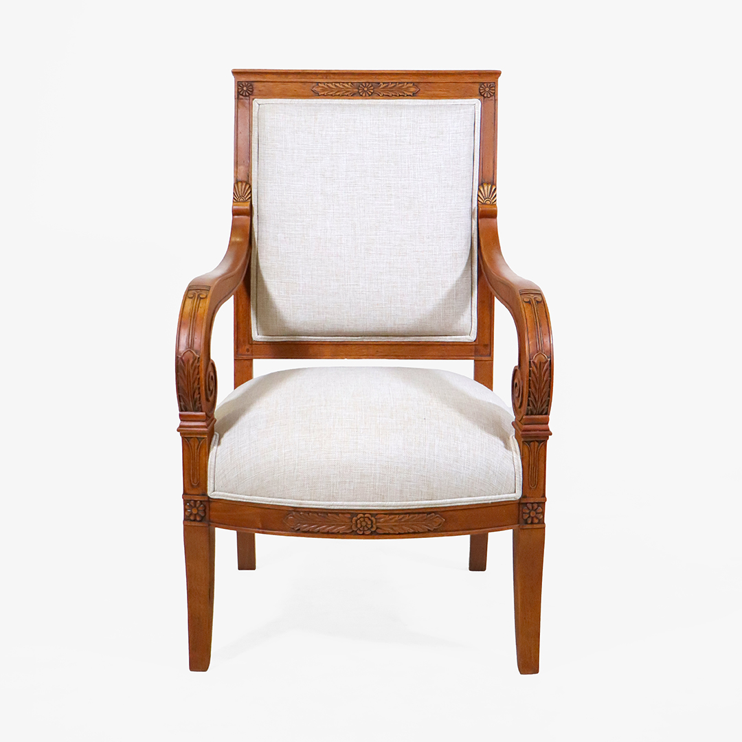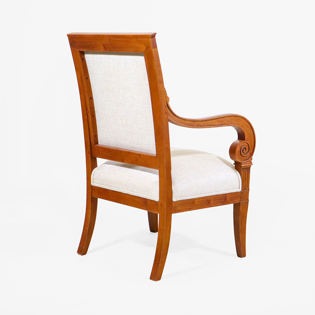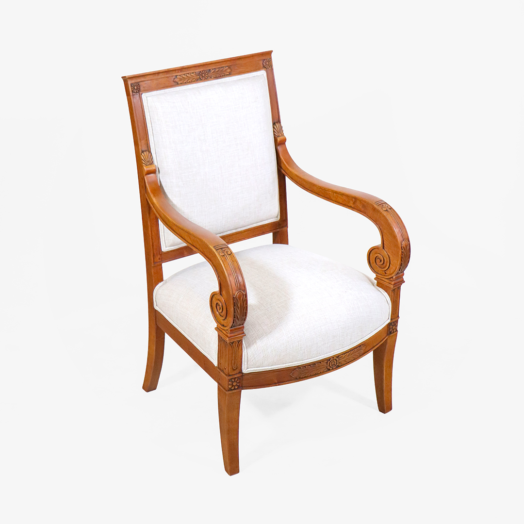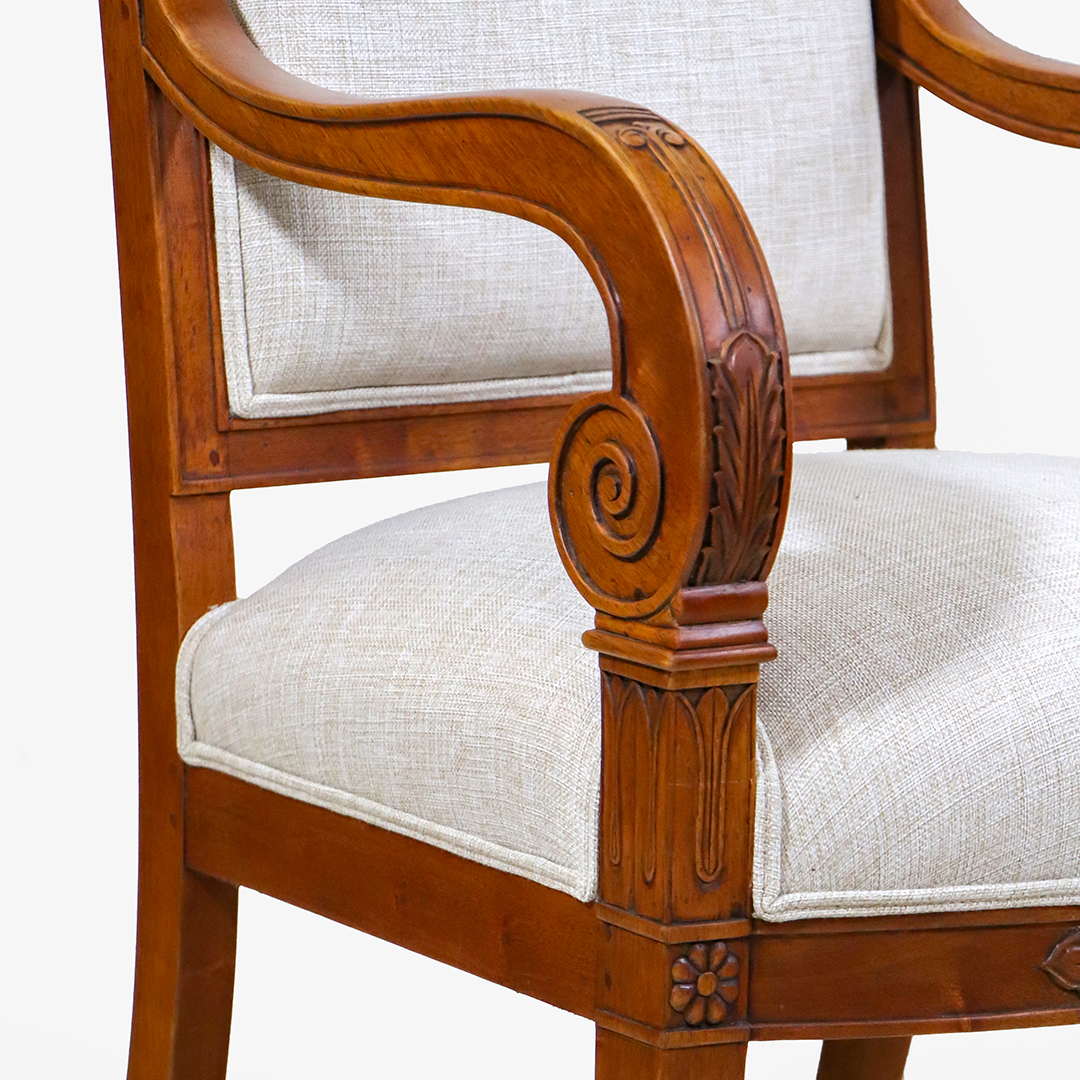 Gefertigt aus massivem Nussbaumholz, überzeugen die Armlehnstühle durch Stabilität und eine warme Holzfarbe. Von Hand geschnitzte Voluten und florale Motive an Rahmen und Lehnen unterstreichen den klassischen Stil und zeigen handwerkliche Detailarbeit.