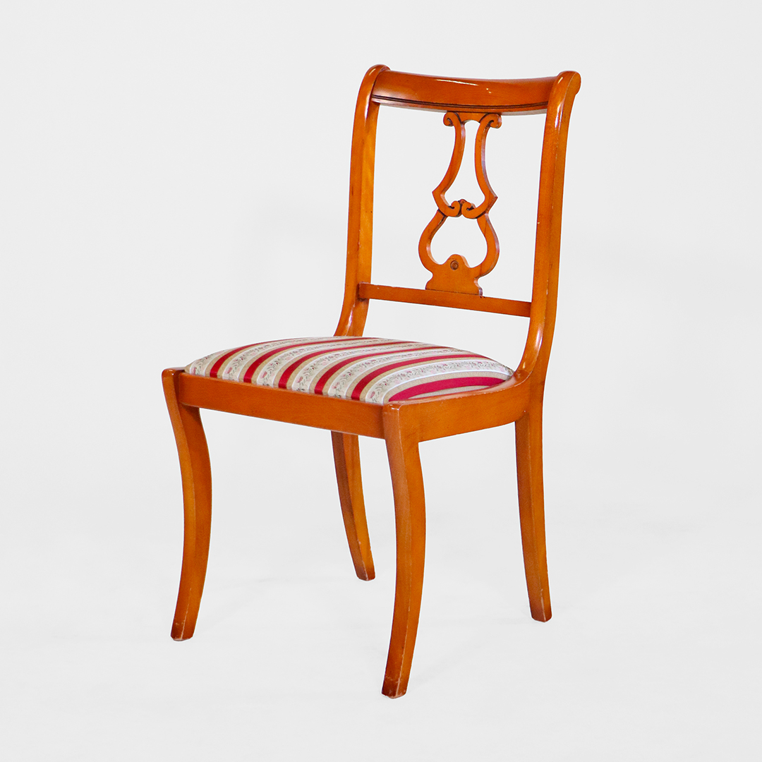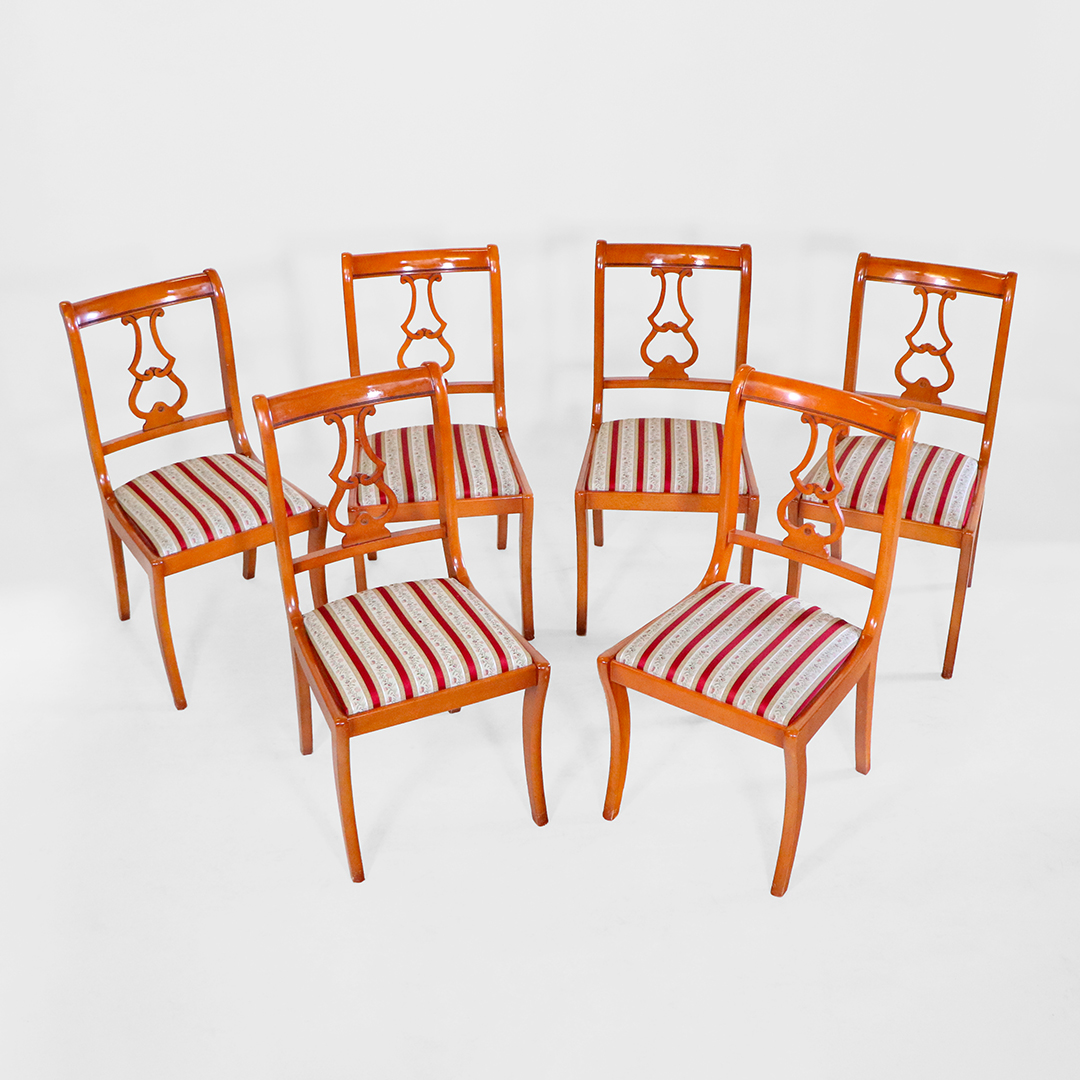 Das charakteristische Lyra-Motiv im Rücken ist ein klassisches Element des englischen Sheraton-Regency-Stils und macht jedes Stück zu einem stilvollen Blickfang am Esstisch.