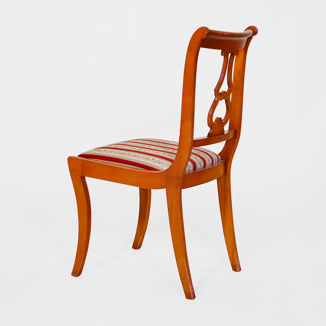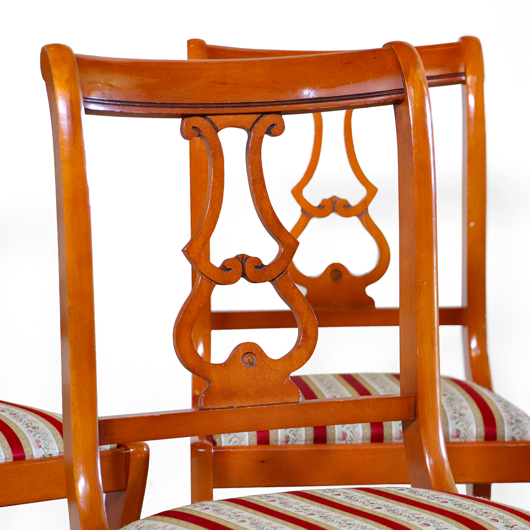 Diese Stühle orientieren sich an den eleganten Vorbildern des frühen 19. Jahrhunderts. Die geraden, fein proportionierten Beine und die offene Rückenlehne mit Lyrendekor verleihen ihnen eine leichte, klassische Optik, die typisch für den englischen Neoklassizismus ist.