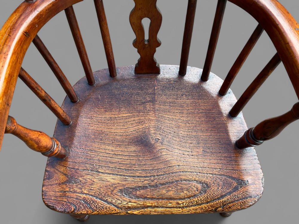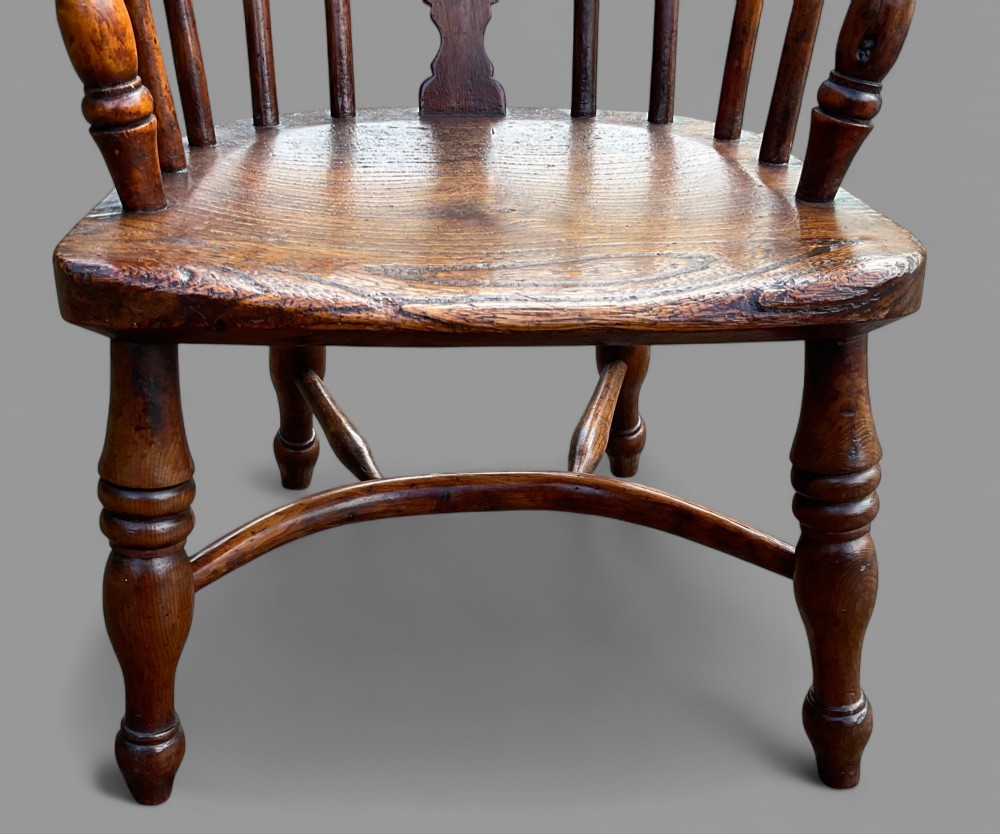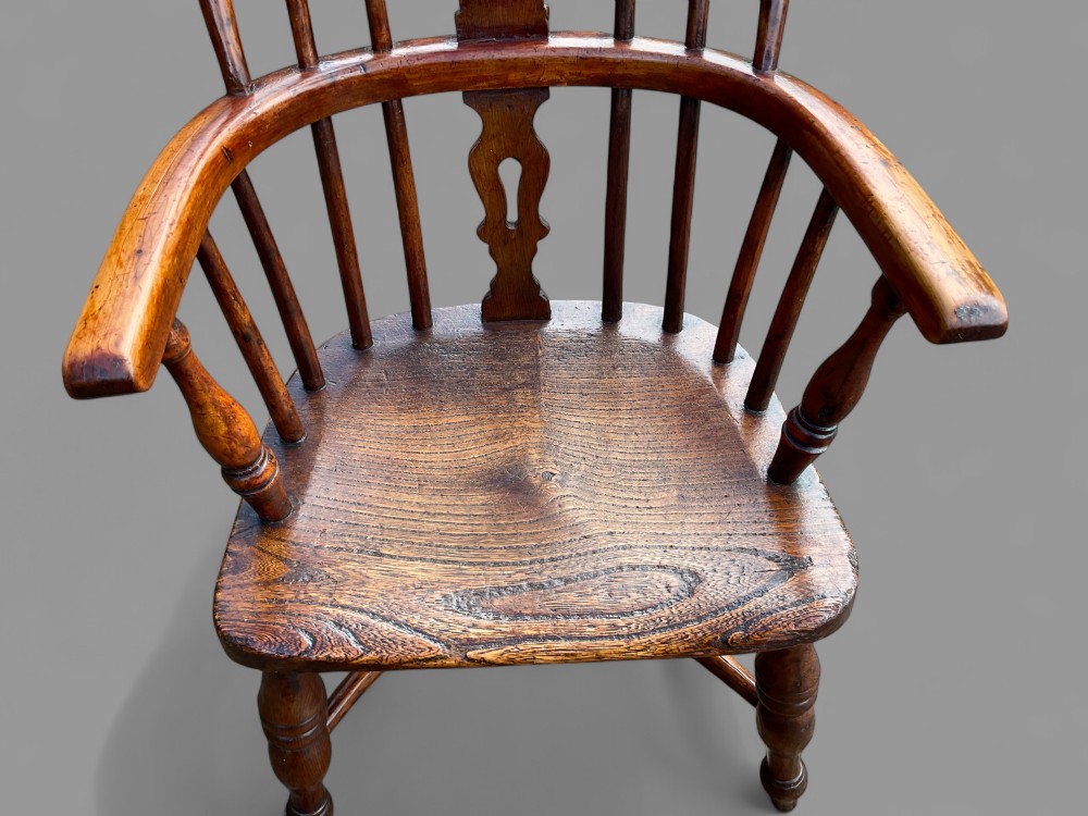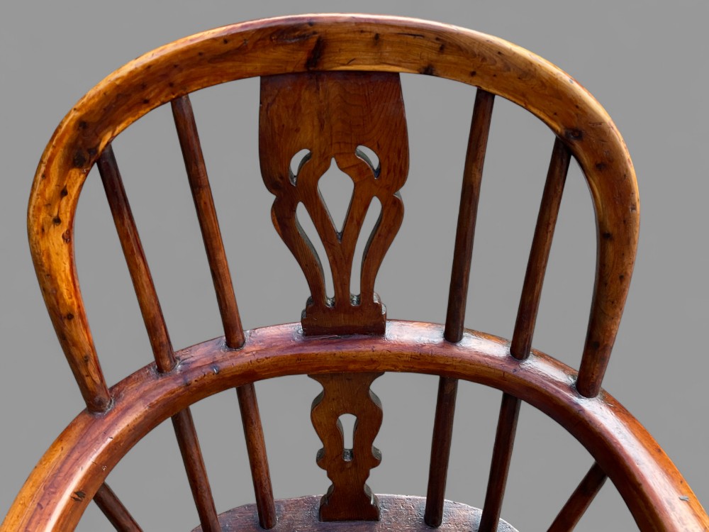 Der Stuhl zeigt die typische Windsor-Form mit geschweifter Rückenlehne, zierlicher Mittel-Schnitzerei und gedrechselten Stützen. Die runden Armlehnen und die stabile Bauweise machen ihn zu einem zugleich dekorativen und praktischen Stück.
