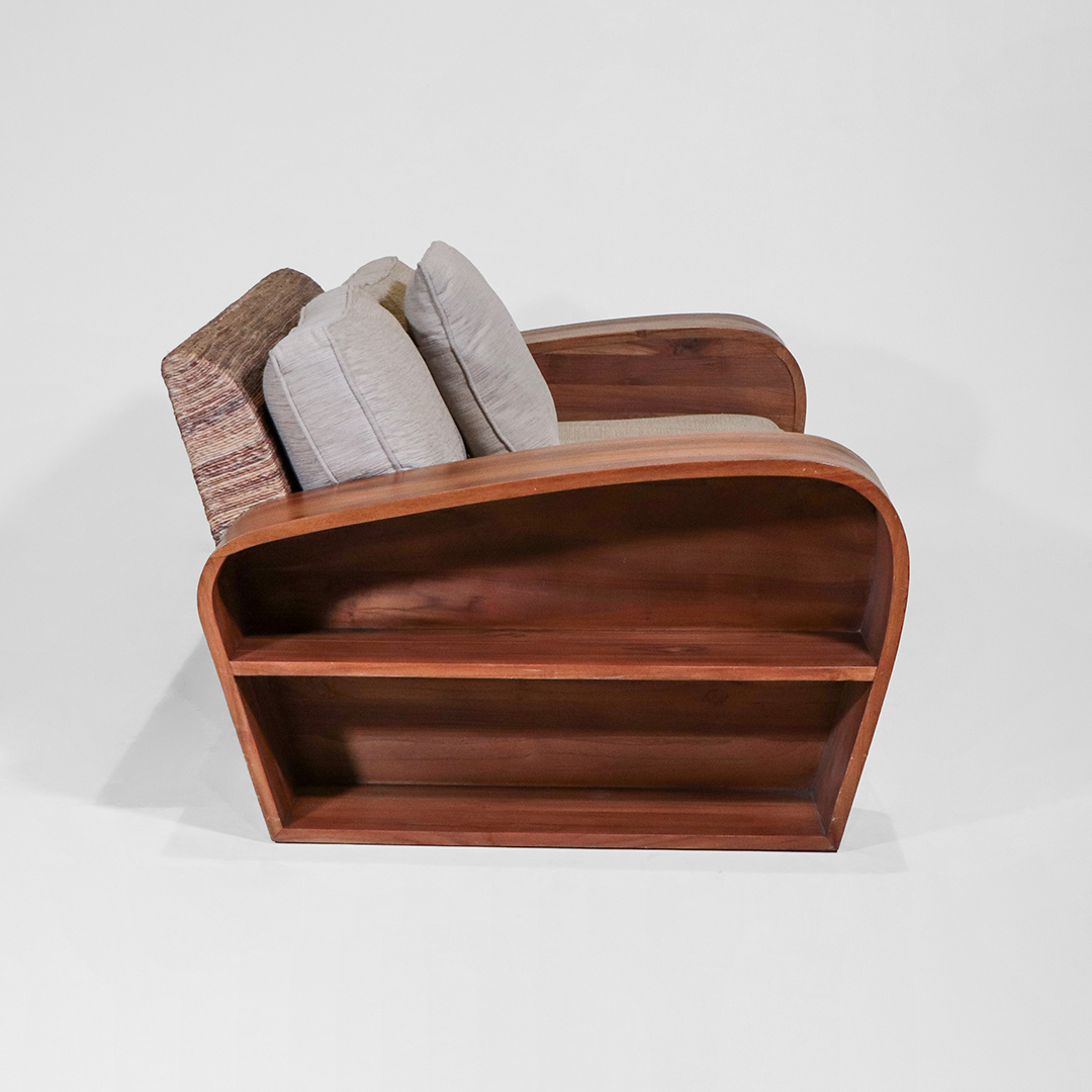 Die geschwungenen, voluminösen Armlehnen sind typisch für den Art Deco Stil und prägen das Gesamtbild. Gleichzeitig bringen die offenen Regalfächer praktische Funktion in das Design und machen das Sofa besonders vielseitig im Alltag.