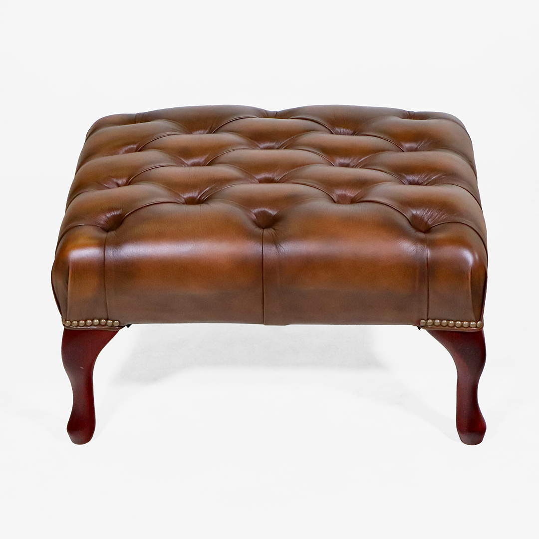 Getragen wird der Hocker von elegant geschwungenen Queen Anne Füßen aus Mahagoni. Die klassische Beinform verleiht dem Möbel Leichtigkeit und unterstreicht den traditionellen Chesterfield Charakter.