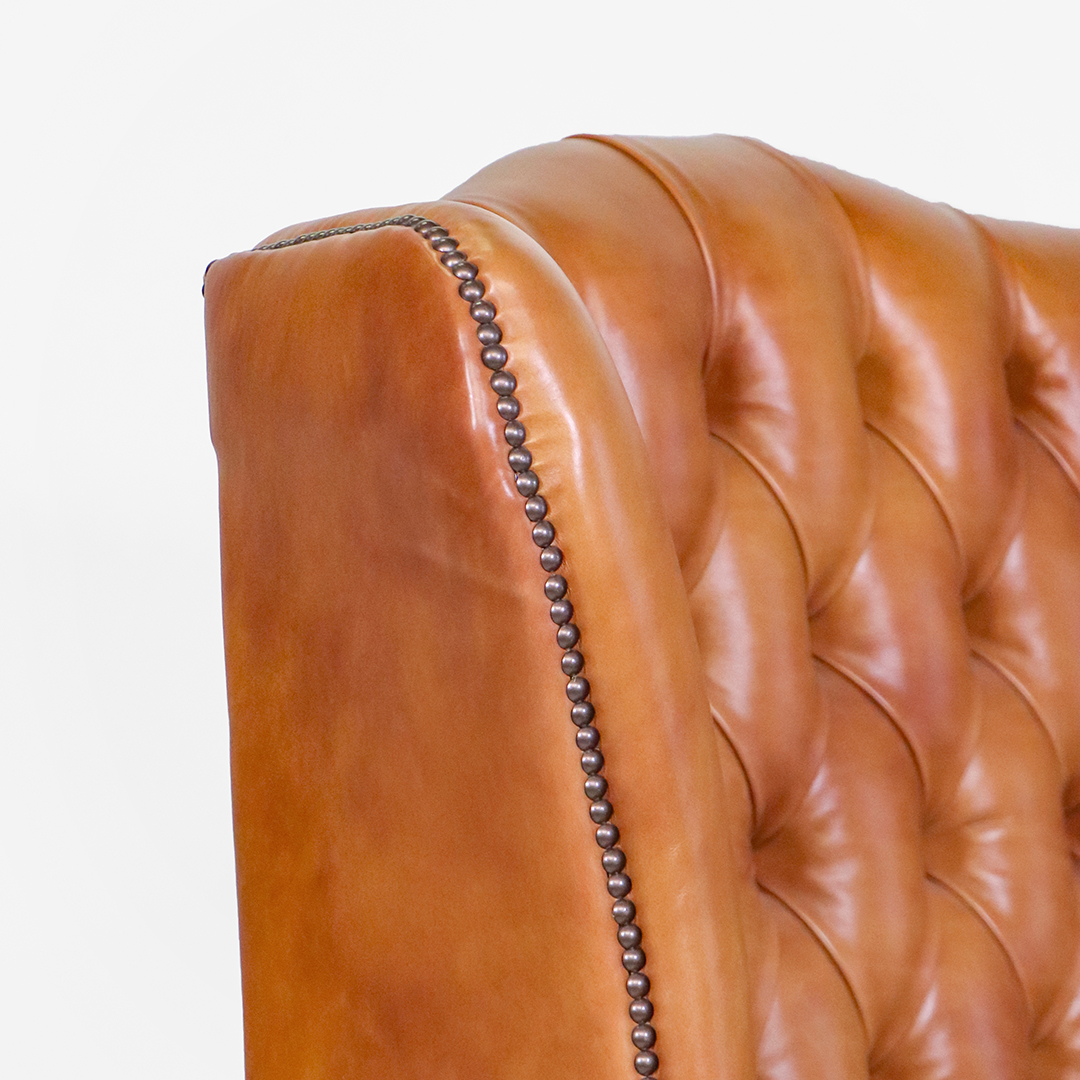 Die markante Rückenlehne mit Kapitonierung verleiht diesem Ohrensessel seinen charakteristischen Chesterfield-Look. Sie bietet nicht nur eine elegante Optik, sondern auch hohen Sitzkomfort.