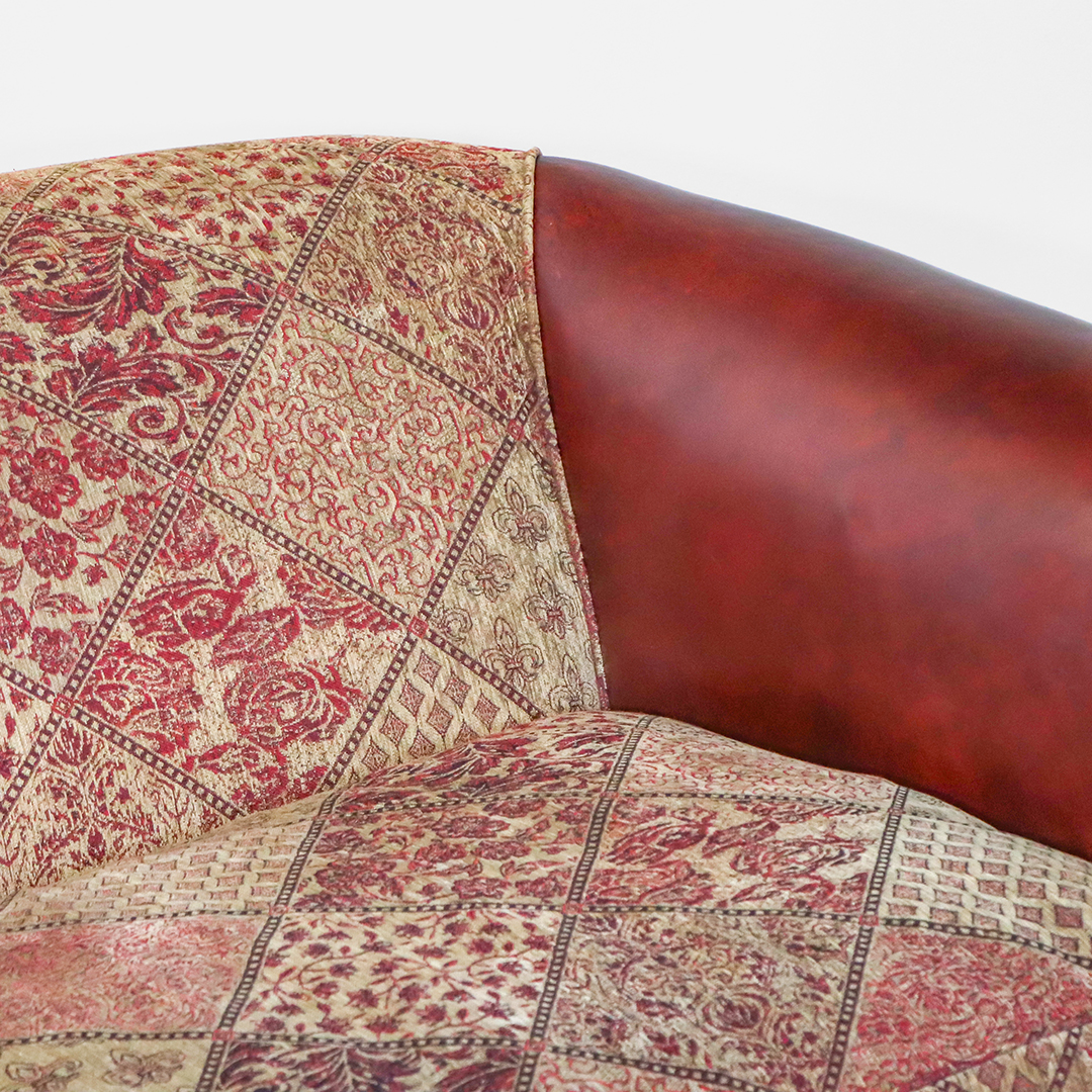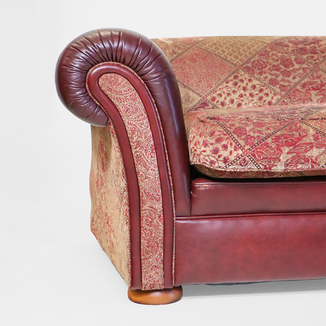 Dieses exklusive Chesterfield Sofa 3 Sitzer vereint traditionelles britisches Handwerk mit zeitlosem Design. Der Rahmen besteht aus massivem Buchenholz und garantiert Stabilität und Langlebigkeit. Die Sitzfläche sowie Rücken- und Außenseiten sind mit hochwertigem Stoff im Patchwork-Look bezogen, während die Armlehnen und die Frontpartie in edlem, bordeauxrotem Echtleder verarbeitet sind. Das Zusammenspiel von Stoff in warmen Rot- und Beigetönen mit floralen und ornamentreichen Mustern verleiht dem Sofa seinen besonderen Charakter und eine wohnliche Eleganz.