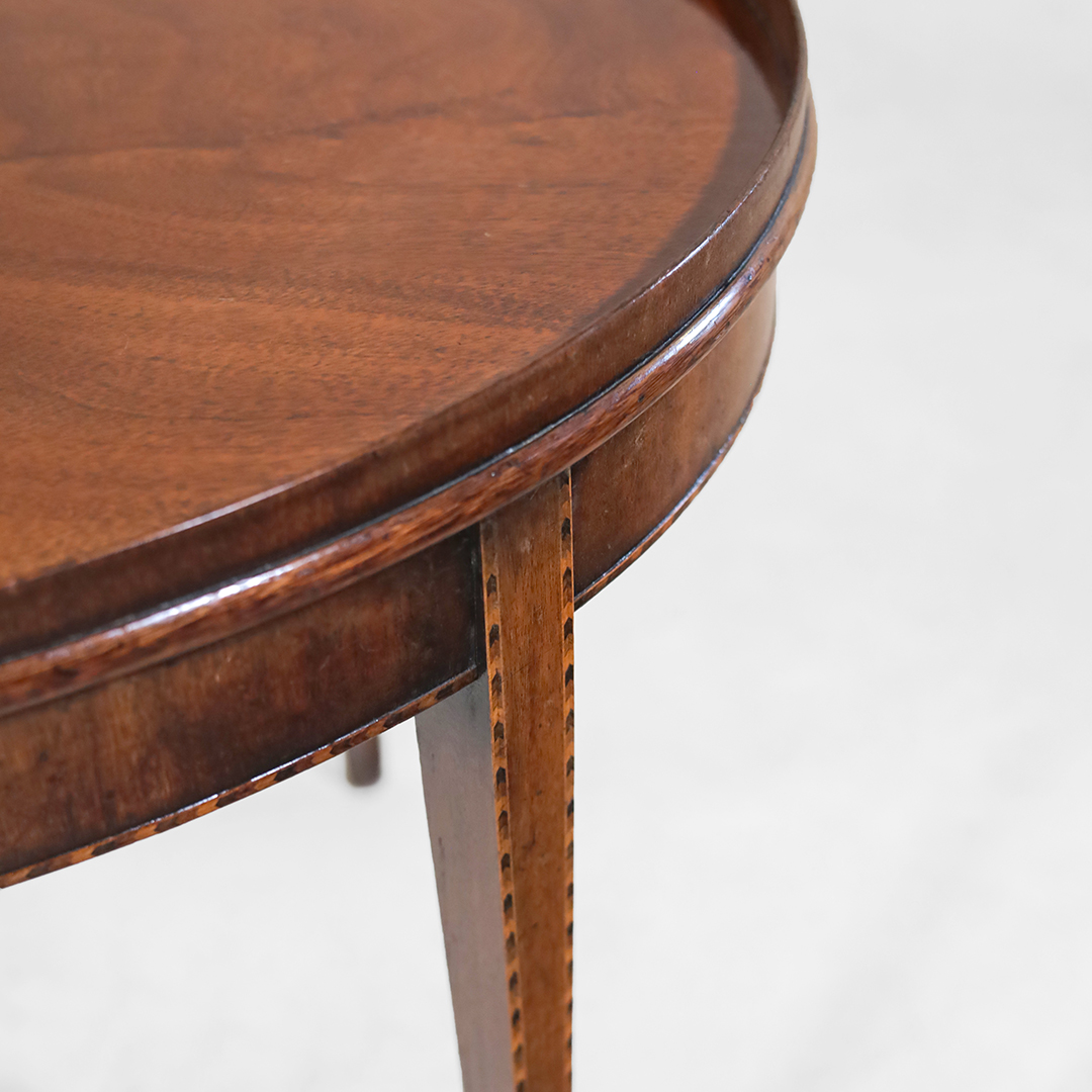 Dieser englischer Sofatisch wurde aus hochwertigem Mahagoni gefertigt – einer Holzart, die für ihre Tiefe, Eleganz und langlebige Qualität bekannt ist. Die ovale Tischplatte zeigt eine sehr schöne Maserung, die dem Tisch eine warme und edle Wirkung verleiht.
