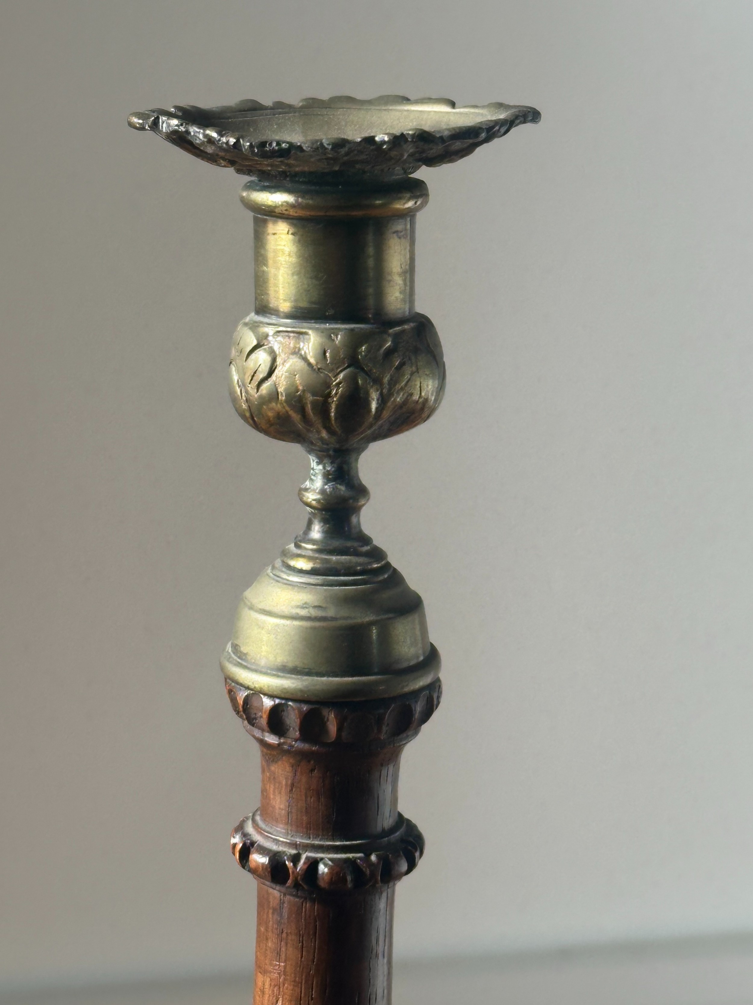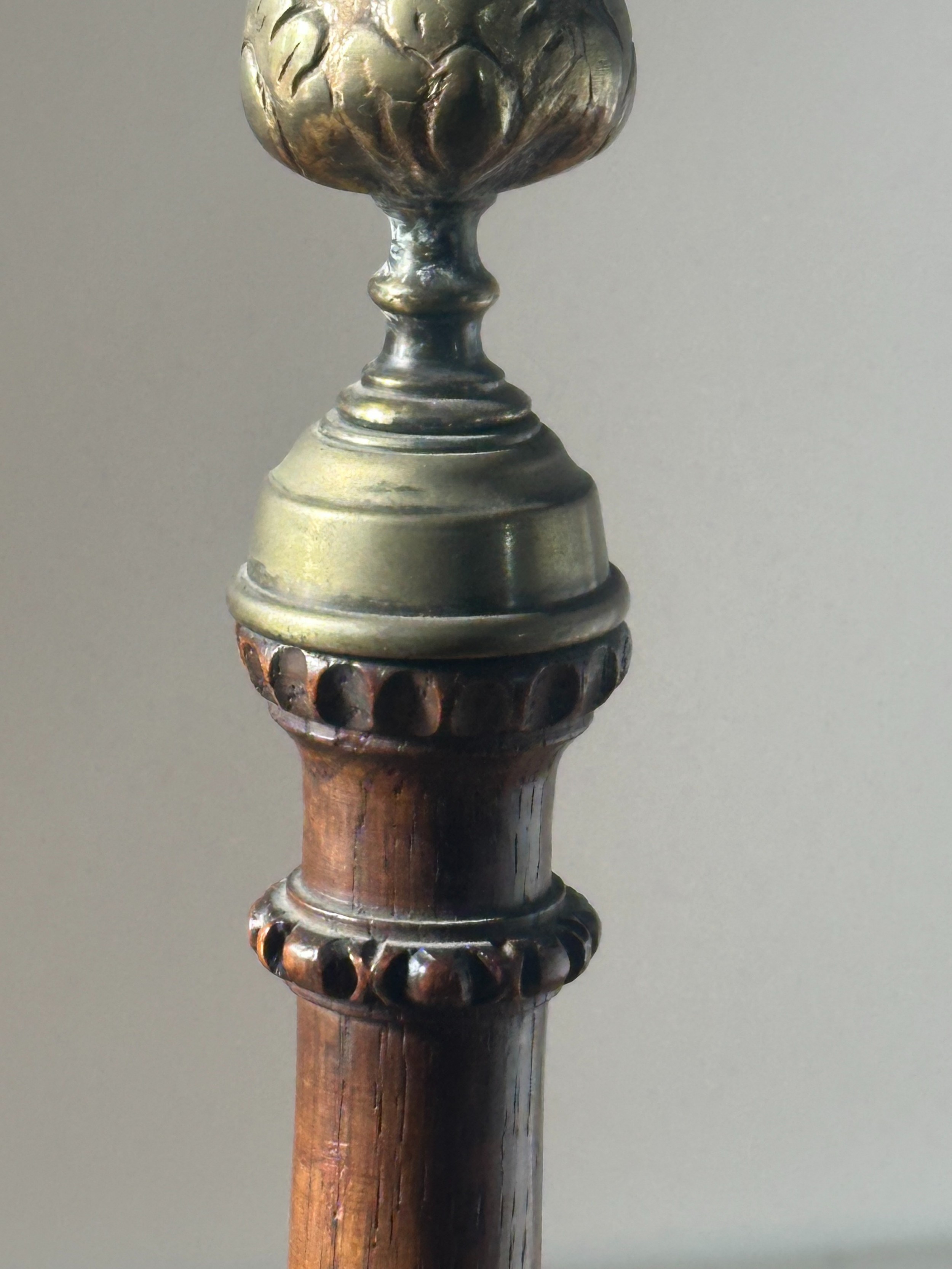 - Design: Gedrehter Schaft mit fein geschnitzter Basis und dekorativen Messingelementen