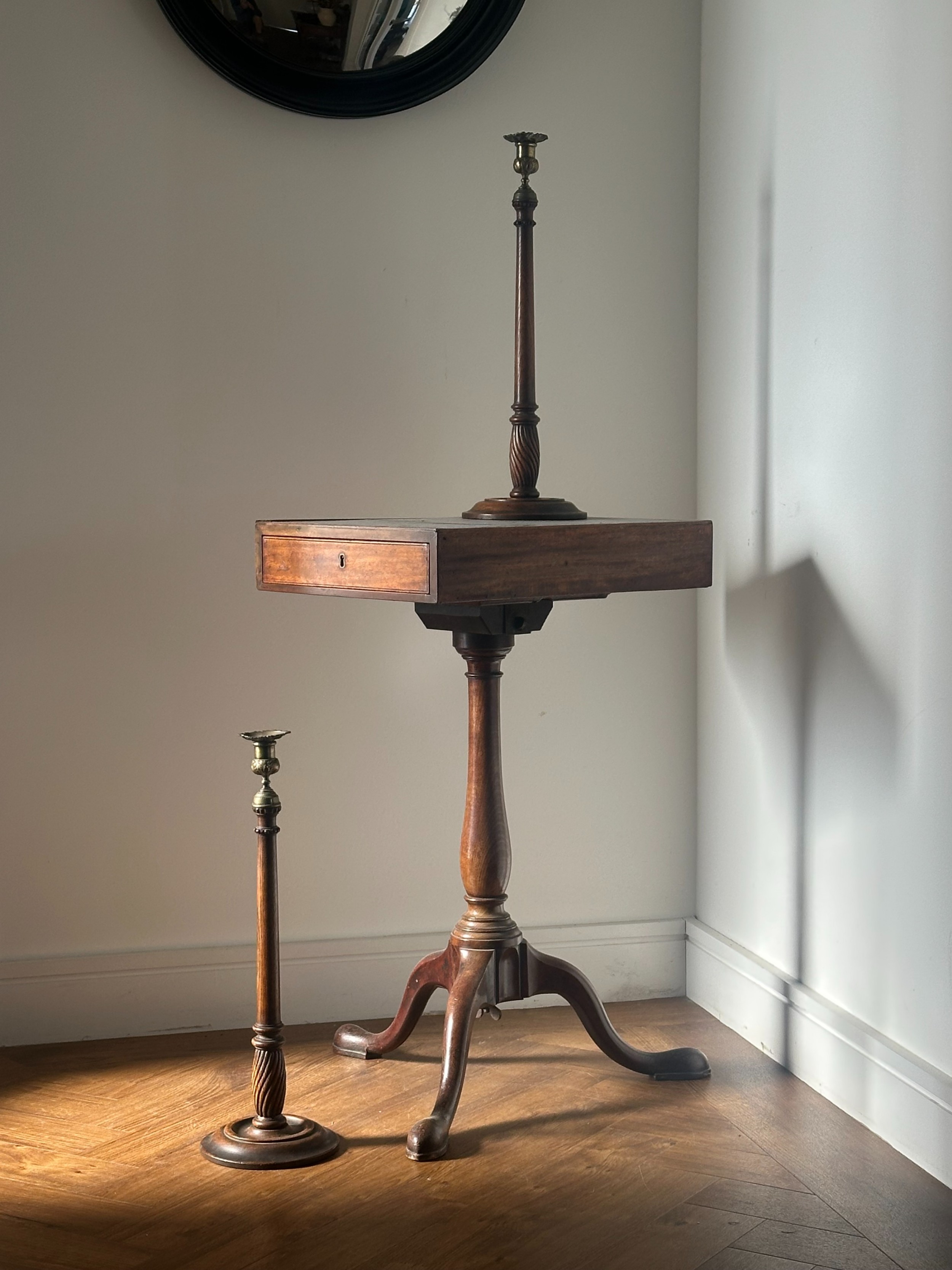 Die Messingaufsätze (Sconces), möglicherweise aus dem 18. Jahrhundert, ergänzen das dunkle Holz perfekt und verleihen den Stücken eine edle, theatralische Ausstrahlung.